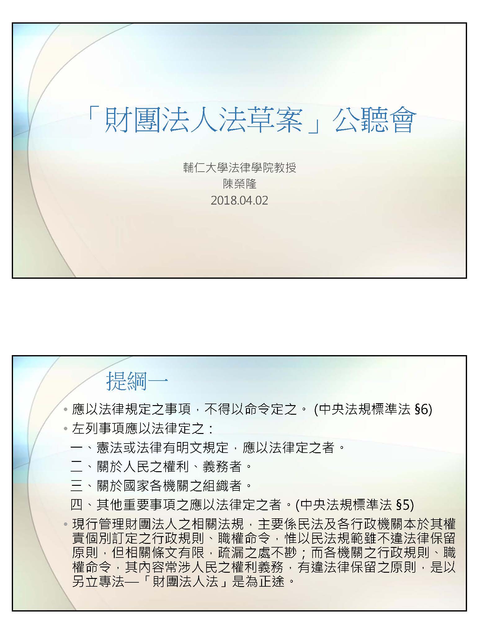 陳榮隆教授:主席、各位委員。今天非常榮幸能夠來參加這個公聽會。財團法人法制的完成是各方期待甚久的事情,在還沒有完成立法之前,以往都是靠民法的基本規範,然後就是由目的事業主管機關透過相關的行政規則或職權命令來做一些規定。但是在一個法治國家中,哪些應該用法律規定,哪些應該用憲法規定,哪些可以用職權命令來規範,是有一定規定的。對於這個部分,我國主要是規定在中央法規標準法當中。根據中央法規標準法的規定,應以法律規定之事項,不得以命令為之,而應以法律規定之事項包括有關人民之權利、義務。