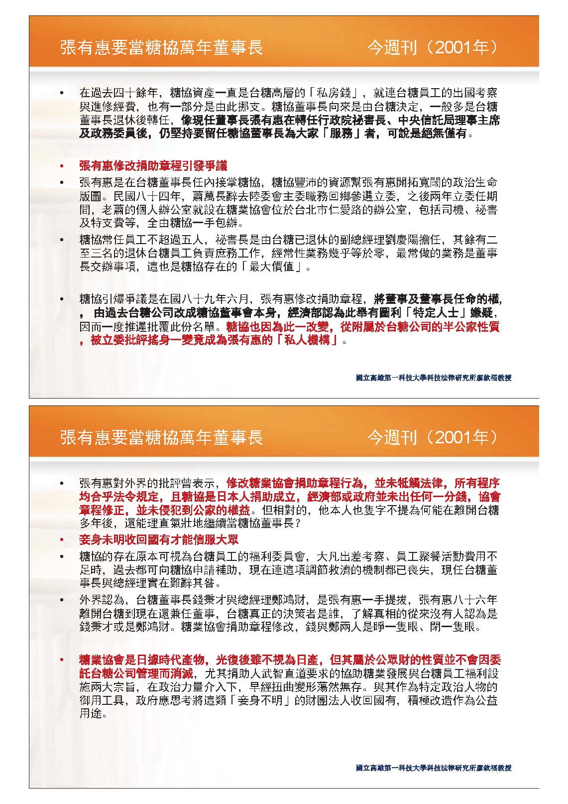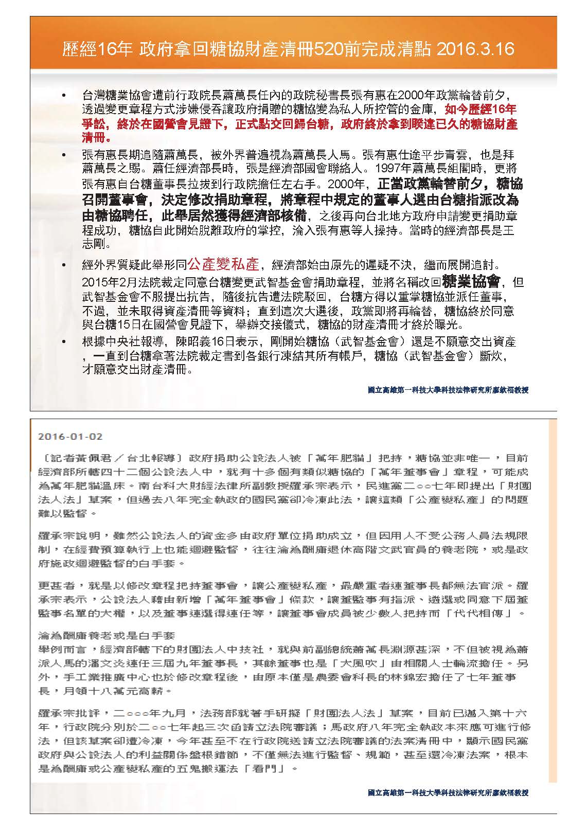這部分各位可以理解,政府其實花了非常多的時間想要把它要回來,為什麼要這樣講?是因為光復後雖然我們不把它當成日產,但是這部分被認為公共財的性質並沒有改變,這是我想舉的第一個例子給大家參考。從2000年政黨輪替前,糖協召開董事會修改捐助章程的決定,居然獲得經濟部核備;爾後,政府開始追討所謂的「公產變私產」的部分,之後大概經歷了16年後,一直到2015年時才由法院裁定同意台糖變更基金會的捐助章程,並將名稱改回糖業協會。