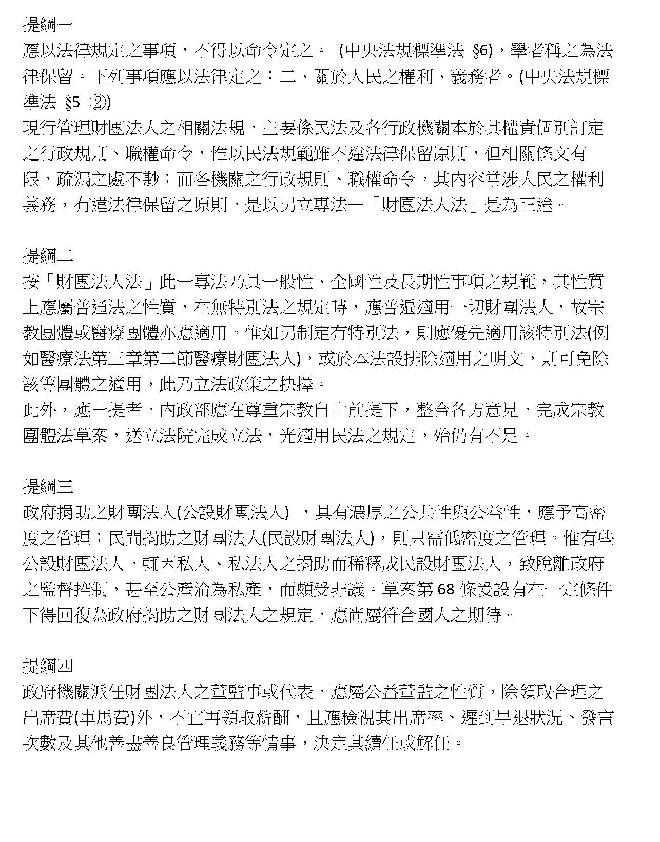 有關財團法人法草案,我認為第六十四條、第六十五條、第六十六條等條文並未違反中央法規標準法或憲法,因為財團法人無論是受政府或民間捐助成立,捐助人一般而言都享有抵稅或免稅的獎勵,甚至在租稅優惠或抵稅、免稅的基礎上,有時也會公開募款。不管私人設立或公家設立,公開募款程序即代表政府對社會公益有實質介入的權力來源,何況是由政府捐助的財團法人,更應該列入管制或監督的範圍。因此,對於政府機構實質介入監督,我認為具有正當性的基礎。至於有些財團法人未來的財產歸屬,或是財團法人彼此之間的合併,則應該避免有交易行為,這點滿重要的,譬如私立學校與私立學校合併、財團法人與私立學校合併、財團法人與財團法人合併時,都要防止其中有交易的行為,我是比較偏重這方面的體制來跟大家請教。