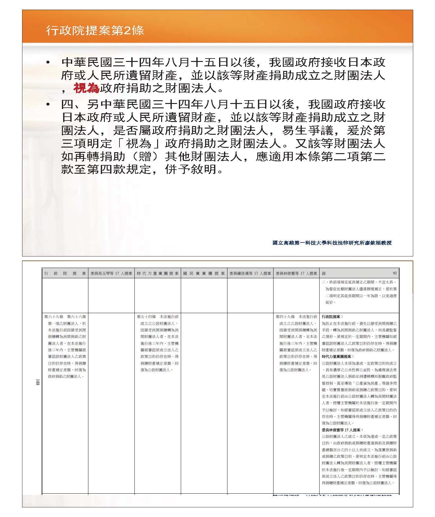 至於相關的草案版本,我很快地表達一下我的看法,對於有爭議的部分,行政院提案認為如果是日本留下來的部分應「視為」政府捐助,對此我持比較肯定的意見,因為這個部分從財產的角度來看應該是國產,只是這個條文在立法時可能可以再做一些更為細緻的規定。我對這一塊敬表贊成,因為這樣比較有可能把這些東西拿回來。其次是剛剛也有提到,如果要把它回復的話是不是「得捐贈」,我覺得這一塊將來在條文上也應該做比較細膩的規定。