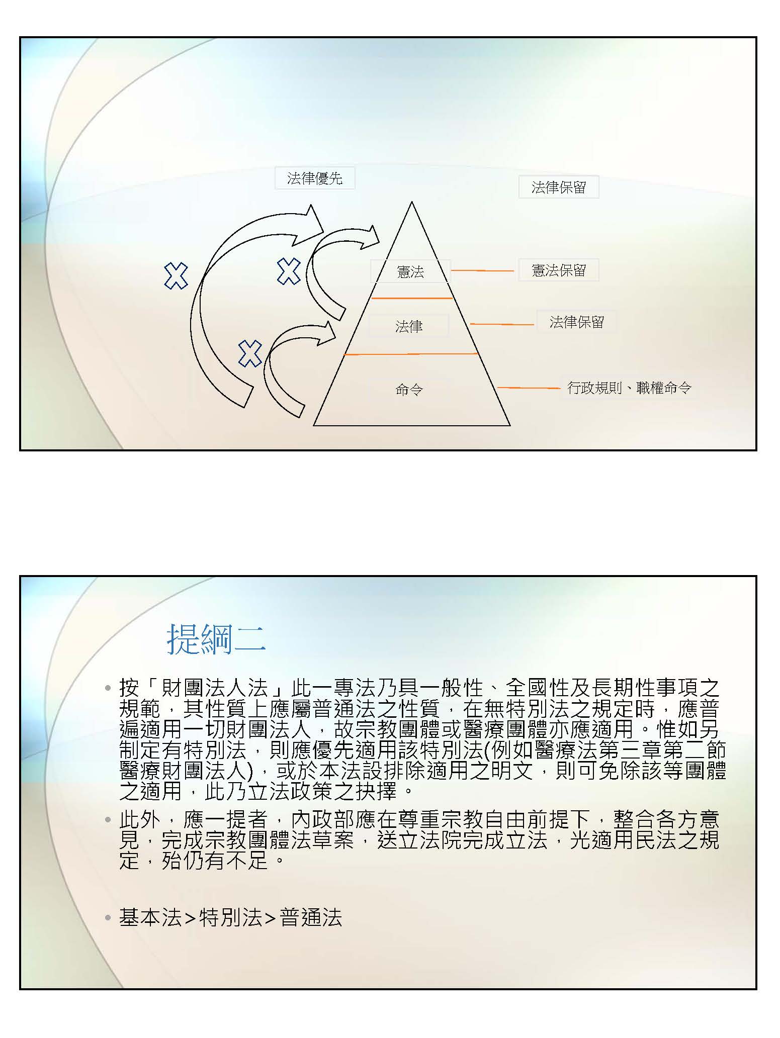 第二個提綱問的是宗教團體或醫療團體到底適不適用財團法人法。以法律位階而言,法律可分為基本法、特別法和普通法三個位階,基本法大概就是在那個領域裡面經常被稱為「憲法」的,比方說經濟憲法、居住憲法、消費憲法、勞工憲法。這種基本法的用語源自德國,國內現在也開始採用,也就是說,這些是最基本、最基本的規範,其他法律的規定一定只能比它更高、保護更周延,而不能比它的保護更低。比方勞動基準法就是我們的勞動憲法,它對勞工的保障屬於最基本的部分。