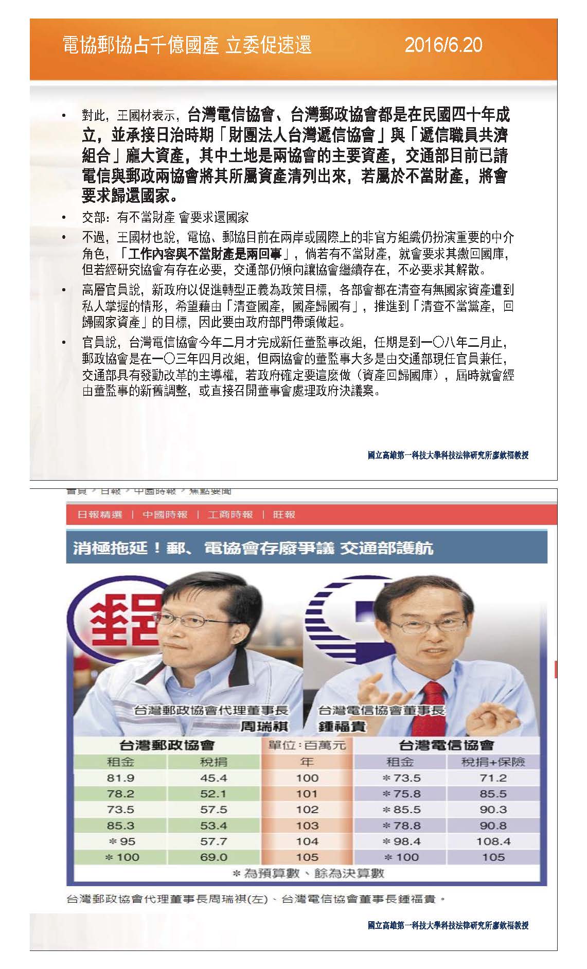 此外,在民國47年的時候,最高行政法院也認定這完全是屬於私人的產業,這是最高行政法院的見解;在民國46年的時候,當時的省政府也明確發文承認這是一個私人的產業,而且很重要的是,因為當時的郵局或其他地方來跟郵政協會租了相關的辦公廳,因此要支付相關的租金,試問,當時如果不是這樣的考量,為什麼要去付這樣的租金呢?況且在民國46年的時候,政府有全面去清查,因為這個租金的問題就會考量這個財產是不是屬於敵偽的財產,還是屬於政府所接收的財產?當時已經做過考量了,民國46年台灣省政府的函以及最高行政法院的判決分別認定這是屬於私人產業,因此後續就繼續由政府去承租、去繳費,而且這是非常便宜的,比一般的租金還便宜,所以總結來說,當時政府是利用這樣的好處,現在在修法時,反而把它視為政府財產,事實上,這對當時被扣收的會員來說是一個不公平的事情,以上簡短的報告,謝謝!