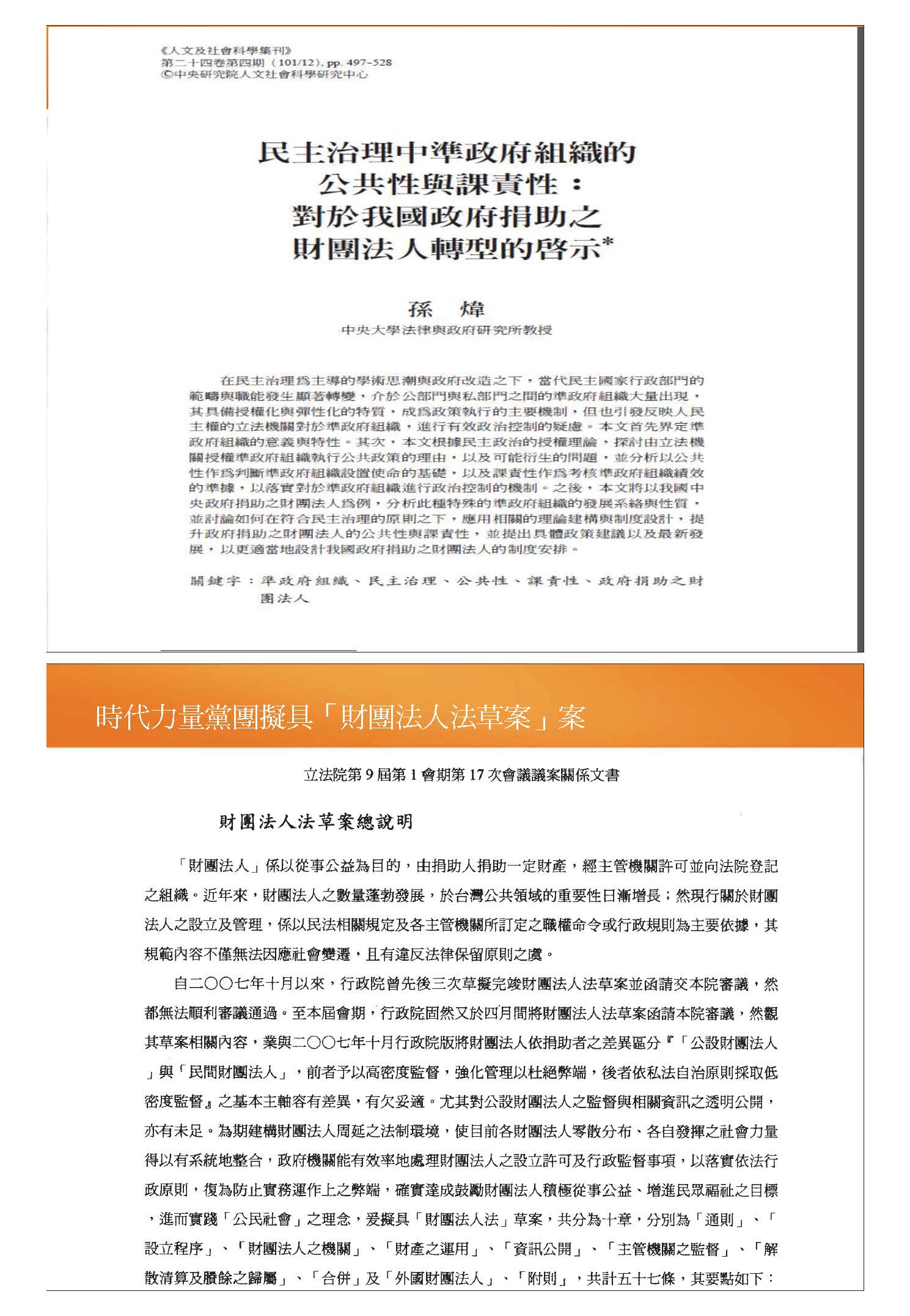 其次,財團法人本身具有公共性及公益性,理論上屬於非營利之第三部門,我們沿襲德國、日本或瑞士的立法例,將其稱為「財團法人」,若在美國,則是屬於基金會的體制。為彌補政府部門和營利部門的不足,財團法人不管是由民間捐助或政府捐助,都不應脫離公共性和公益性的性質與天職。雖然這次立法有其急迫性,但我認為無論董監事變更、政黨輪替或其他因素,各財團法人都不應失去其設立目的和創辦宗旨,也就是不應該脫離原來的、最基本的要件,而這就是我一再呼籲的,它的核心價值是公共性和公益性。