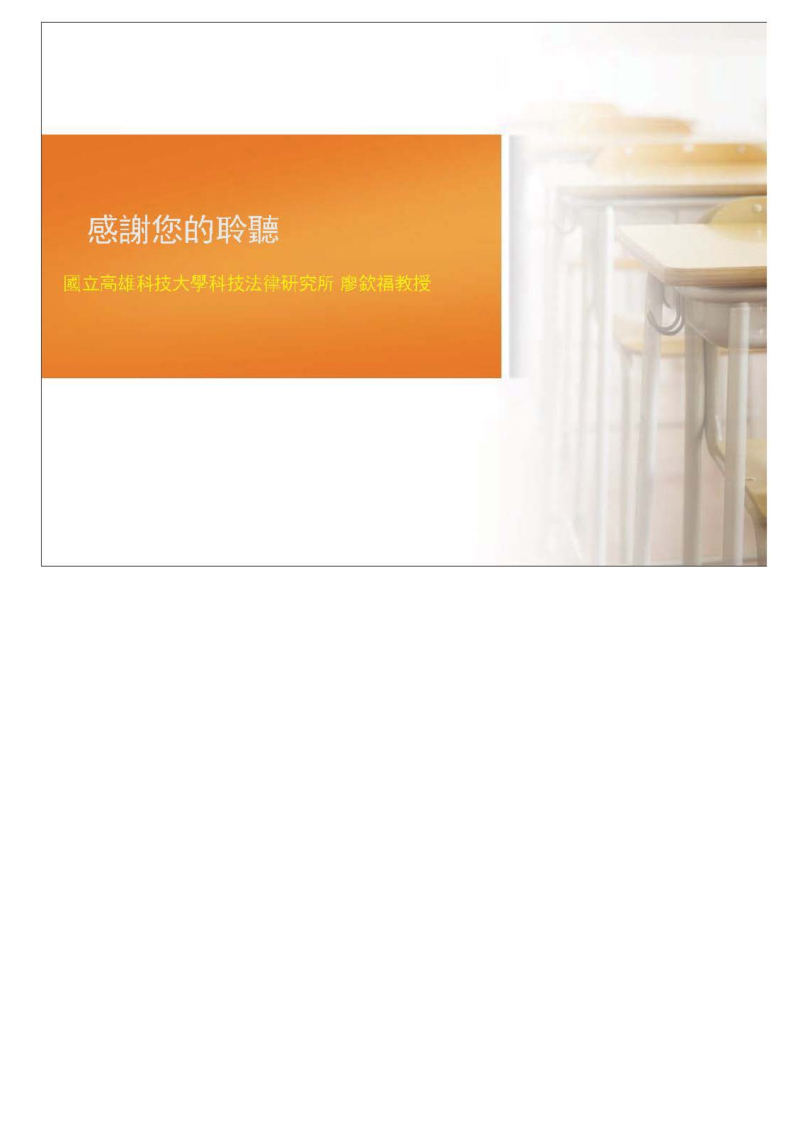 現在依照登記的順序,首先請國立高雄科技大學科技法律研究所廖欽福教授發言。
