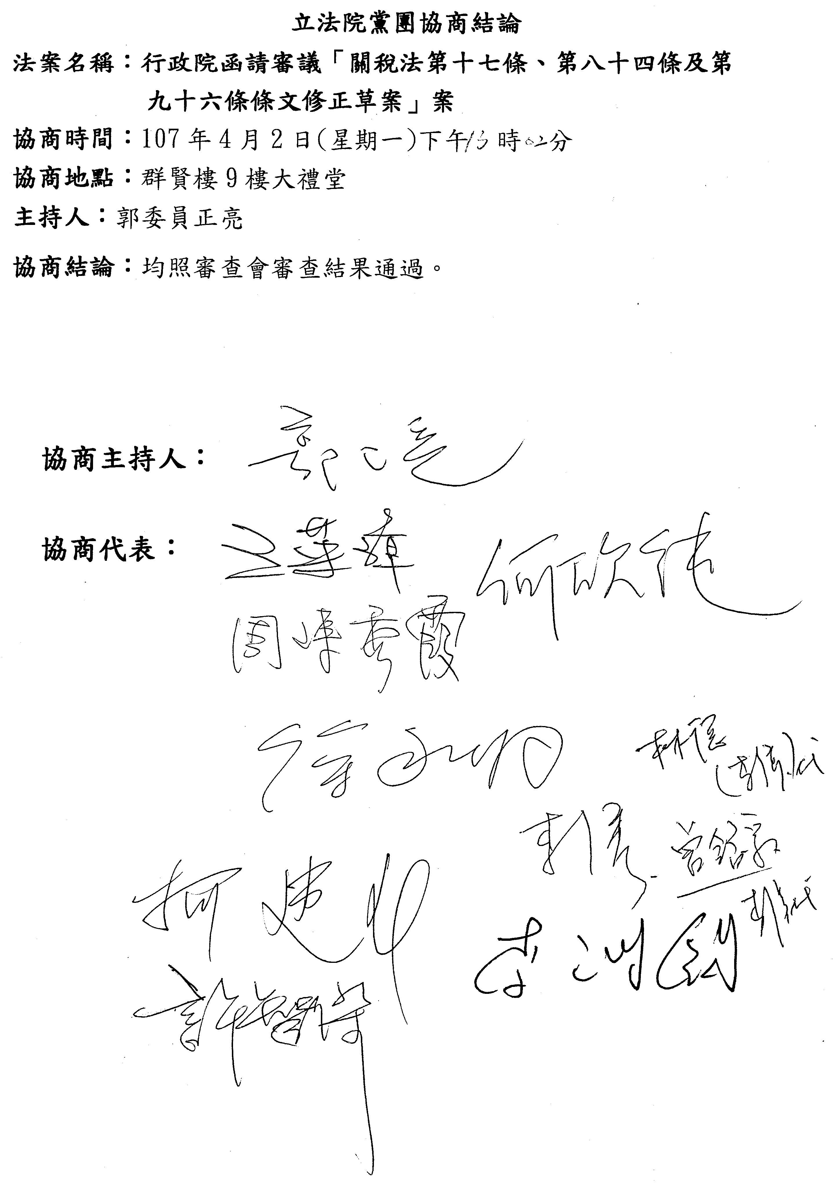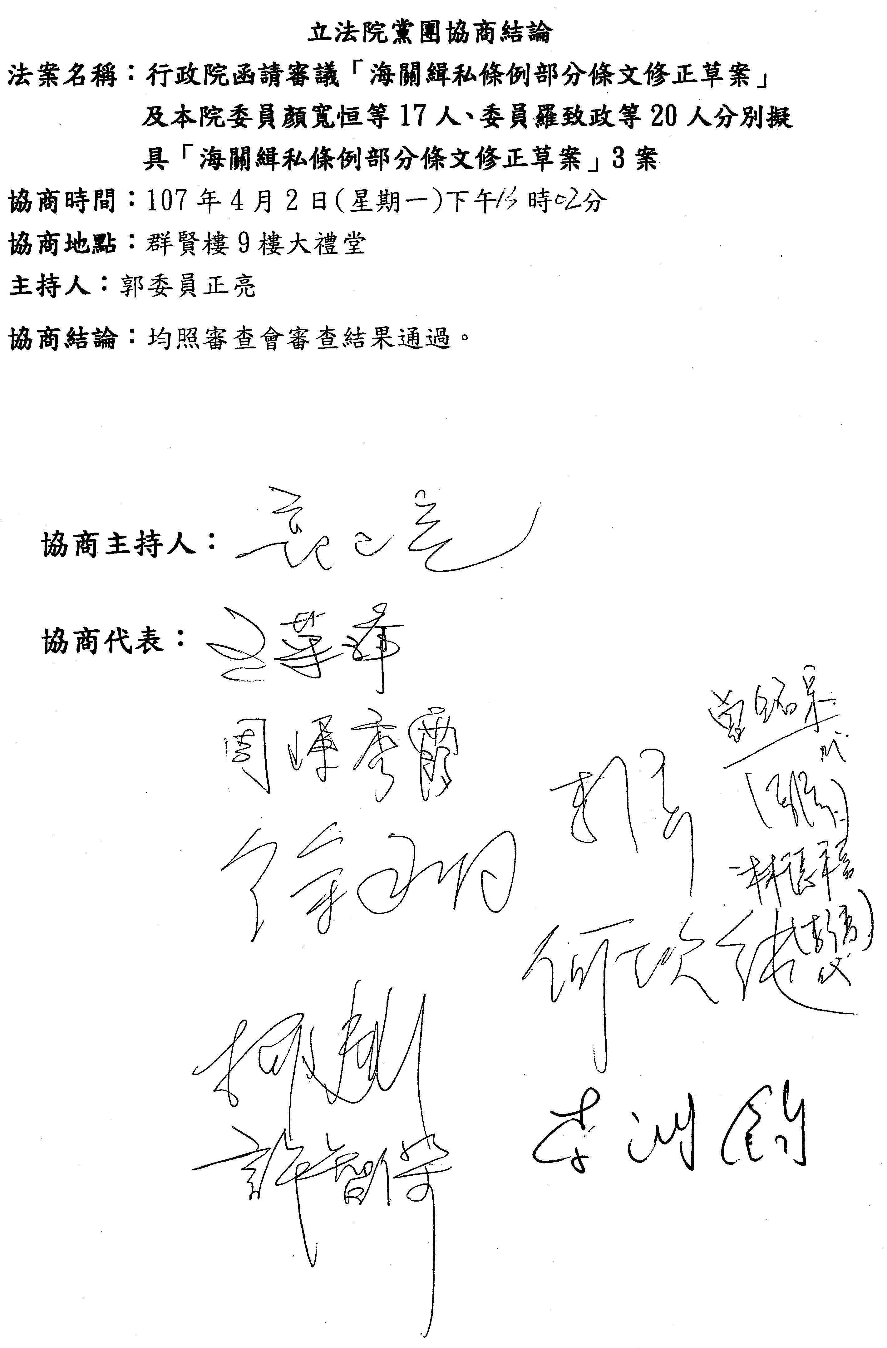 立院黨團的協商結論如下:一、行政院函請審議「關稅法第十七條、第八十四條及第九十六條條文修正草案」,協商結論是照審查會審查結果通過;二、行政院函請審議、本院委員顏寬恒等17人及委員羅致政等20人分別擬具「海關緝私條例部分條文修正草案」三案,協商結論也是均照審查會審查結果通過。