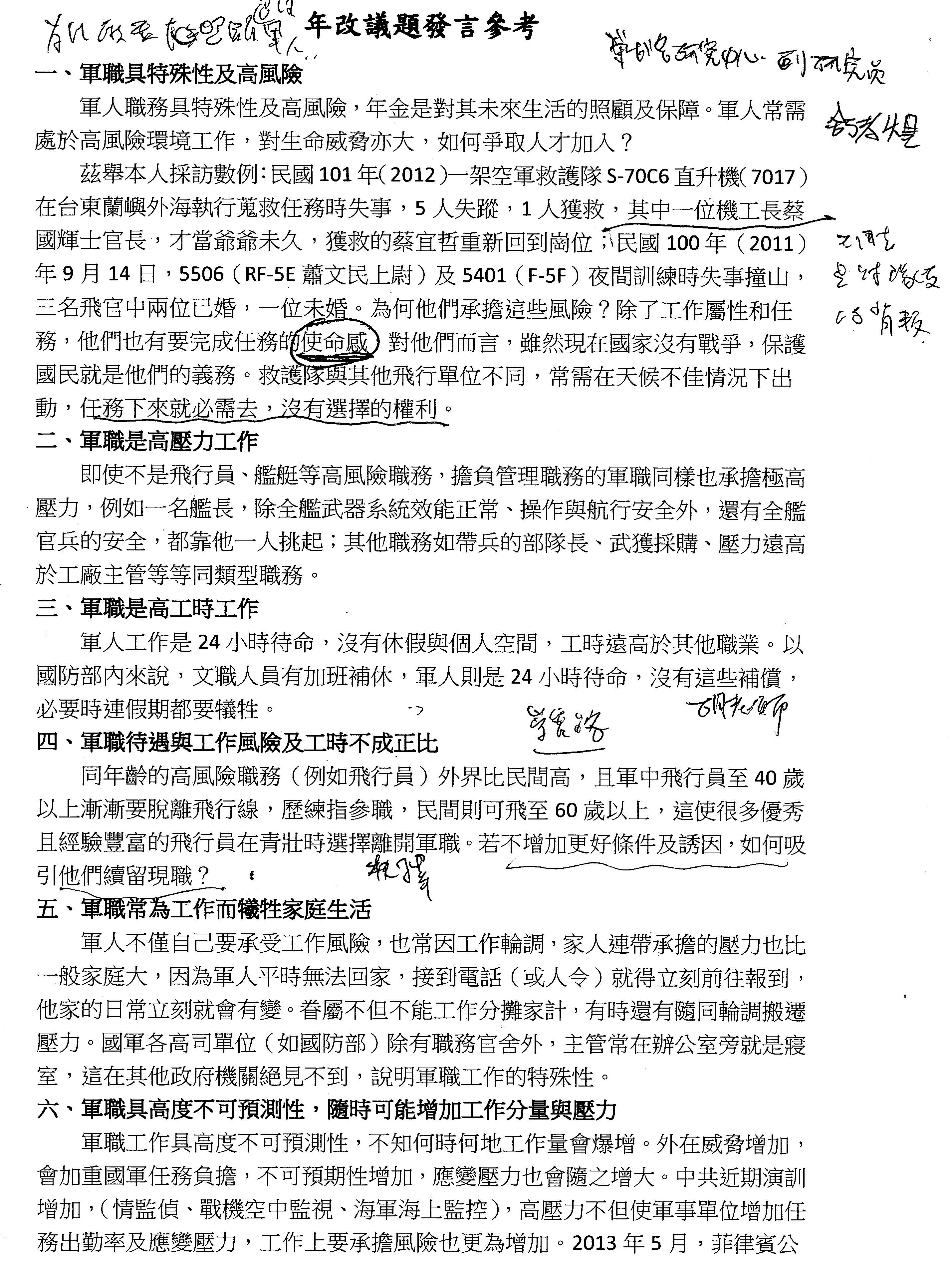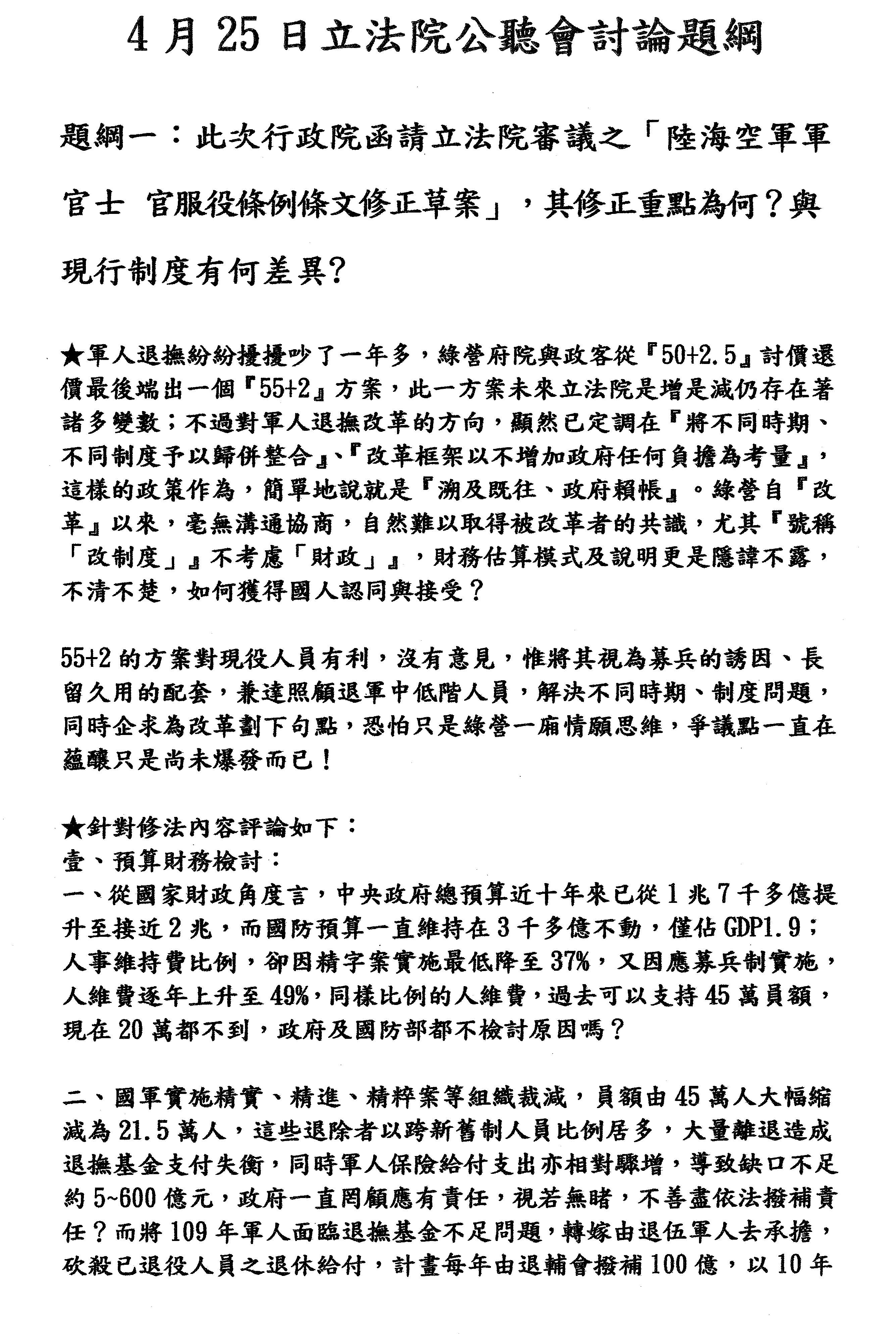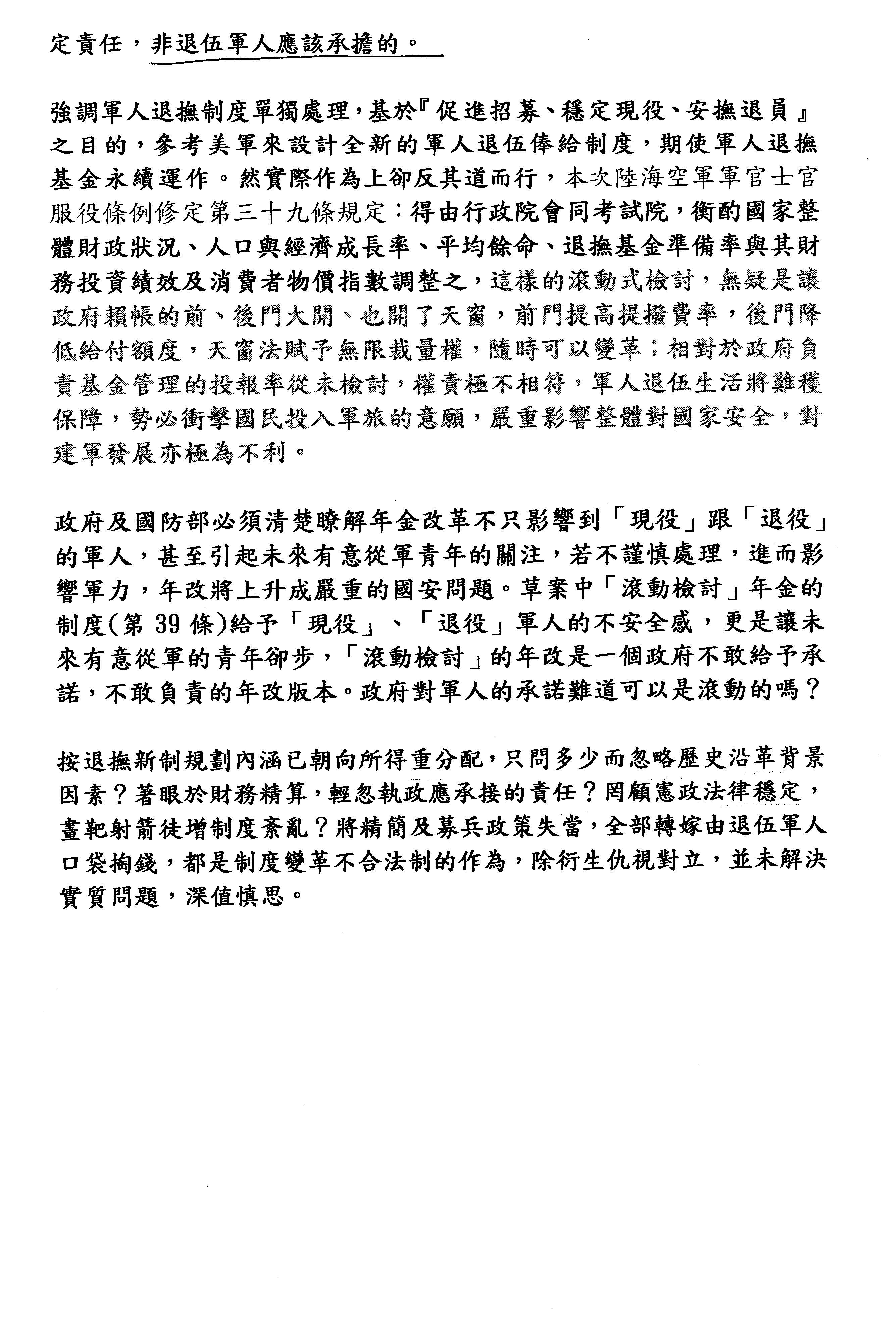 首先第一個就是大家很關心的信賴保護跟不溯既往的問題,也就是今日討論提綱第三項特別指出的,此次年金改革是否符合大法官會議第717號解釋的意旨?第二個不是反改革,而真的是尊嚴的問題。第三個,軍人年金改革因為其職業的特殊性,所以要有別於公教。第四個是以少尉官階作為最低保障。第五個,軍人的特性是離退得早,應給予較高的俸給;另外優存的利息應該要緩和的調降,這些意見都會在相關的服役條例中反映出來。