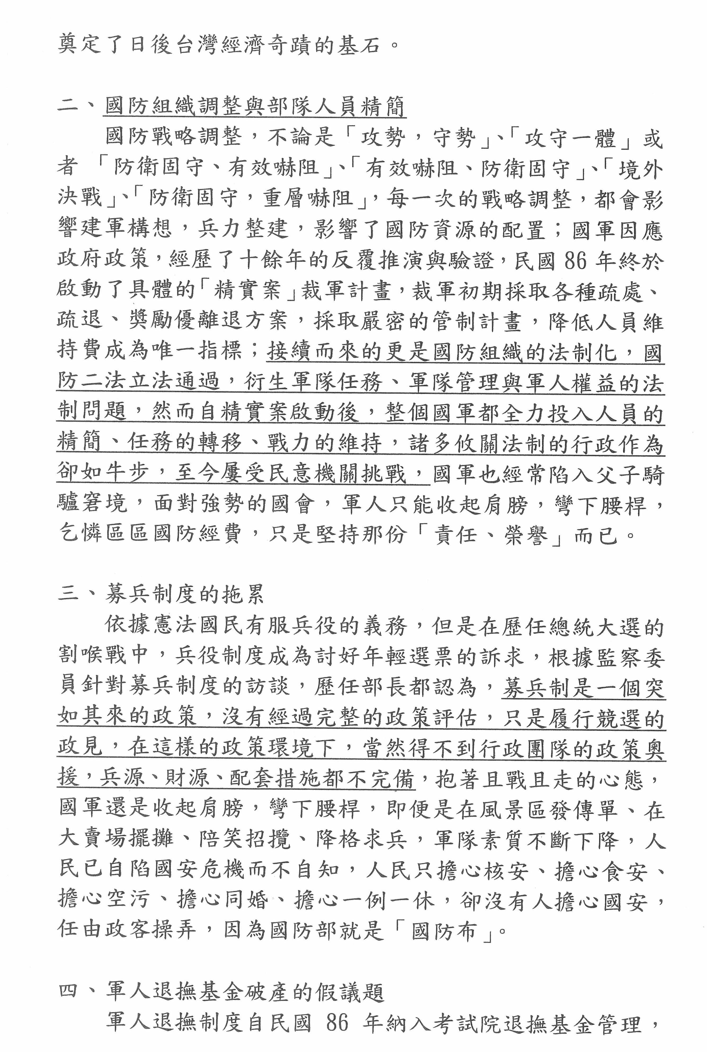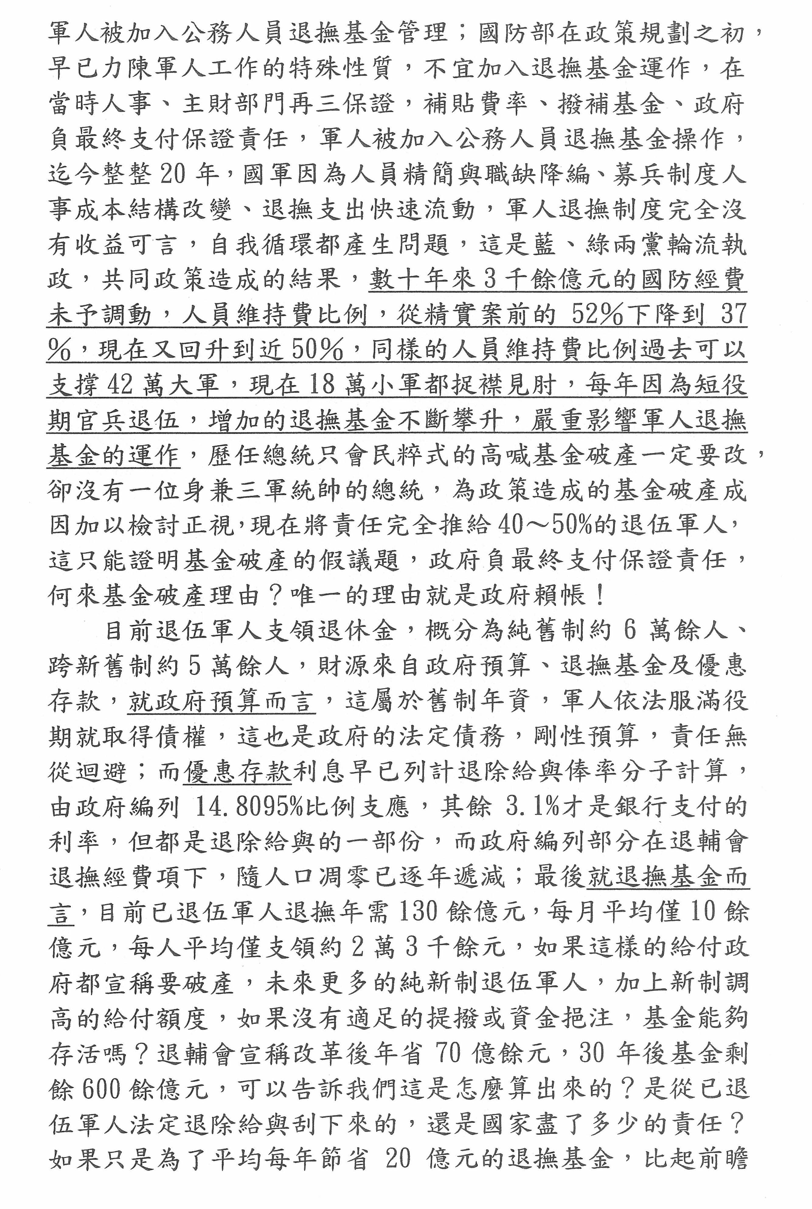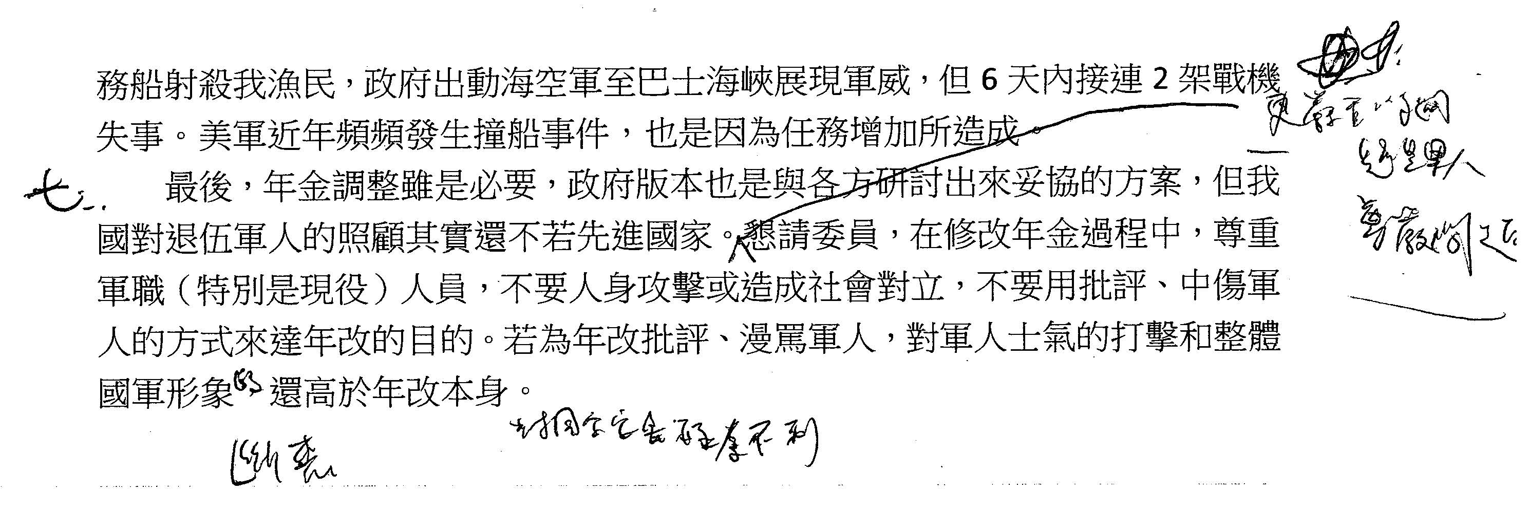 另外,我也特別強調根據我們的觀察及分析,中共近來也針對我們軍人年金改革的問題,藉由網路社群媒體的操作,在台灣內部製造各種爭論、不同的意見及爭端,因此我在此很懇切希望,不論最後軍人年金改革方案修法的版本如何,希望各界能夠達成一個共識,就是儘快讓它完成,塵埃落定,避免給予中共見縫插針、操弄輿論、製造台灣內部分化及對立的機會。否則,這個議題拖得愈久,愈給予中共可趁之機,愈讓他們操作議題來分化我們國軍的軍心及士氣。最後,我在網路社群媒體上看到一些討論,有人認為我們退伍軍人的待遇不如中共,但我只強調一點,中共直到今年上個月才宣布成立退伍軍人事務部,而我們的退輔會存在已久,但就政府主管機關何時成立的部分就可以印證究竟中共過去有沒有照顧退伍軍人!我想我言至於此,謝謝。