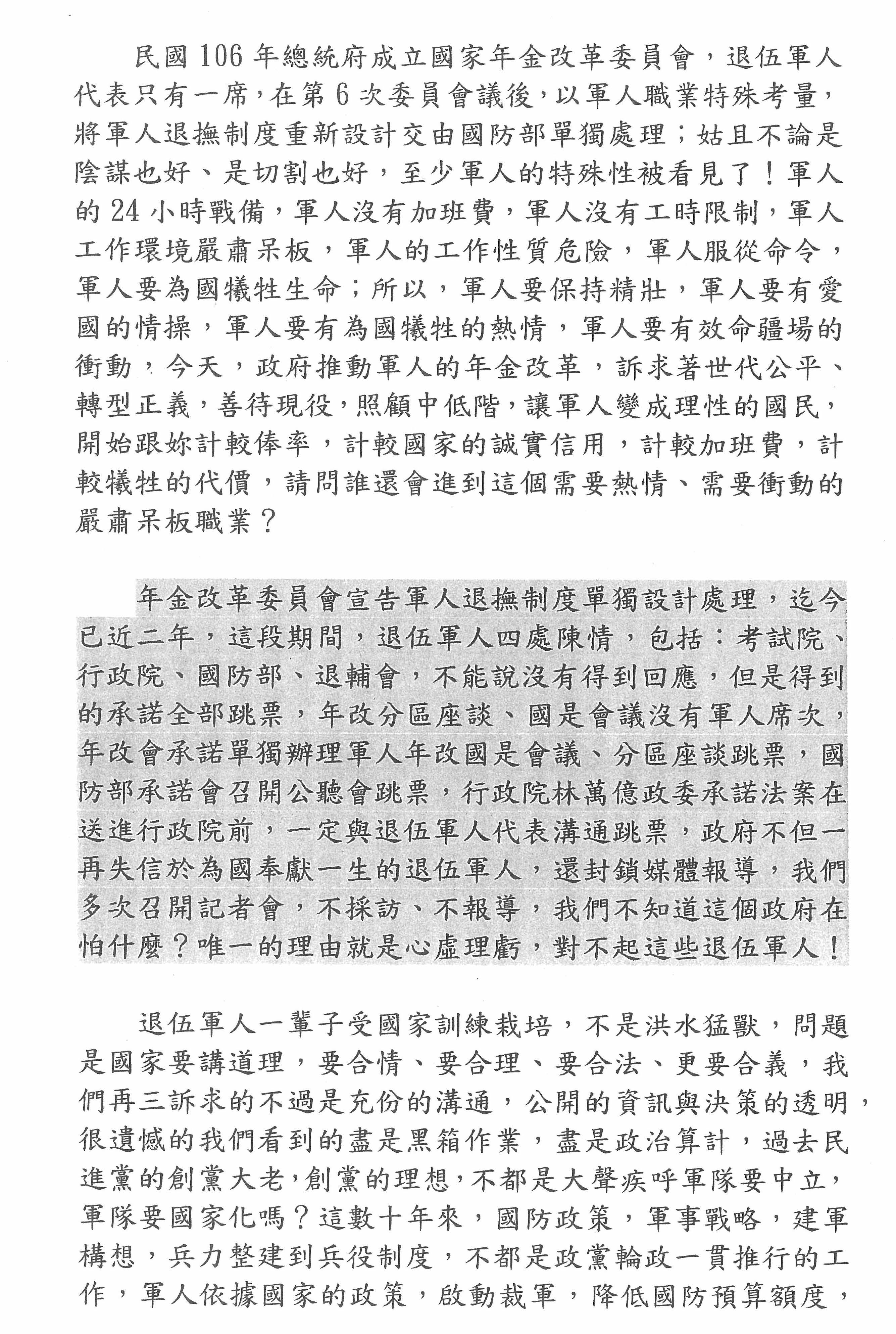 因為時間的關係,我不想耽誤到後面的發言,我最後要表達的心聲是:在過去這兩年中,年改會、國防部、退輔會以及退撫金的團體,完全沒有做好溝通,只是一開始就冠上反改革的名義來污衊我們,來打壓我們,來消滅我們的聲音,但是我們要的只是一個公理正義,我們要的只是為退伍老兵爭取過去保家衛國的基本尊嚴。所以我在這裡要再一次向全國民眾呼籲,如果再繼續打壓軍公教,下一個被打壓的可能是勞工,更可能是在電視機前的每一個人!如果這次年改無法充分瞭解退伍軍人心聲,再繼續恣意妄為,推行年改,那麼我在這裡宣示,這場陳抗將永無止休,直到公理正義被喚回為止!謝謝。