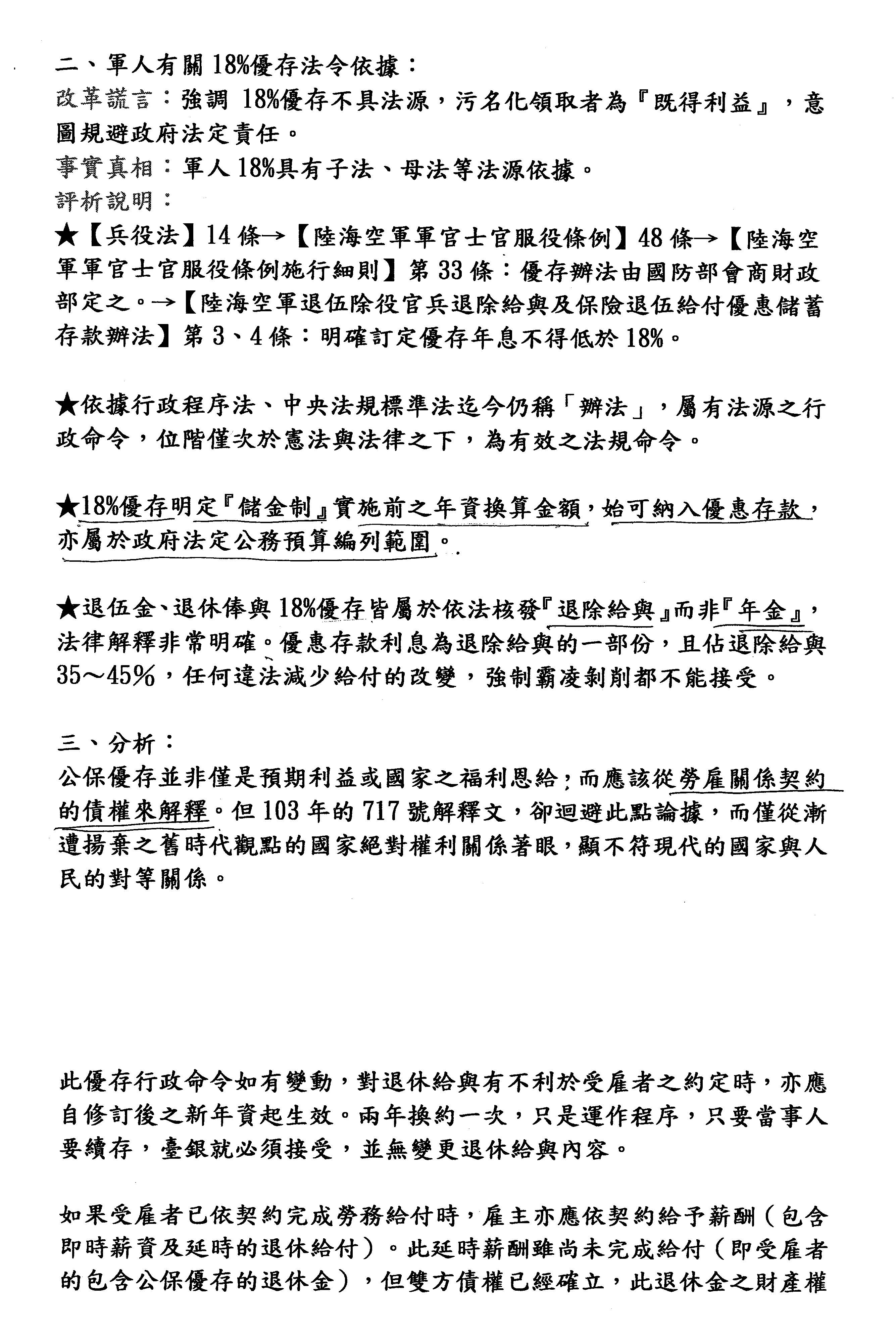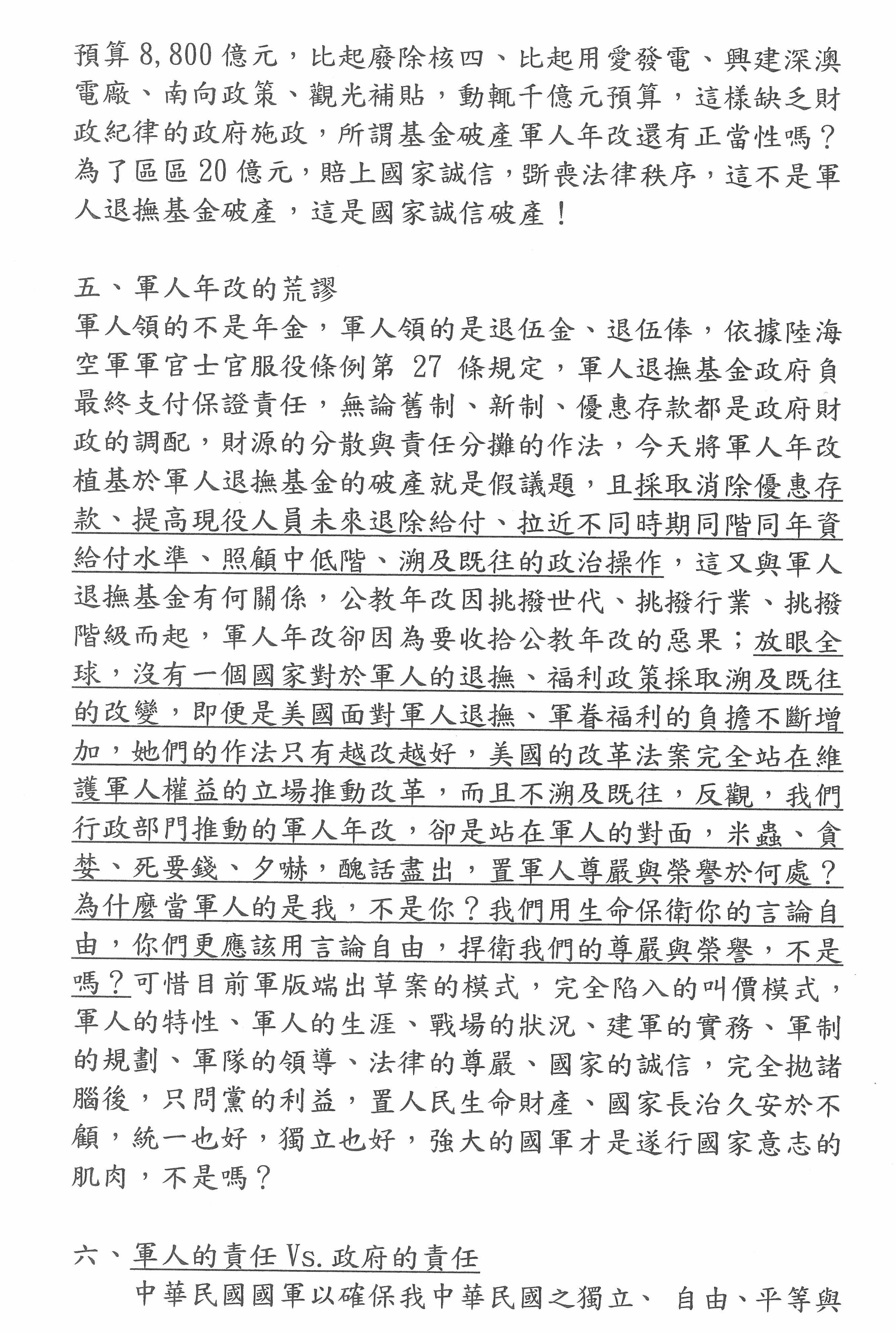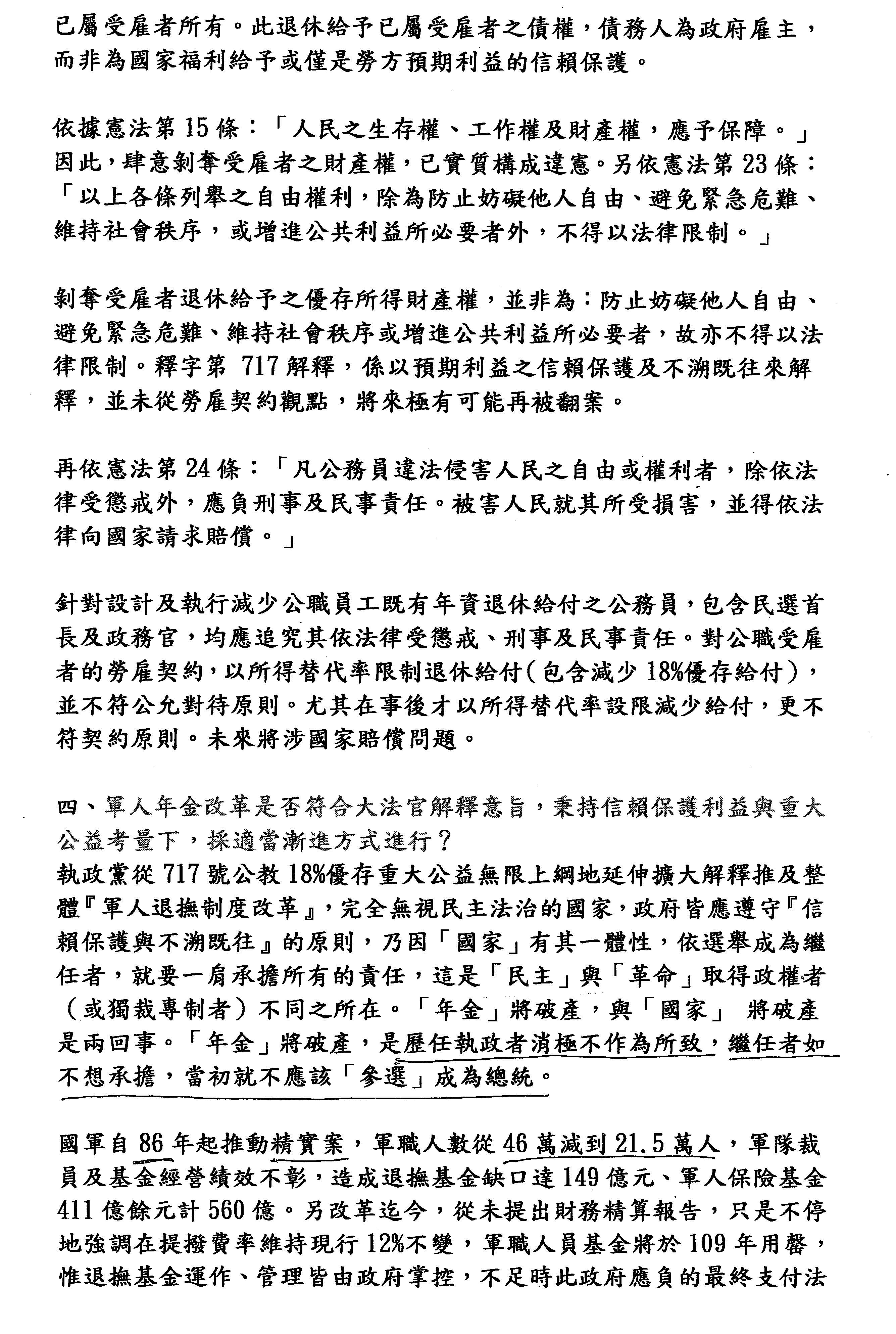2.軍人入伍就已和政府定下了生命契約,退伍時契約已完成,政府怎可帶頭毀約、背信。這是民主法治的基本原則,不是談刪減多少的問題。