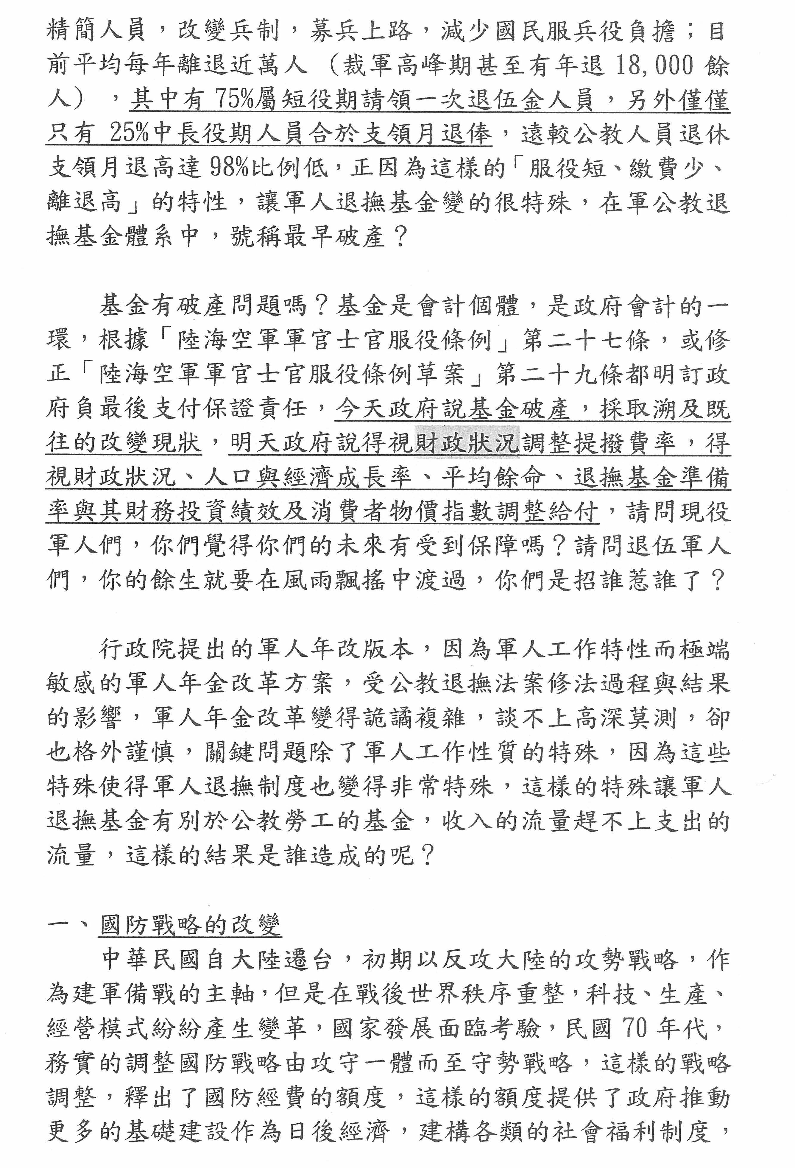 但我也向大家報告,我是文人,退休時沒有辦法領到像軍人的退休俸,依據我所適用的退休規定是支領國立大學教授的退休俸。我們知道在去年的年金改革中教職人員退休俸所刪減的比例相當高,當然對個人而言,我們也覺得權益不如以往,但因為我們同時瞭解到整體國家政府財政困難,所以都能接受。我任職於國防大學,我一再強調作為教學的老師可以接受刪減我們的權益以顧全全局,但要確保軍人的尊嚴及權益。因為我作為一個國立大學教師,又在軍方系統工作,深刻瞭解軍人的付出,尤其當我的學生全年無休地24小時在台海的海面、台海的上空、在台灣的高山峻嶺中長期戒備,他們在太太生產時沒有辦法趕到醫院陪伴,逢年過節也沒有辦法回家陪伴家人。因此我一再強調年金改革一定要確保軍人的權益,但確保的前提必須是在政府財政支出最大限度能夠支持的情況下來保障其權益。在目前整體的國家財政面臨很大困難的情況下,我想這次行政院提出的版本應該是在不同的版本中以最大限度來照顧軍人權益。