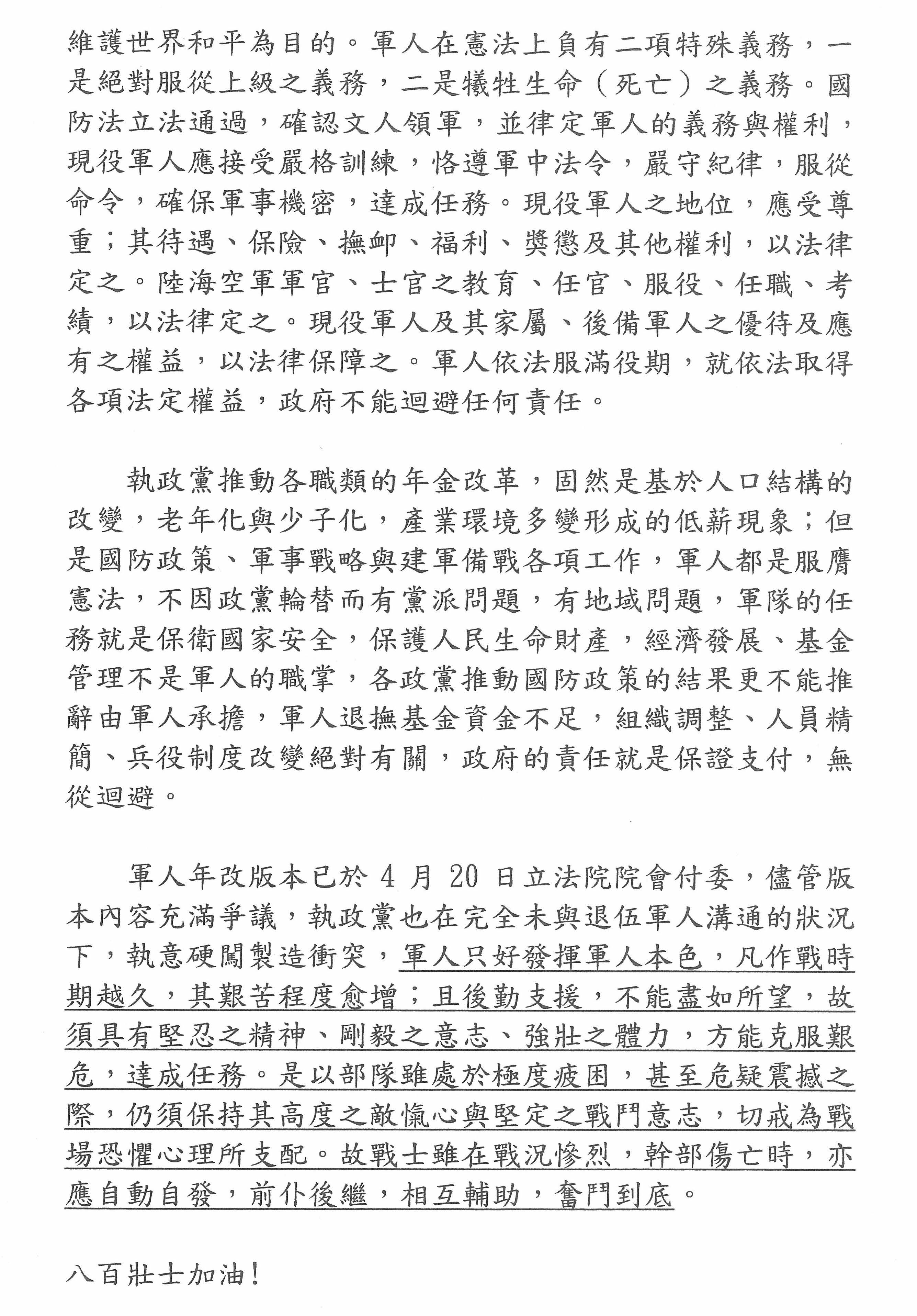 第二,昨天、前天退警在街頭爭取公平正義,我們的新聞媒體朋友們說,軍警都一樣危險,為什麼軍人比較好?誣衊!這就是誣衊、抹黑、分化!退休的警察和退休的教師不會在乎軍人到底拿了多少,他們跟我們永遠都是一家人,他們要的只是一個公平正義,沒有多與少的問題,我在這裡要先講清楚,我們不要一昧的追求這種分化的言論。
