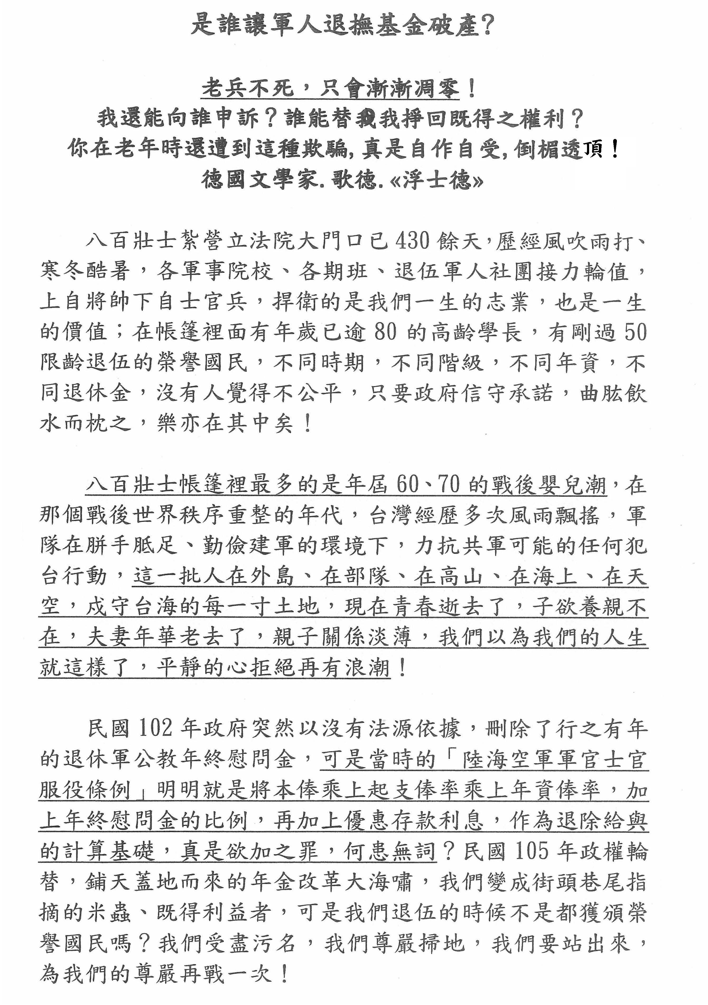 蔡政府不只一次強調年金改革決不會讓人活不下去。我們蔡總統自幼養尊處優不知人間疾苦,尚值得諒解,但用了一位完全沒有法治觀念與不了解軍人生態的林萬億來做軍人年金改革就不值得原諒了;更不值得原諒的是退輔會;退輔會的職責就是照顧退伍老兵,應該最了解軍人退伍面向的不同,原舊制所領取的退休俸給是國家的責任,要做年金改革,僅能就儲金制合約未滿的部分做出修改;而不是將86年前舊制惡意混為新制做出改革;除非是為求官位刻意討好執政當局,犧牲袍澤應有的權益。在未將會因改革而無法生活老兵完成照顧方案前,就草率地送出法案,難道是要等出了人命再用一張褒忠狀來粉飾太平嗎?