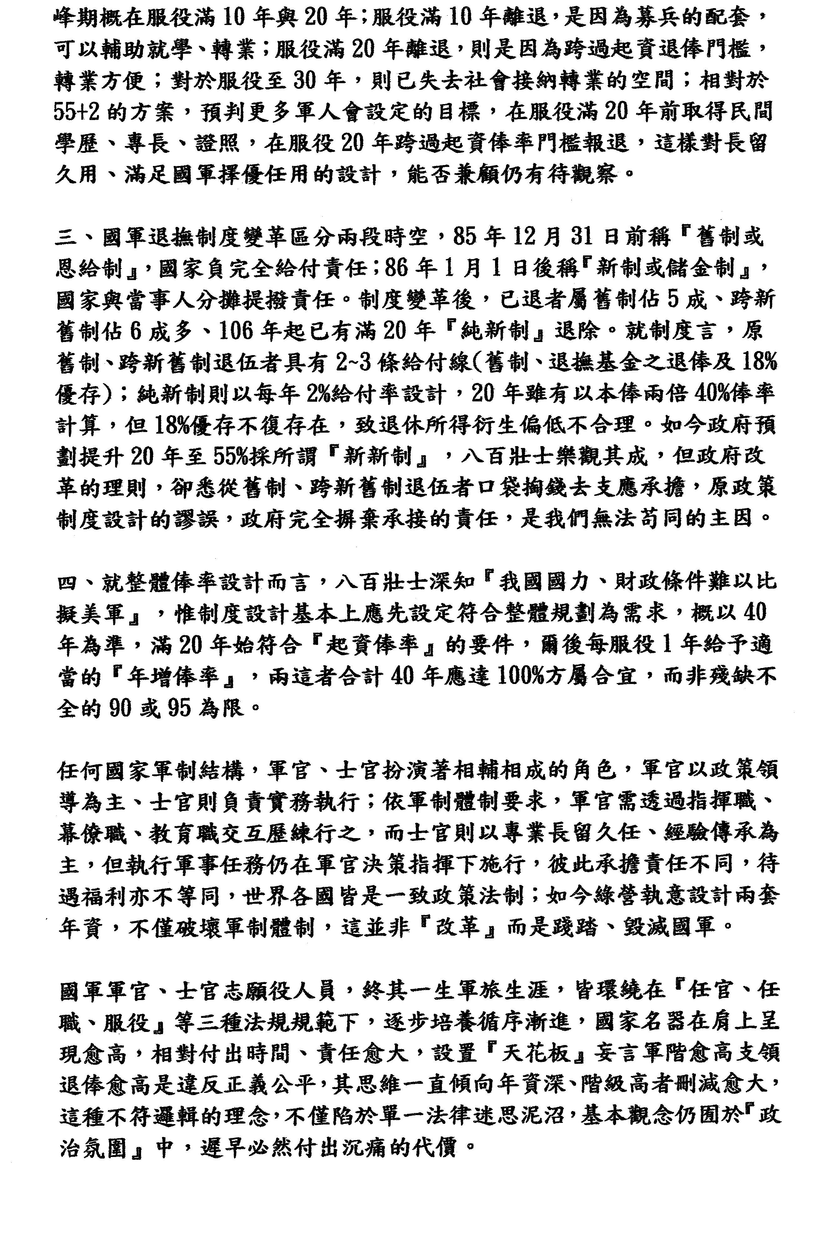 王忠義代表:主席、各位委員。我要針對這次行政院函請立法院審議的「陸海空軍軍官士官服役條例修正草案」修正重點及與現行制度之差異提出報告。軍人退撫紛紛擾擾吵了一年多,經過府院與政客從「50+2.5」討價還價最後端出一個「55+2」方案,此一方案未來在立法院是增是減仍存在著諸多變數,不過對軍人退撫改革的方向,顯然已定調在「將不同時期、不同制度予以歸併整合」、「改革框架以不增加政府任何負擔為考量」,這樣的政策作為,簡單地說就是「溯及既往、政府賴帳」。自「改革」以來到目前為止很少溝通管道,自然難以取得被改革者的共識,尤其「號稱『改制度』不考慮『財政』」,財務估算模式及說明更是隱諱不露、不清不楚,如何獲得國人認同與接受?