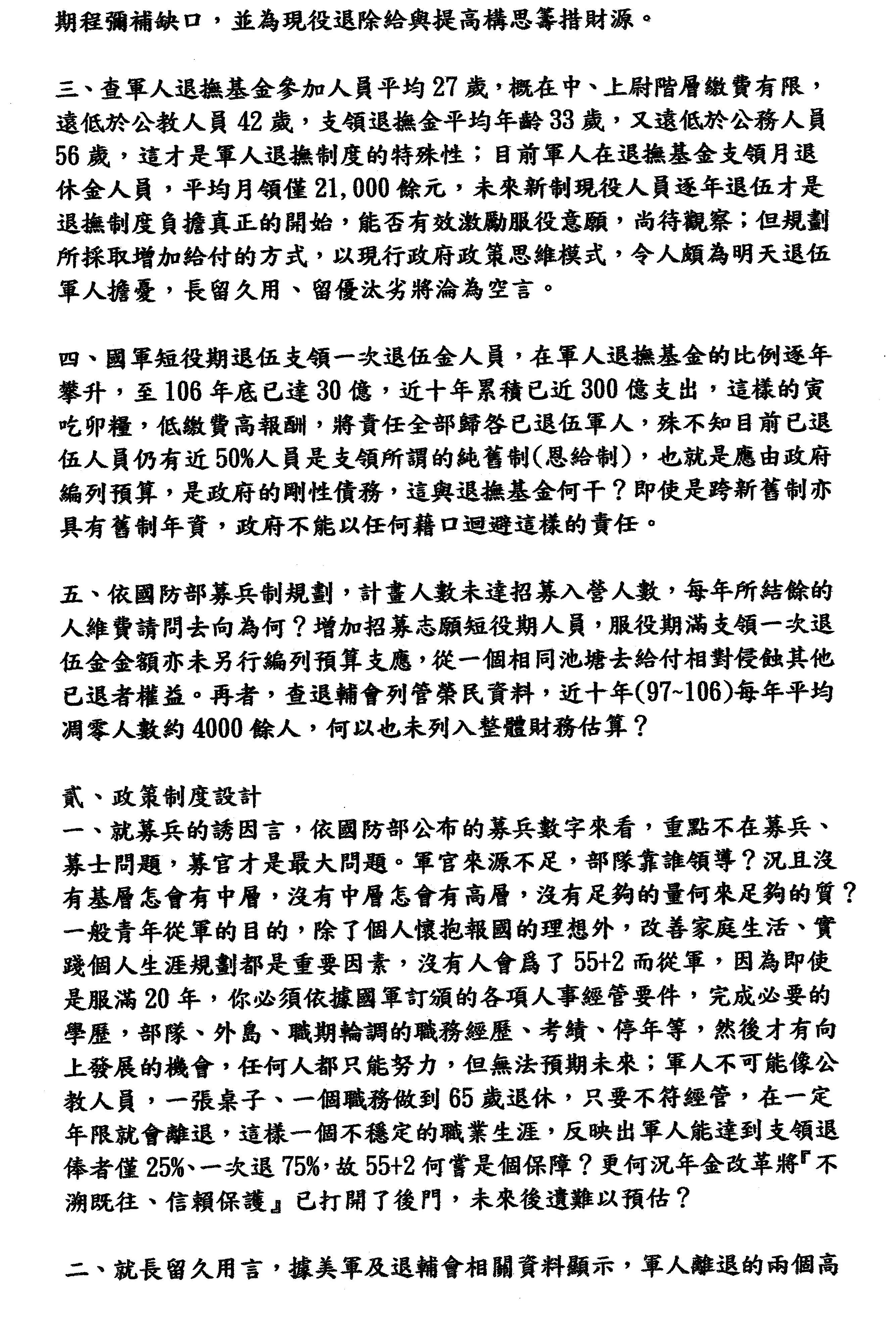 二、就長留久用言,據美軍及退輔會相關資料顯示,軍人離退的兩個高峰期概在服役滿10年與20年;服役滿10年離退,是因為募兵的配套,可以輔助就學、轉業;服役滿20年離退,則是因為跨過起支退俸門檻,轉業方便;對於服役至30年者,則已失去社會接納轉業的空間;相對於55+2的方案,預判更多軍人會設定的目標,在服役滿20年前取得民間學歷、專長、證照以後就直接報退,這樣對長留久用、滿足國軍擇優任用的設計,能否兼顧仍有待觀察。因為時間的關係,我就報告到此。