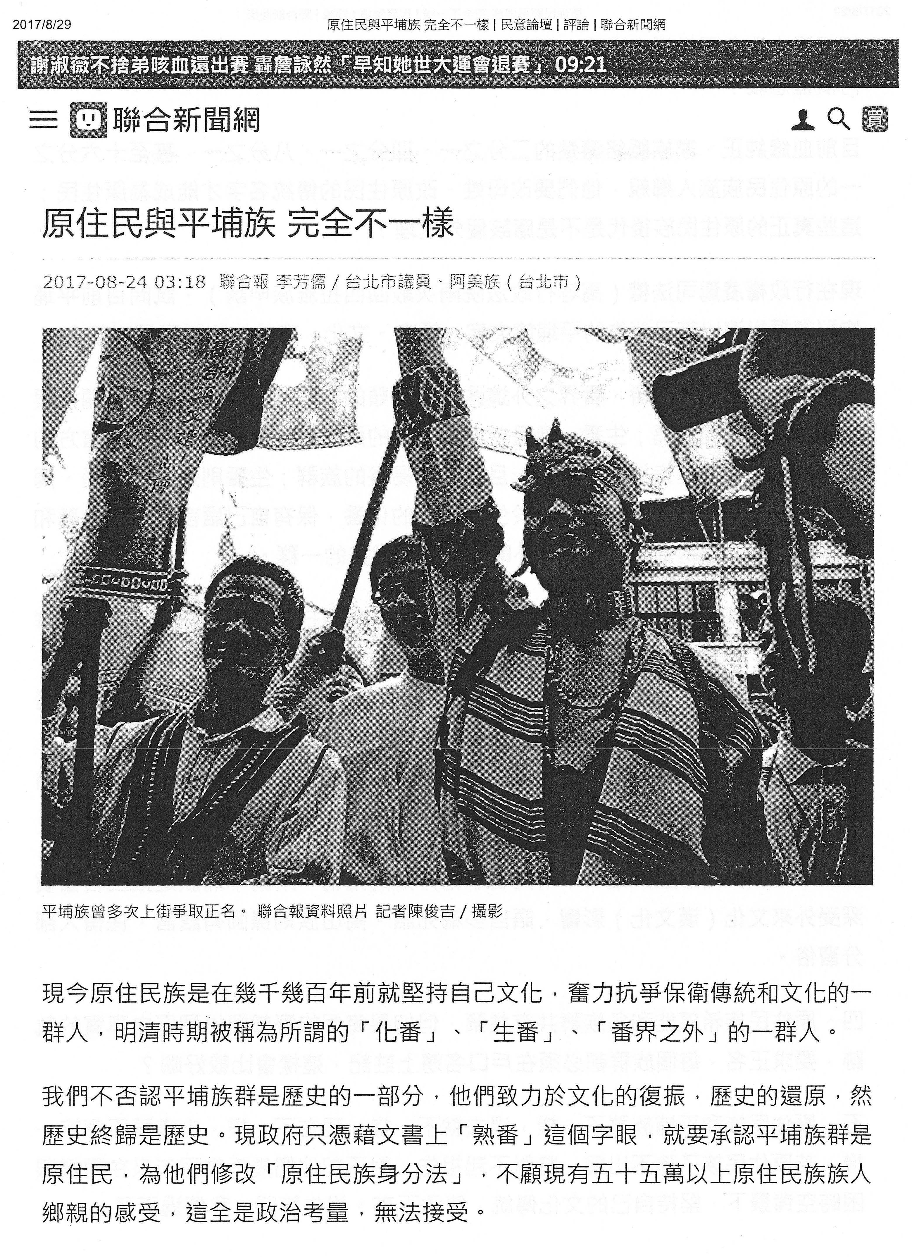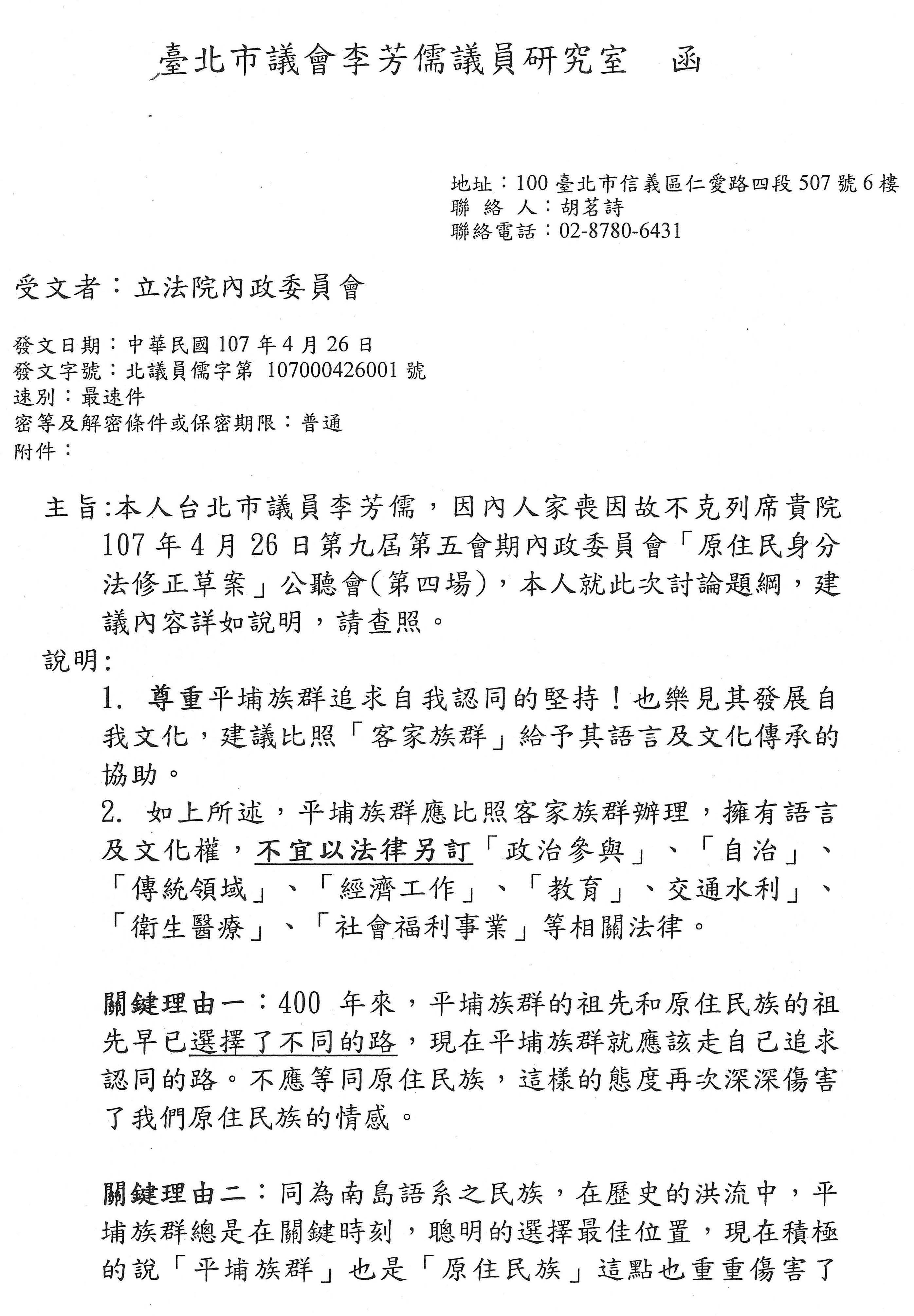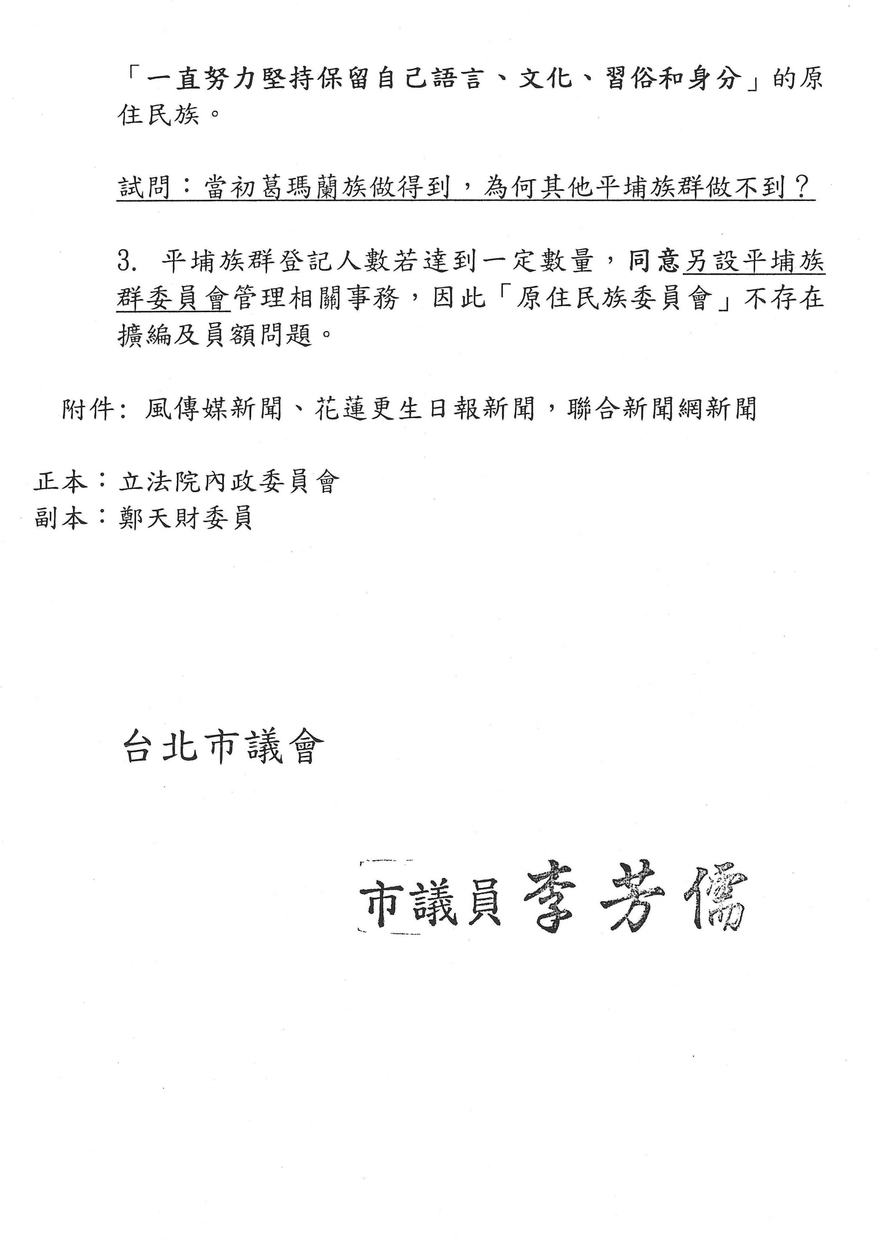 另外,有關應否設立專屬的「平埔族群委員會」,我們並不贊成,因為大家年紀已大,像林先生已經奮鬥二、三十年要正名,在年紀及體力方面都不行了。設立這個委員會是否得宜,我不予置評,但要重新開始,有些冗長的程序會沒完沒了!行政院版本有符合現在的需求,若要再成立「平埔族群委員會」,它的時效性及需求並沒有那麼重要,如果不設立的話,依據蔡總統承諾,要保障原住民相關資源,依據平埔原住民人口比例,建議原民會擴充組織、人力及預算分配,必要時可以增設任務編組以因應平埔原住民族相關事務。