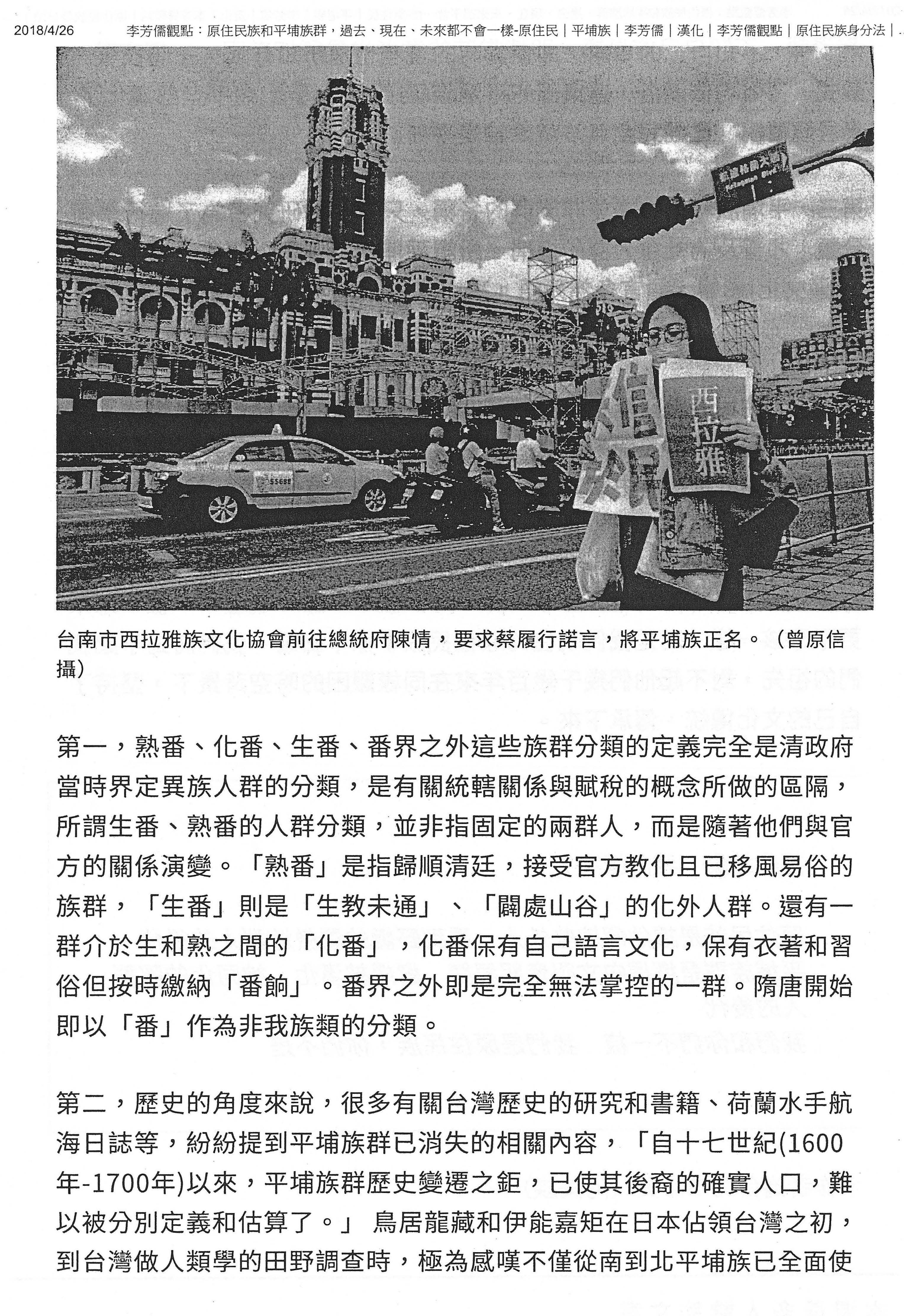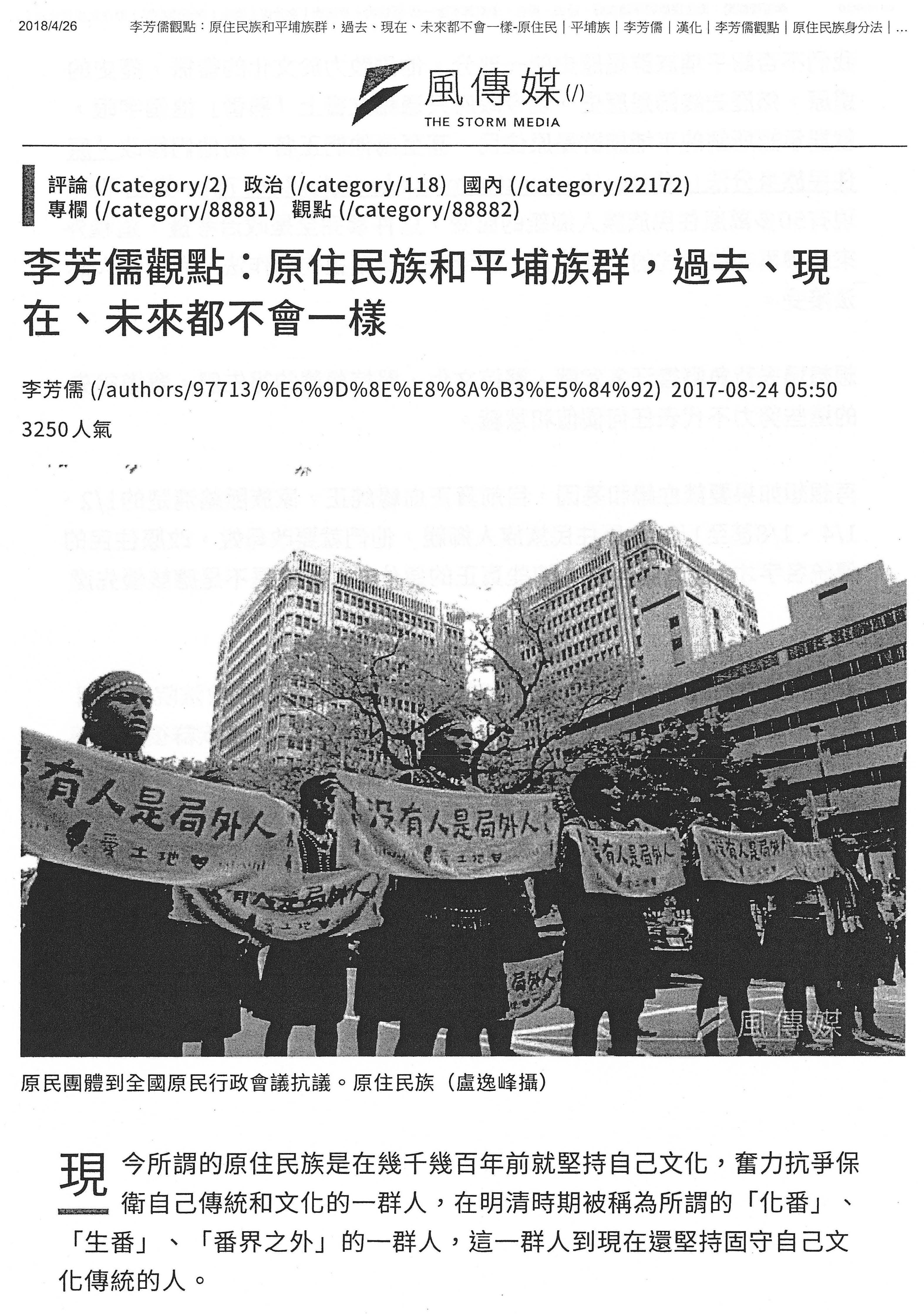 其實我也覺得很悲哀的就是,在日本時代,台灣人(本島人)要用講得很費力的「國語」,而且那個「國語」是九州的「國語」,被東京的日本人認為是鄉巴佬講的,我們很費力地在講。戰後我們要講中華民國的「國語」,也是很費力地在捲舌,而且我們也不知道那到底是哪裡的國語,是山東的國語、廣東的國語,還是哪裡的國語?我只是說,我們看到平埔族的族親很費力地在講自己的族語,想要證明這樣是真正的原住民、這樣交心的時候,我那種感覺就是美國過去就是這樣子,印地安人被強迫同化以後,在法院很費力地、透過裝扮的外表等等,要表示他是真正的印地安人。其實我想不用多久,也許10年,或者長一點,20年,有更多的原住民可能會被主流社會要求必須證明自己是原住民。因為這背後就是已經完全忘了原住民的權利是因為他的身分而來的,跟其他少數族群是不一樣的,並不是因為他住在偏遠地區、住在山上的部落而來的。我想這在政治哲學上是完全不一樣的。