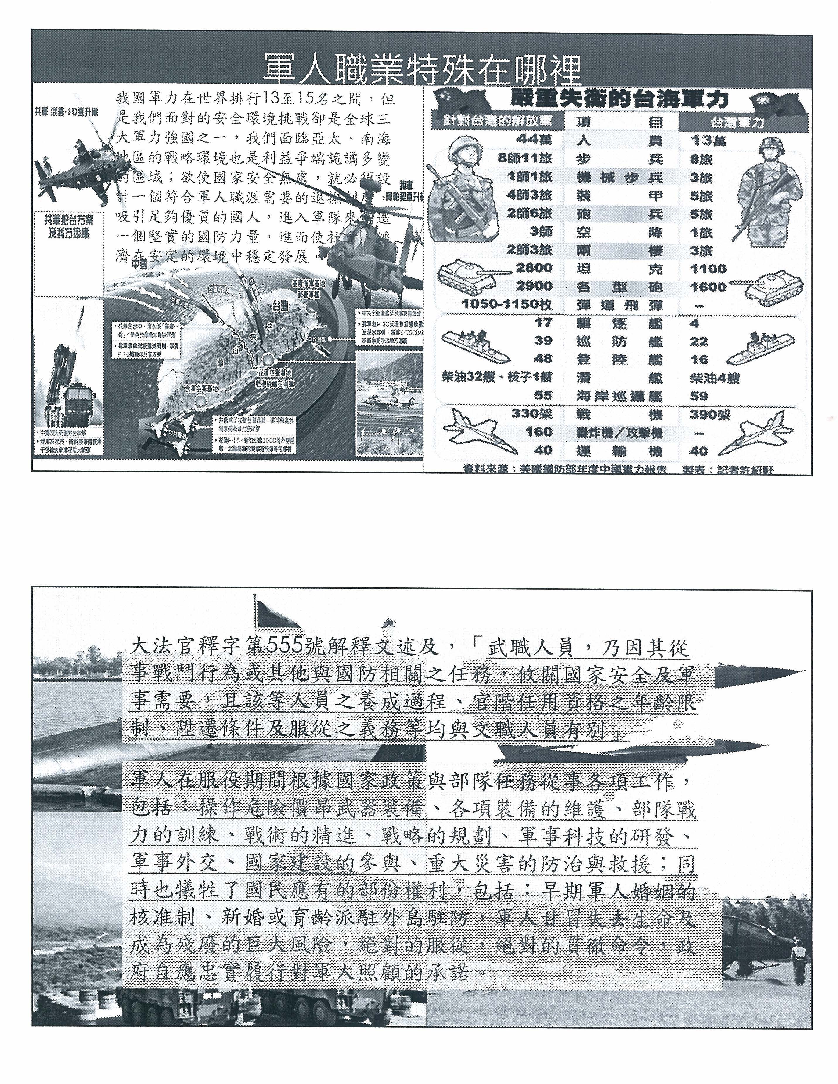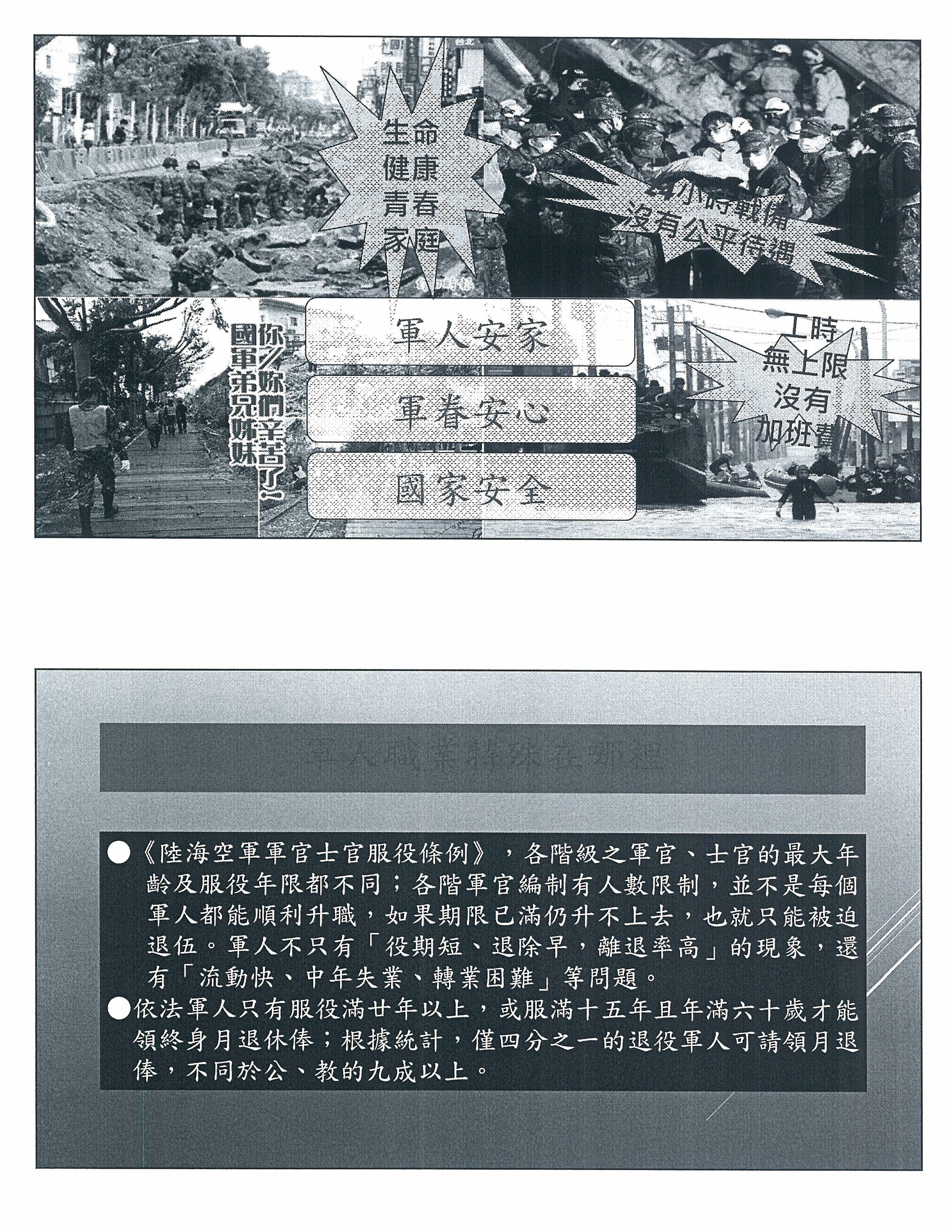 我們看到軍人24小時戰備,沒有公平的待遇,我們的工時沒有上限,我們從來沒有聽過所謂的加班費,我們用我們的生命、用我們的健康、用我們的青春,甚至犧牲我們的家庭,在保護全國所有人的家庭。我要說:國軍所有的兄弟姊妹們,你們辛苦了!我們求的不過就是軍人能夠安家嗎?我們求的不過是我們軍眷能夠安心嗎?我們最後不就是要為我們的國家安全做最大的保障和奉獻嗎?軍人職業特殊之處為何?依照陸海空軍軍官士官服役條例規定,各階級之軍官、士官的最大年齡和服役年限都不同;各階軍官編制有人數限制,並不是每個軍人都可以順利升職的,如果服役期限已滿仍升不上去,也就只好被迫退伍。軍人不只有役期短、退除早、離退率高的現象,還有流動快、中年失業與轉業困難等問題。依法軍人只有服役滿20年以上,或服務滿15年且年滿60歲才能支領終身月退休俸。根據統計,僅有25%(即是四分之一)的退役軍人可以請領月退俸,不同於公教人員高達九成以上的人可以領取月退俸。