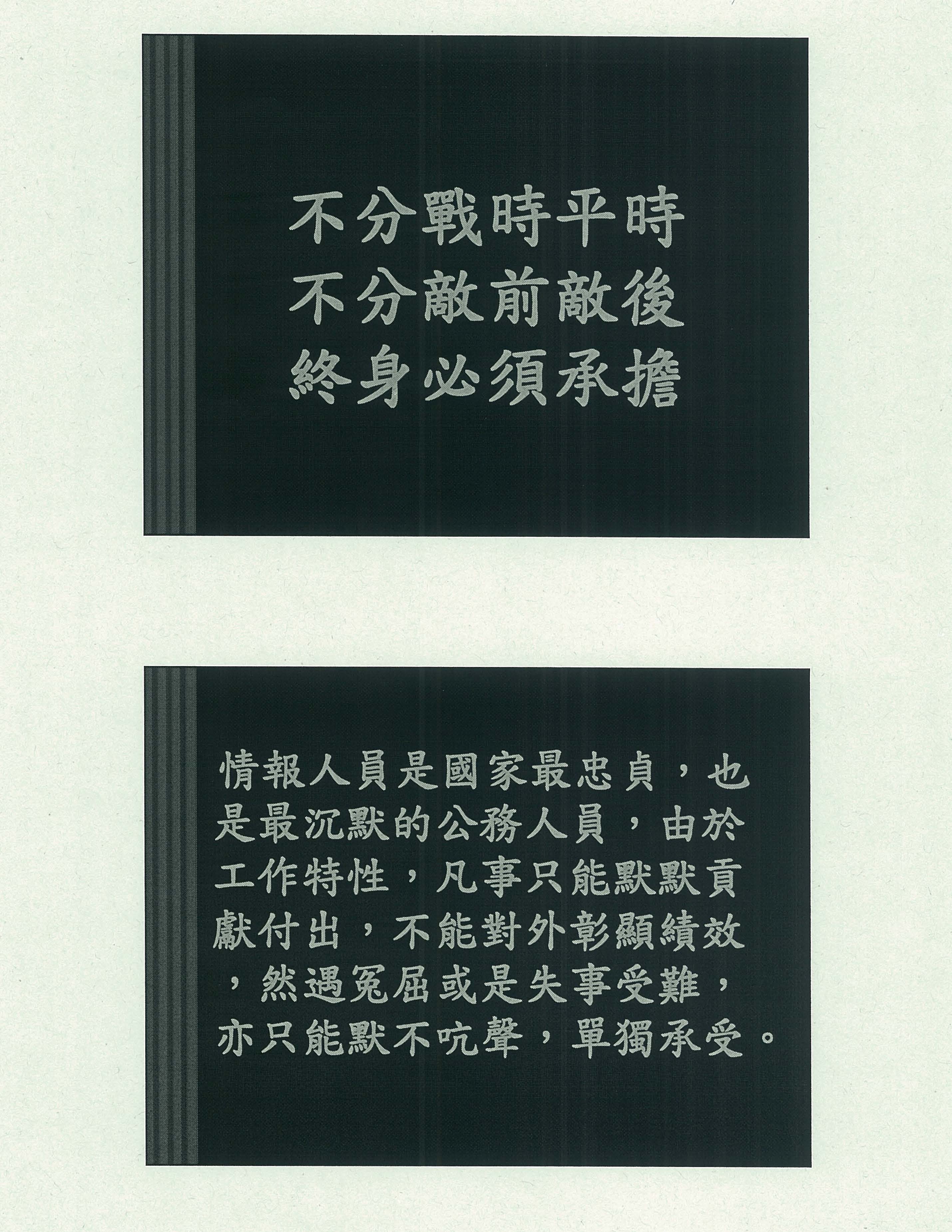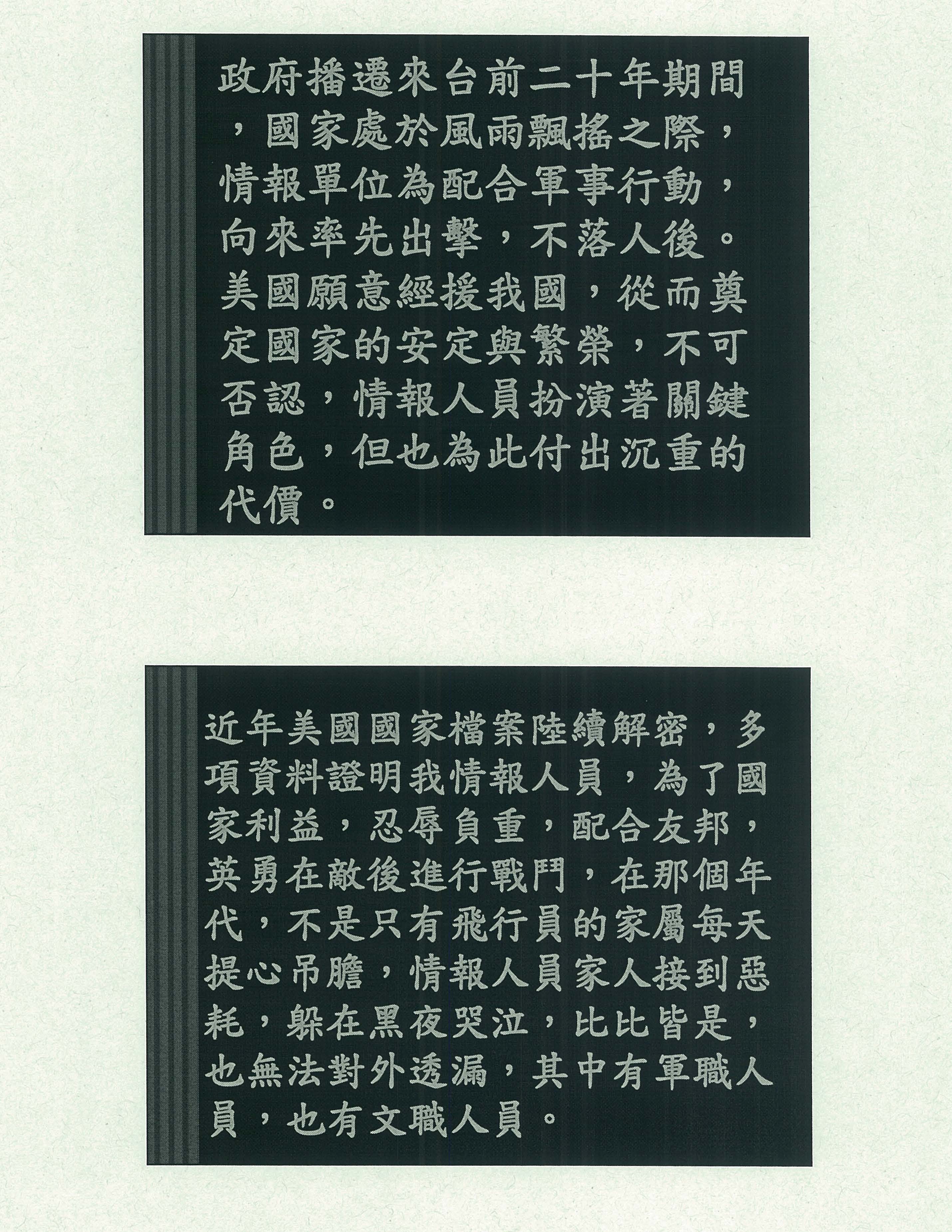 接下來,我想講情報工作的特性:「不分戰時平時、不分敵前敵後、終身必須承擔」。情報人員是國家最忠貞,也是最沉默的公務人員,由於工作特性凡事只能默默貢獻付出,不能對外彰顯績效,遇到冤屈或是失事受難,也只能悶不吭聲,單獨承受。政府播遷來台前二十年期間,國家處於風雨飄搖之際,情報單位為配合軍事行動,向來率先出擊,不落人後。美國願意金援我國,從而奠定我國的安定與繁榮,不可否認,情報人員扮演重要的角色,但我們也為此付出沉重的代價。近年來美國國家檔案陸續解密,多項資料證明我情報人員,為了國家利益,忍辱負重,配合友邦,英勇在敵後進行戰鬥,在那個年代,不是只有飛行員的家屬每天提心吊膽,情報人員的家人也是接到惡耗,躲在黑夜哭泣,比比皆是,也沒有辦法對外透露,其中有軍職人員,也有文職人員。