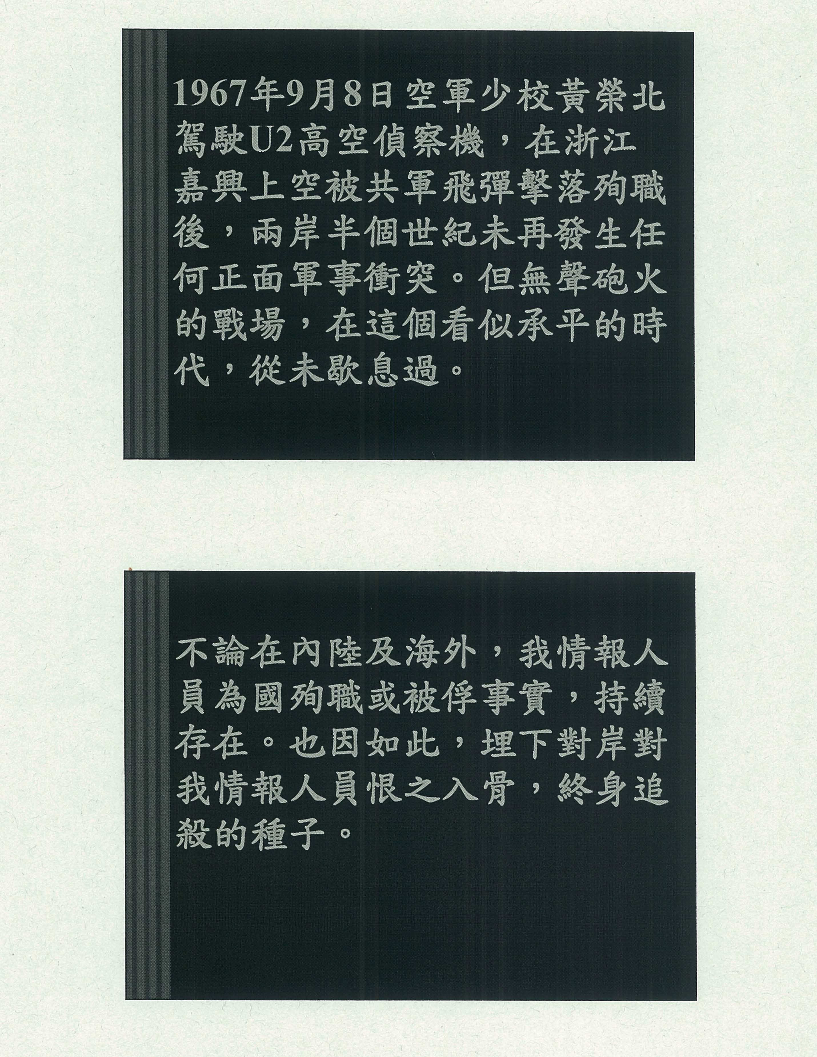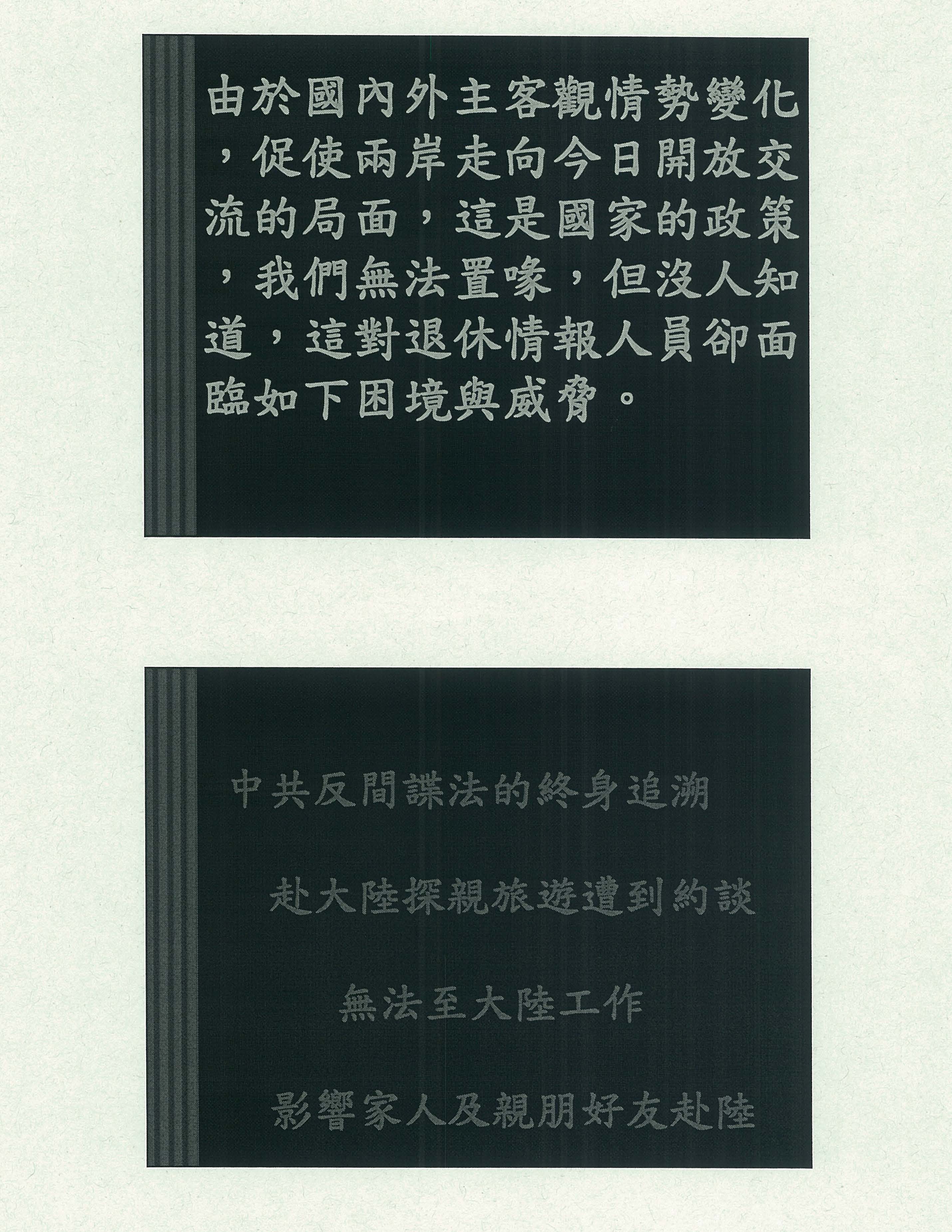 1967年9月8日空軍少校黃榮北駕駛U2高空偵察機,在浙江嘉興上空被共軍飛彈擊落殉職後,兩岸半個世紀沒有再發生任何正面的軍事衝突,但是無聲砲火的戰場,在這個看似承平的時代,從來沒有歇息。不論是在國內或海外,我方情報人員為國殉職或被俘事實,持續存在,也因此埋下對岸對我情報人員恨之入骨,終身追殺的種子。由於國內外主客觀情勢變化,促使兩岸走向今日開放交流的局面,這是國家的政策,我們無法置喙,但沒有人知道這對於退休的情報人員,我們面臨如下的困境與威脅:第一、中共反間諜法的終身追溯,然而非常諷刺地,在台灣當今的政府要追溯我們的財產,但是在對岸要追溯我們的刑責,我們兩面不是人;第二、赴大陸探親旅遊遭到約談,這已經是一個常態,所以本人從國安局退休15年來,從未有一天到過中國大陸;第三、無法至大陸工作,我們有很多情報人員退休,他們具有語言專長或特別專長卻統統無法到大陸工作,即使有工作的職缺,最後甚至影響家人及親朋好友赴大陸。