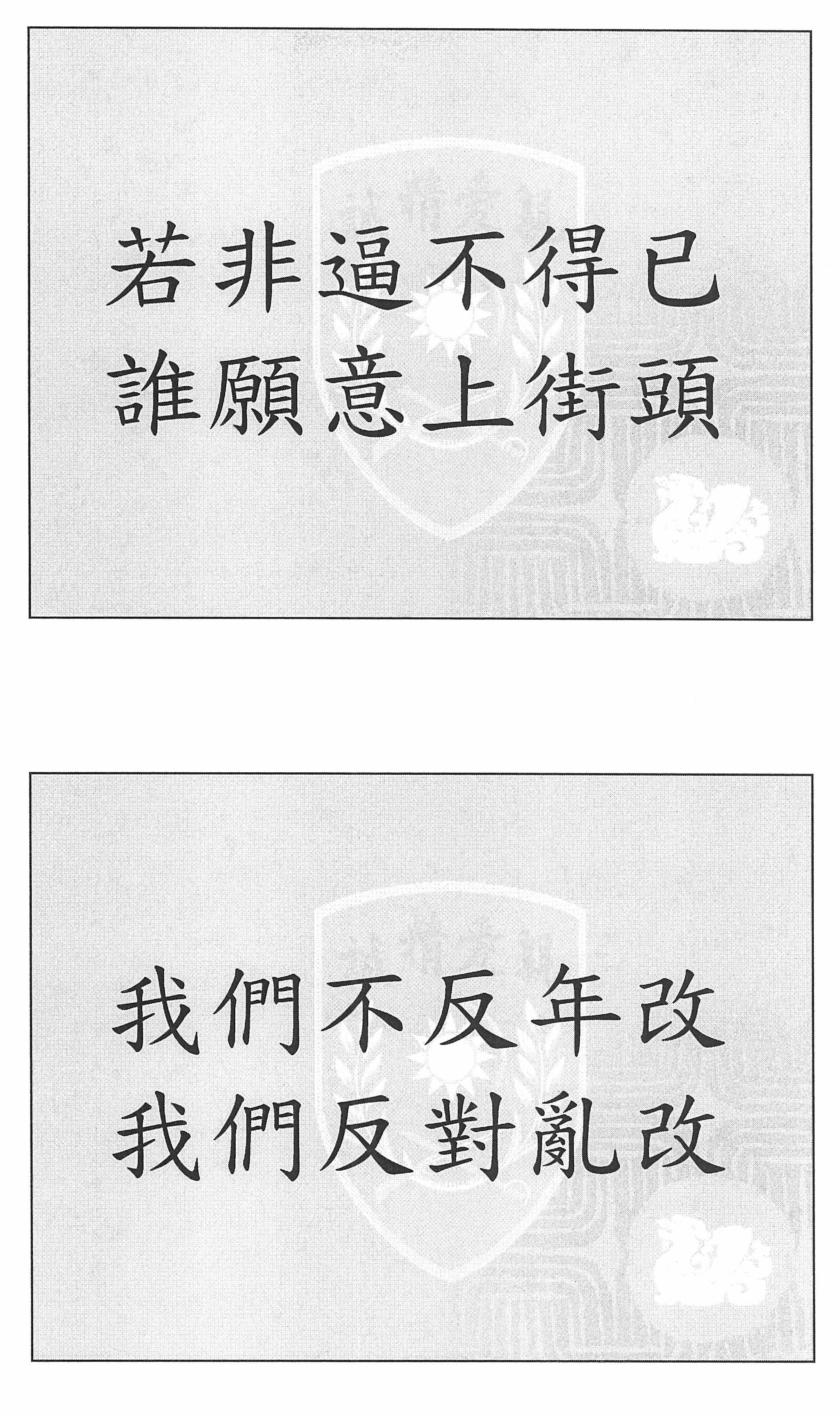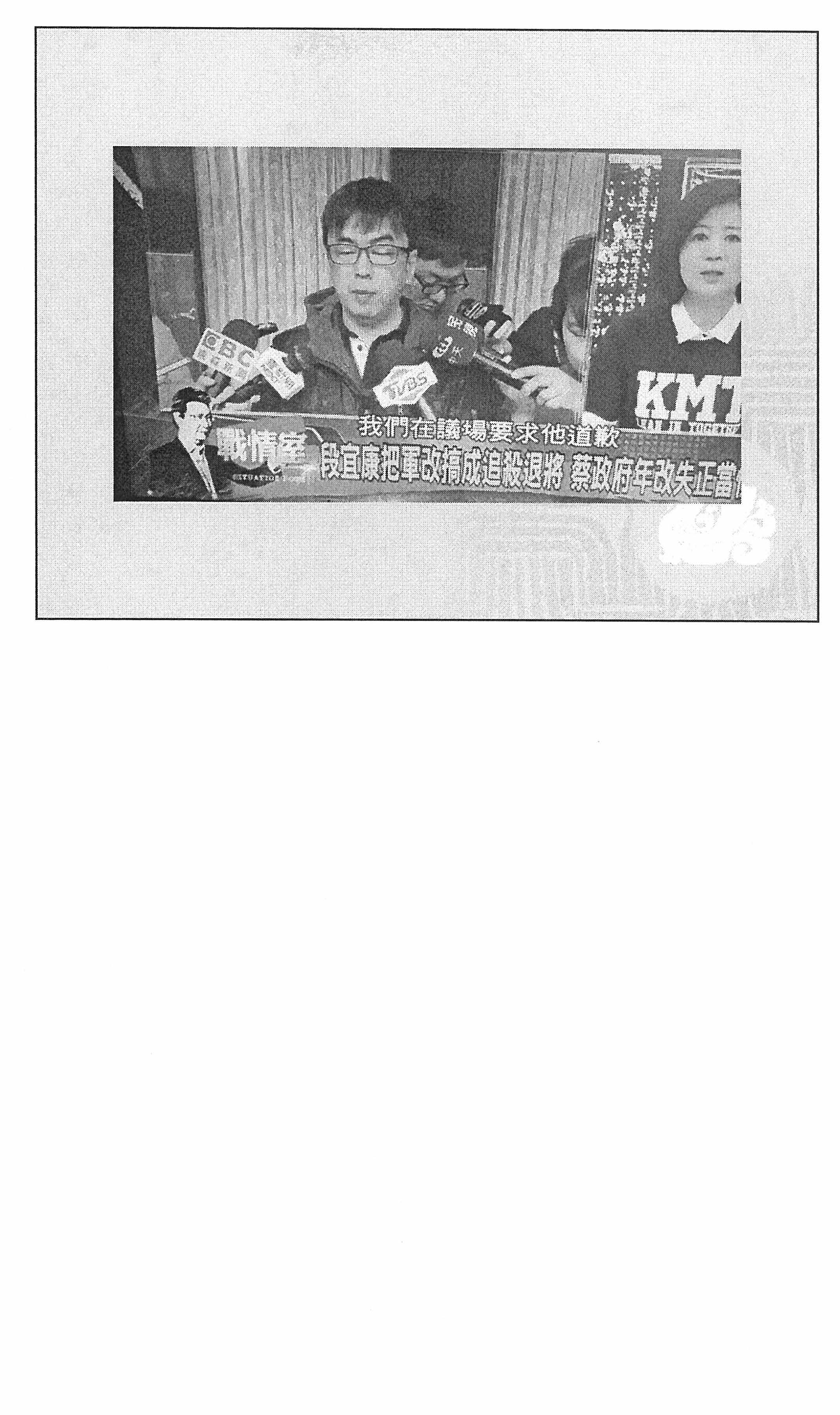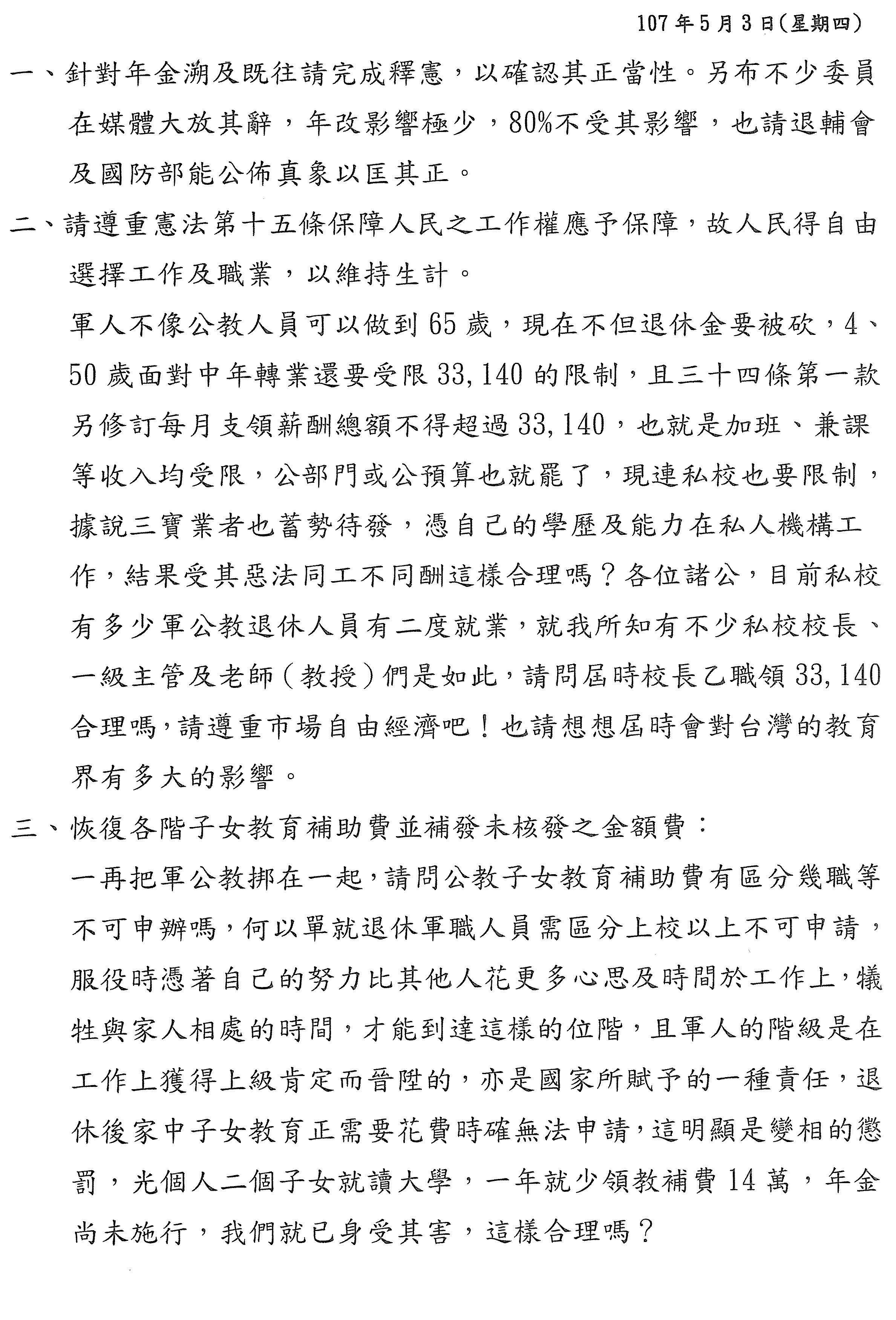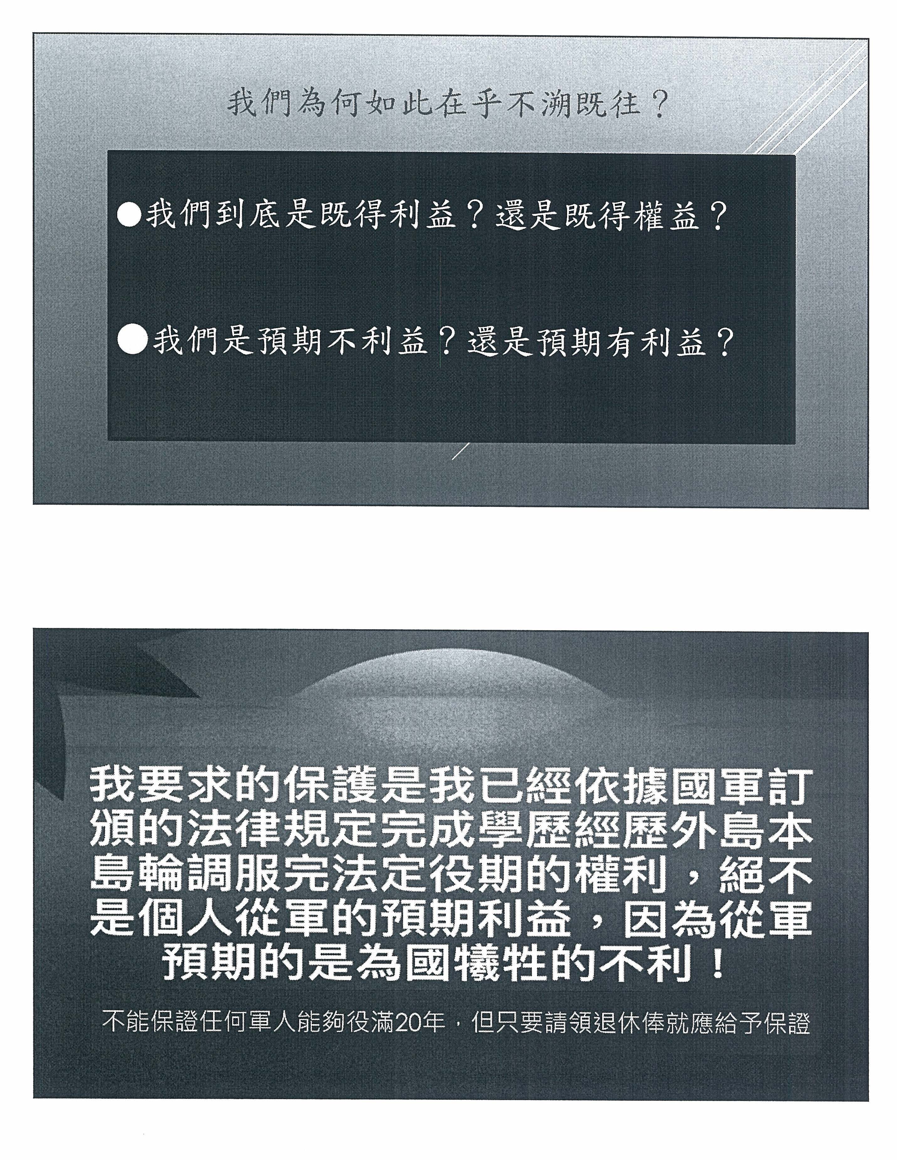 最後我要再次呼籲,後面有兩百多萬名退伍袍澤在支持國防部、支持退輔會,請你們勇敢地向這個不公不義的政府說出:No!