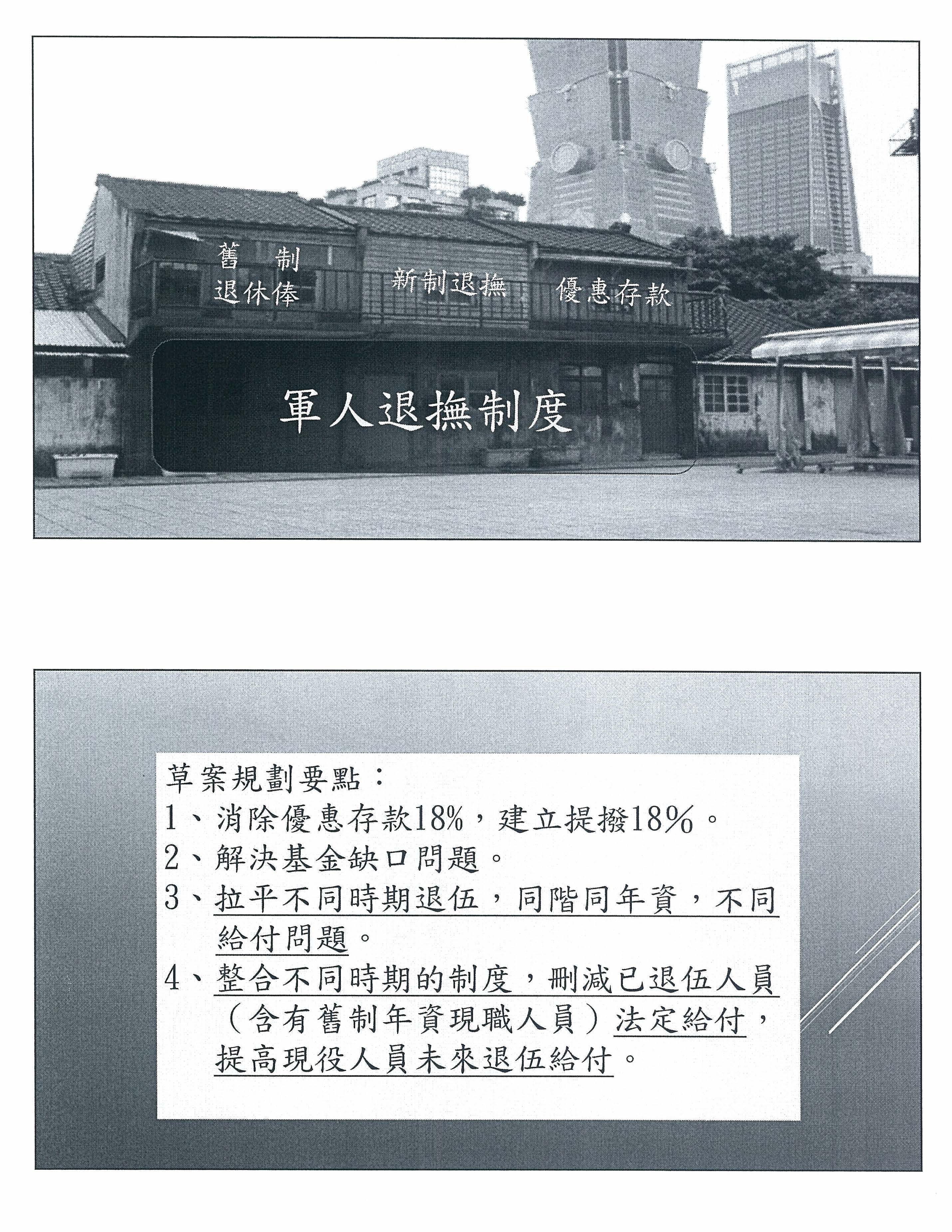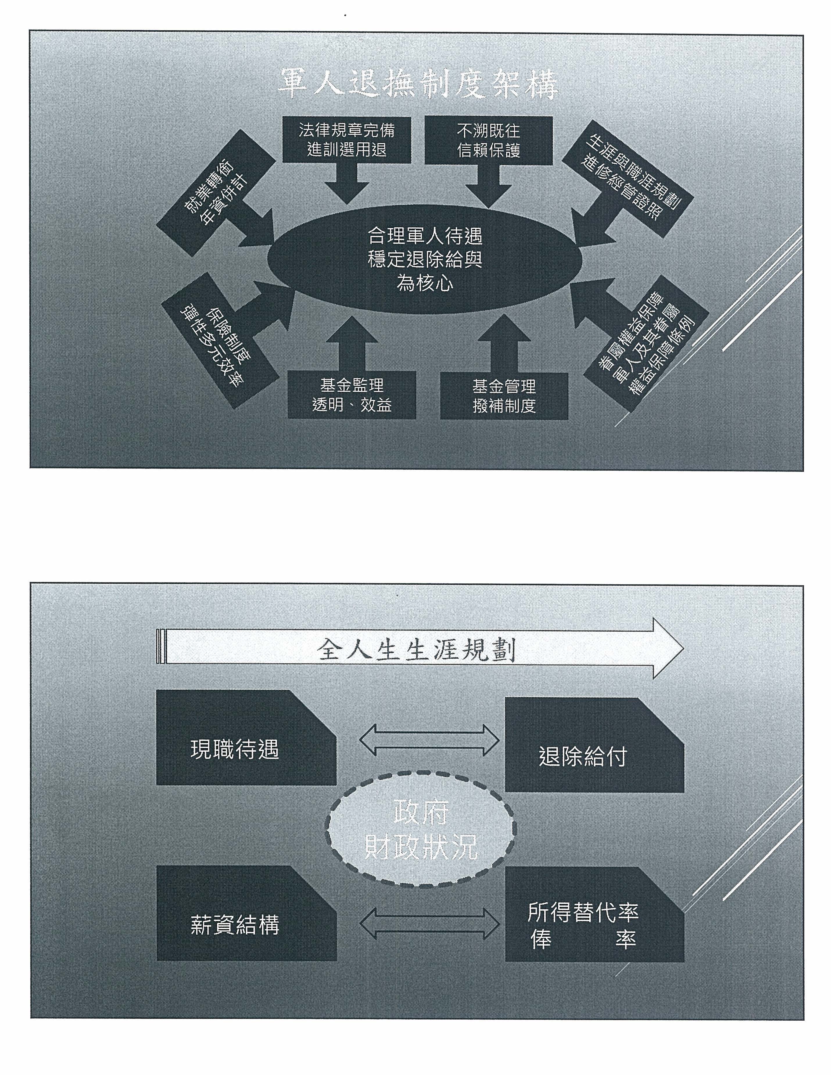 在國家財政能力負擔上,我們考慮到現職待遇與退除役給付的平衡,也考慮到薪資結構與所得替代率等問題。現在的軍人退撫制度好比一座老舊眷村,上面有三個隔間:舊制退休俸、新制退撫與優惠存款。我們要做的就是打破隔間重新蓋房子,並消除優惠存款、解決基金缺口。更重要的是,拉平不同時期退伍與同階同年資卻不同給付的問題。此外,還要整合不同時期的制度,刪減已退伍人員的法定給付,提高現役人員未來退伍給付。
