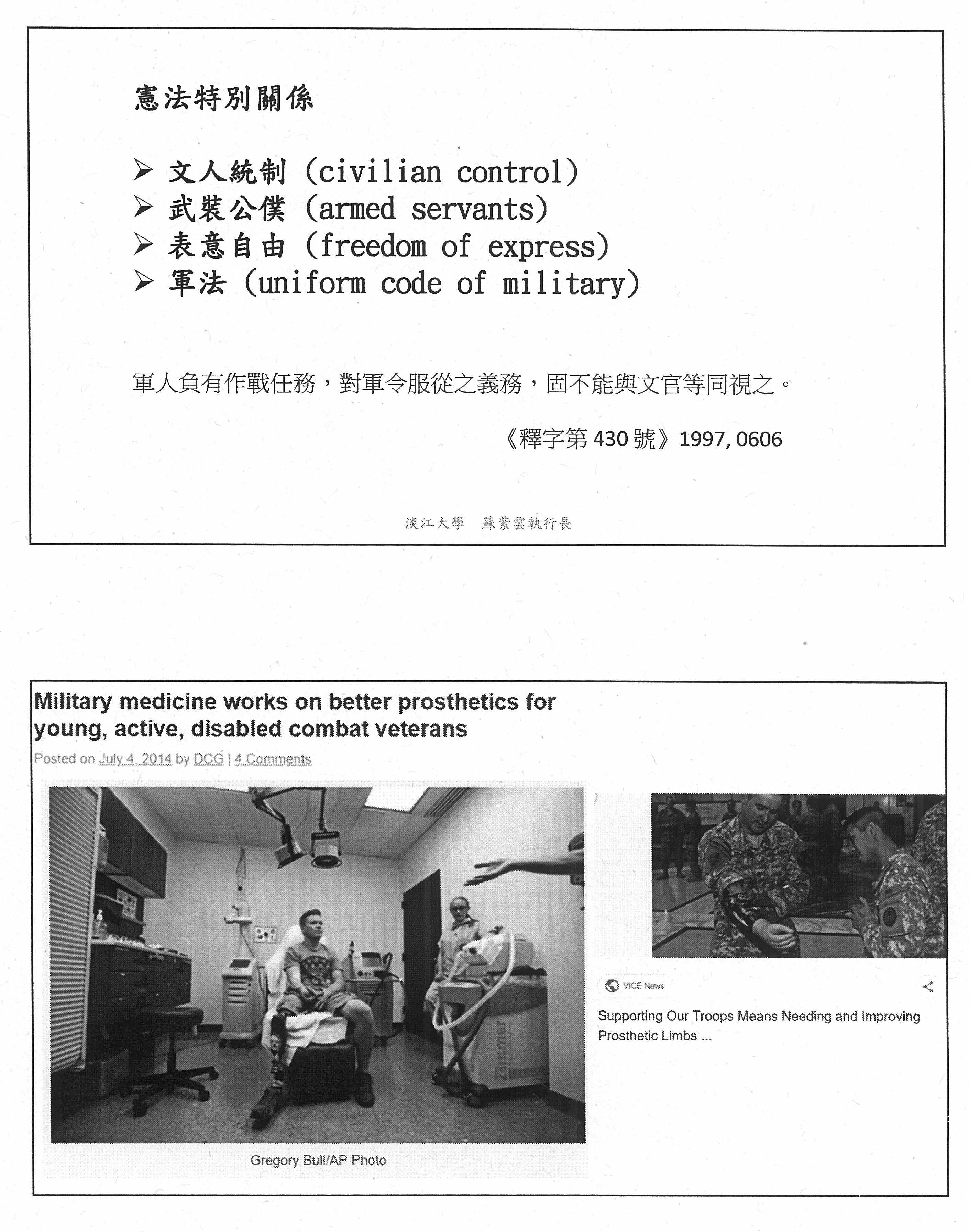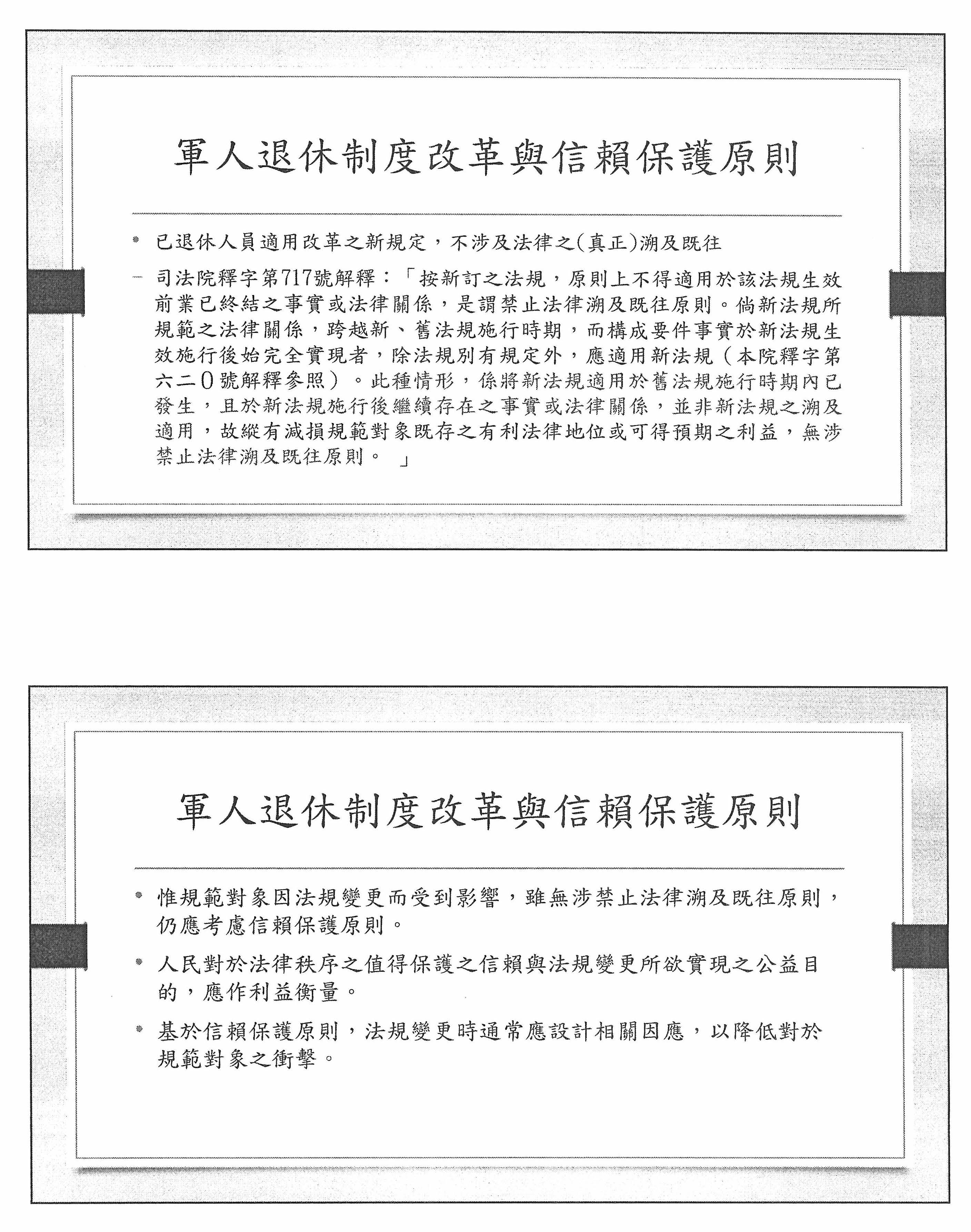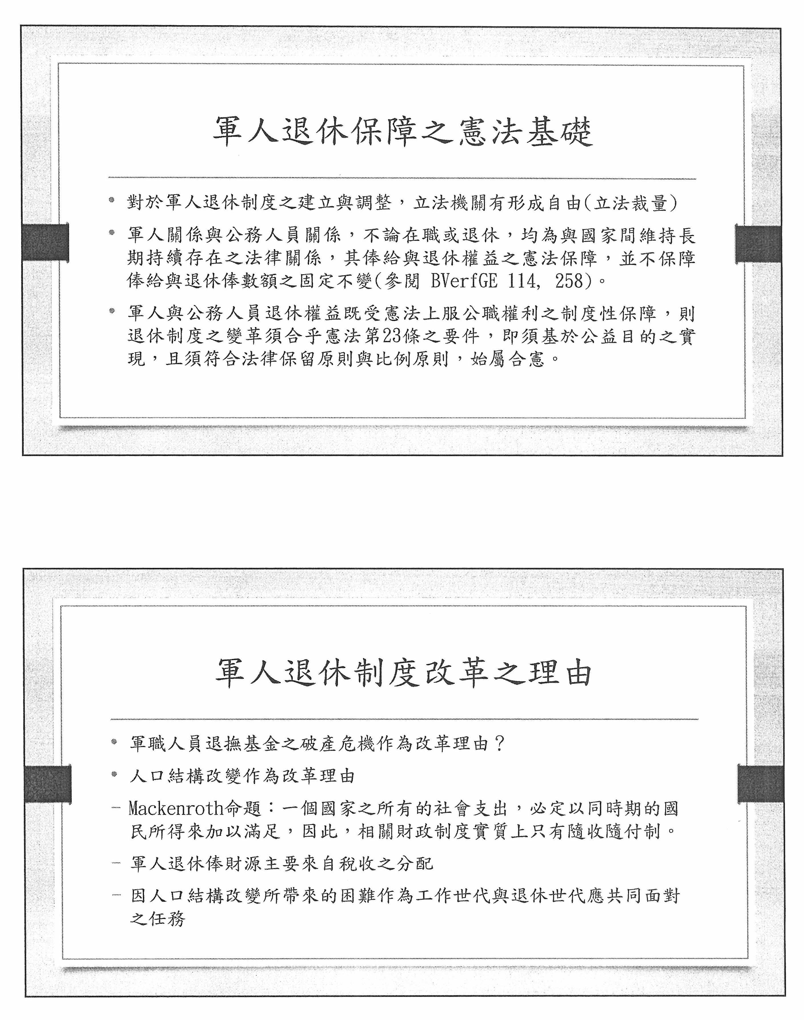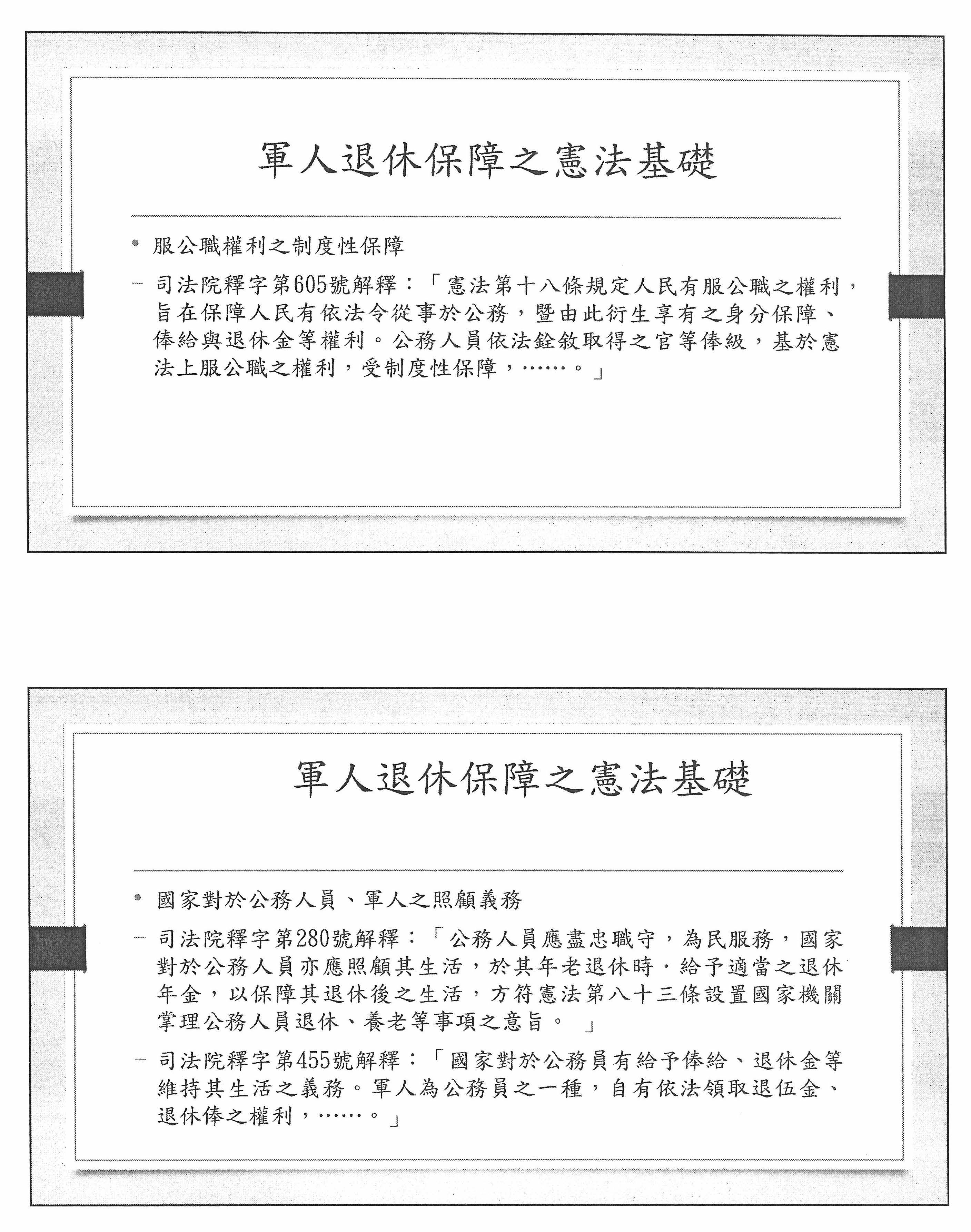 關於軍人的退休制度,我先跟各位說明它的憲法基礎,主要考慮的是大法官在很多號解釋裡面所提出的服公職權利的制度性保障,易言之,大法官認為法律上所建立的俸給或是退休制度受到憲法第十八條服公職權利的保障。它雖然是法律所建立的制度,但是退休制度或俸給制度的保障受到憲法第十八條服公職權利的制度性保障,所以它具有憲法保障的位階,這裡有幾號解釋可以參考。此處特別要提的是依照大法官的相關解釋,國家對於軍人及公務員負有照顧的義務,由這個照顧義務來推論出剛剛提的關於俸給制度以及退休制度的憲法保障。