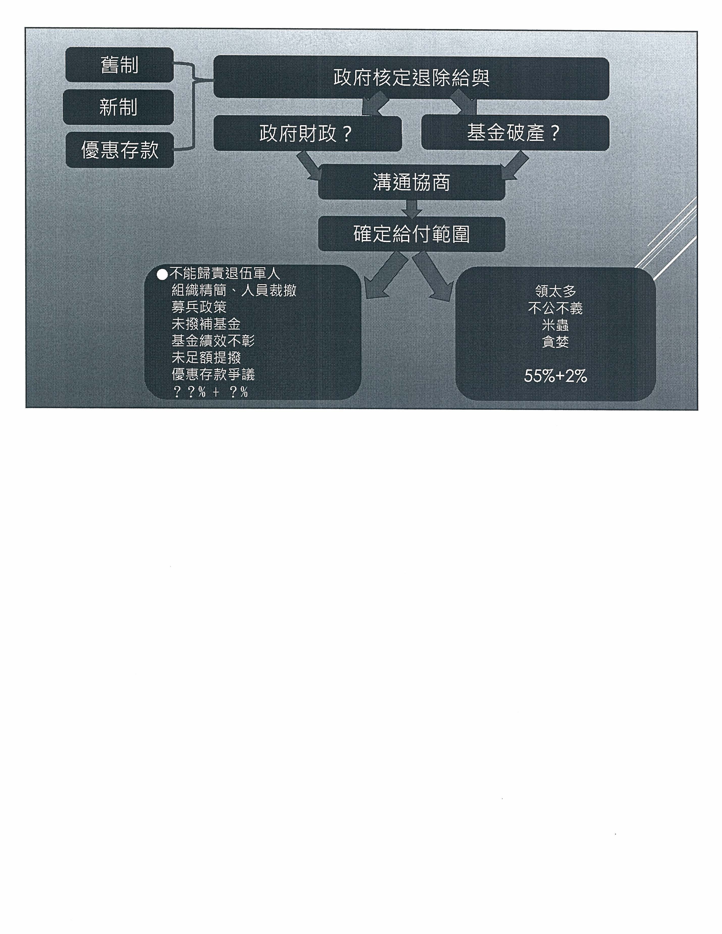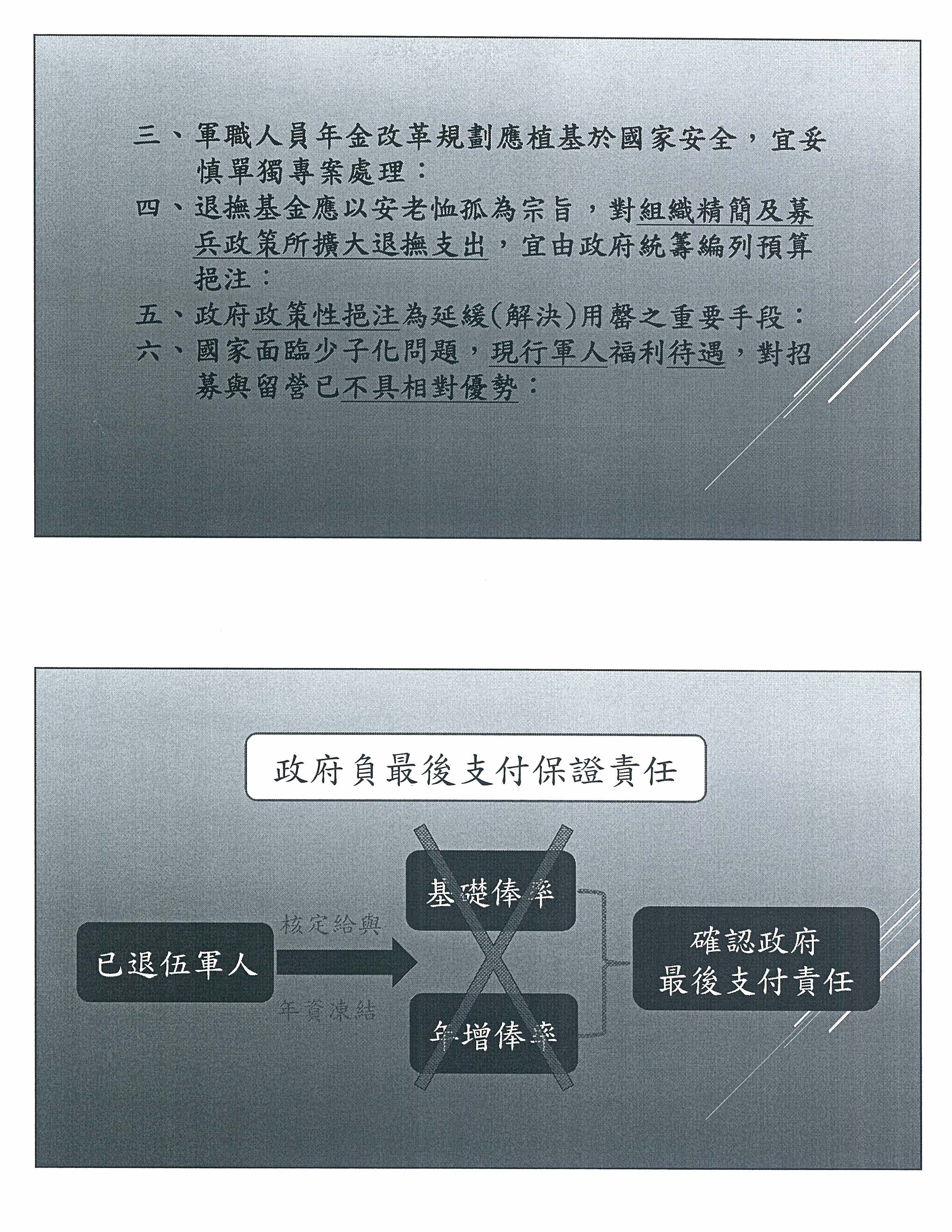 現在我想討論的是,何謂政府負最後支付保證責任。國防部退伍軍人報告也提到,退伍軍人退撫基金年資均已凍結,呈封閉式收斂,而現役軍人是持續開放發餉,所以這兩個不同的態樣,如果在陸海空軍軍官士官服役條例用同樣的方法來解決,我們覺得是有困難、有問題以及有更大的爭議,退伍軍人是已經核定給予,年資已經凍結,我們認為基礎俸率和年增俸率是不存在的,我們唯一就是確認政府最後支付責任。怎麼樣確認政府最後支付責任?舊制、新制、優惠存款三個制度都是政府核定的退除給與。政府財政有困難嗎?我這邊不再多做贅述,大家都很清楚8,800億元、南向政策等等。另針對基金破產,基金是政府會計的一環,基金是一個會計個體,基金是一個資金的流入流出,基金是政府會計的特種基金,特定的收入供特定的用途,基金不是一個產業、不是一個企業,大家怎麼會把它搞成破產的問題?