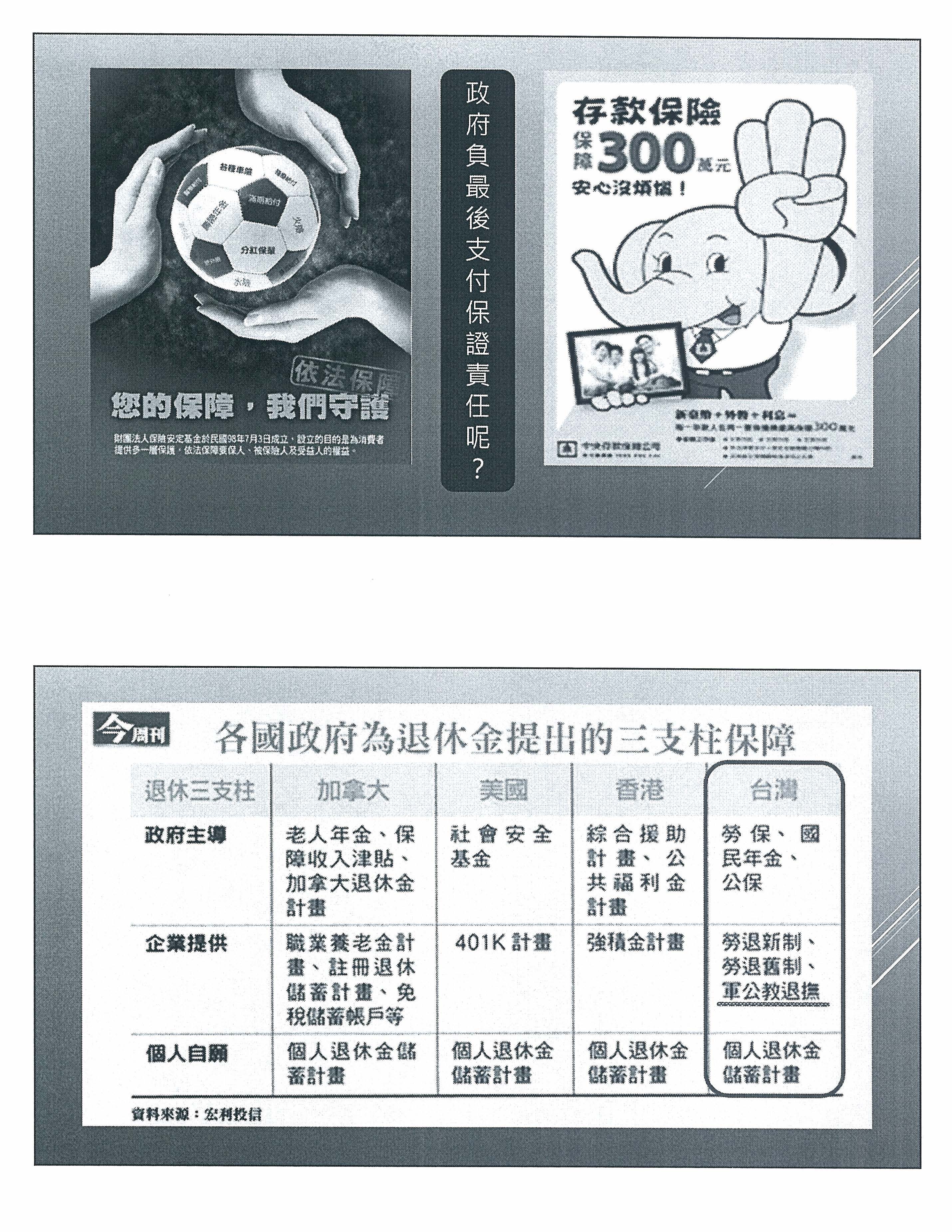 第二,政府把軍人的退休俸給列為年金改革的對象,把國家應盡的義務跟社會保險制度混為一談,這是一種極為錯誤的行為,明顯侵害人民的生命財產權利,我們的憲法保障人民的財產權,在社會基金保險,被保險人繳的保費是成立一種互助性質、分散風險的基金,這兩者是完全截然不同的概念。