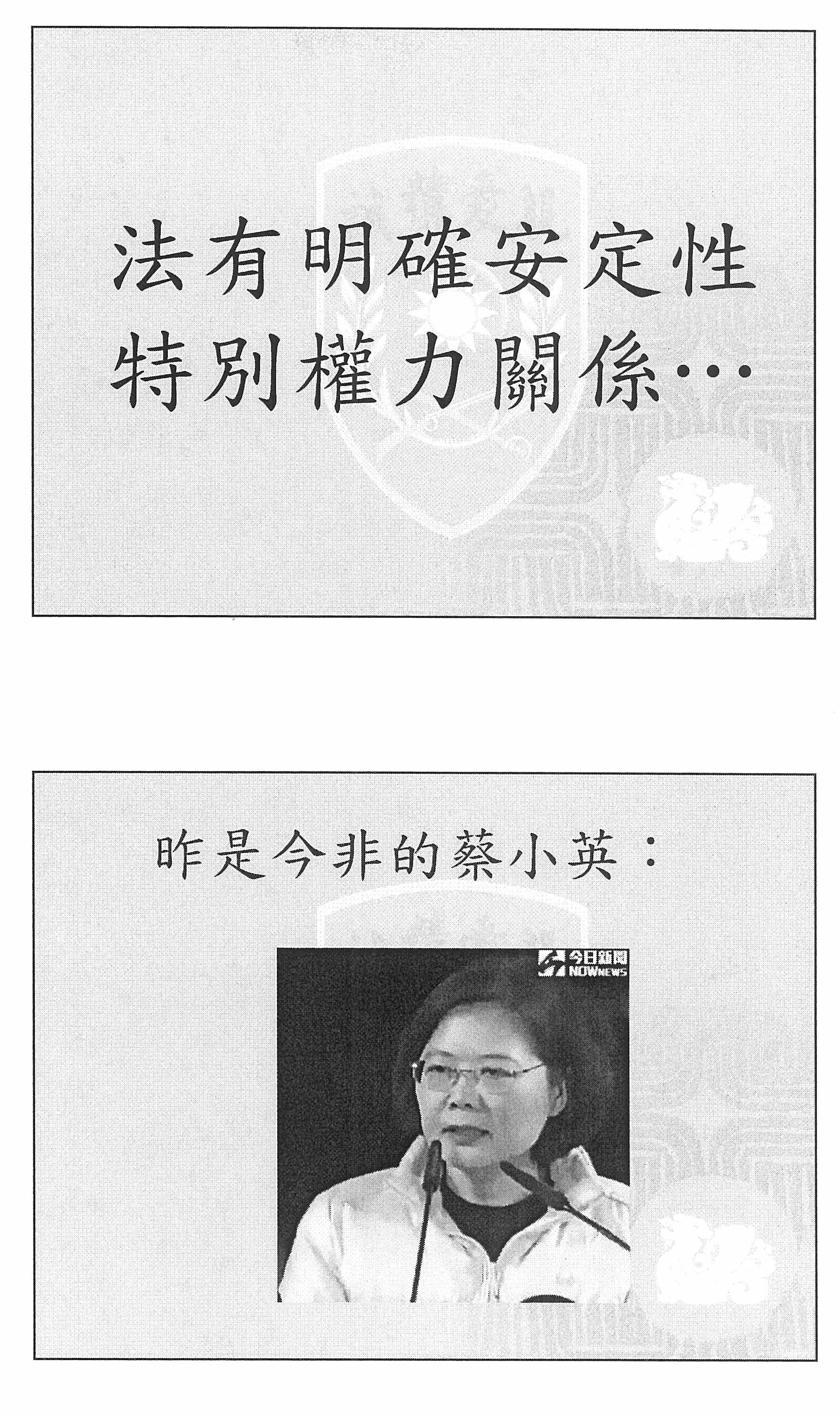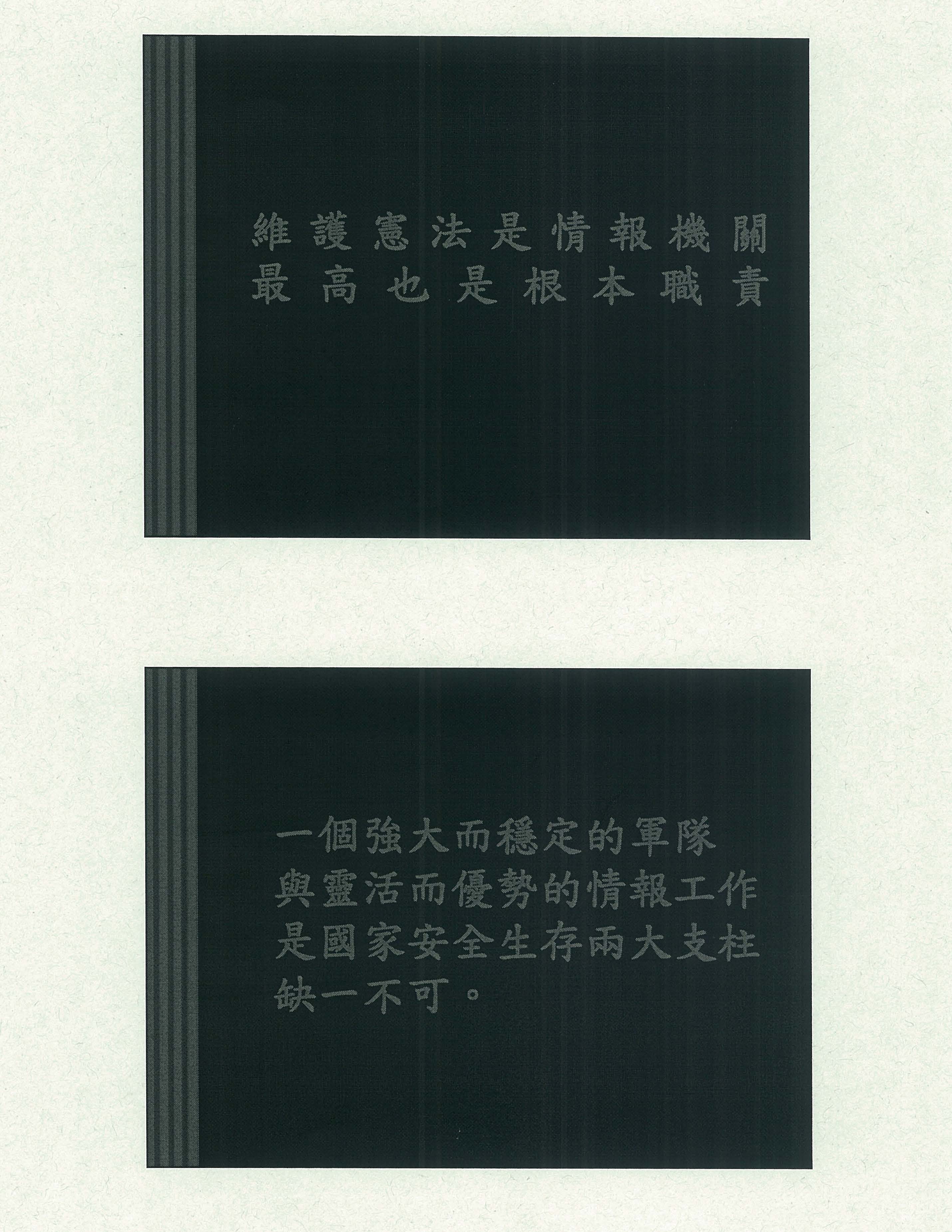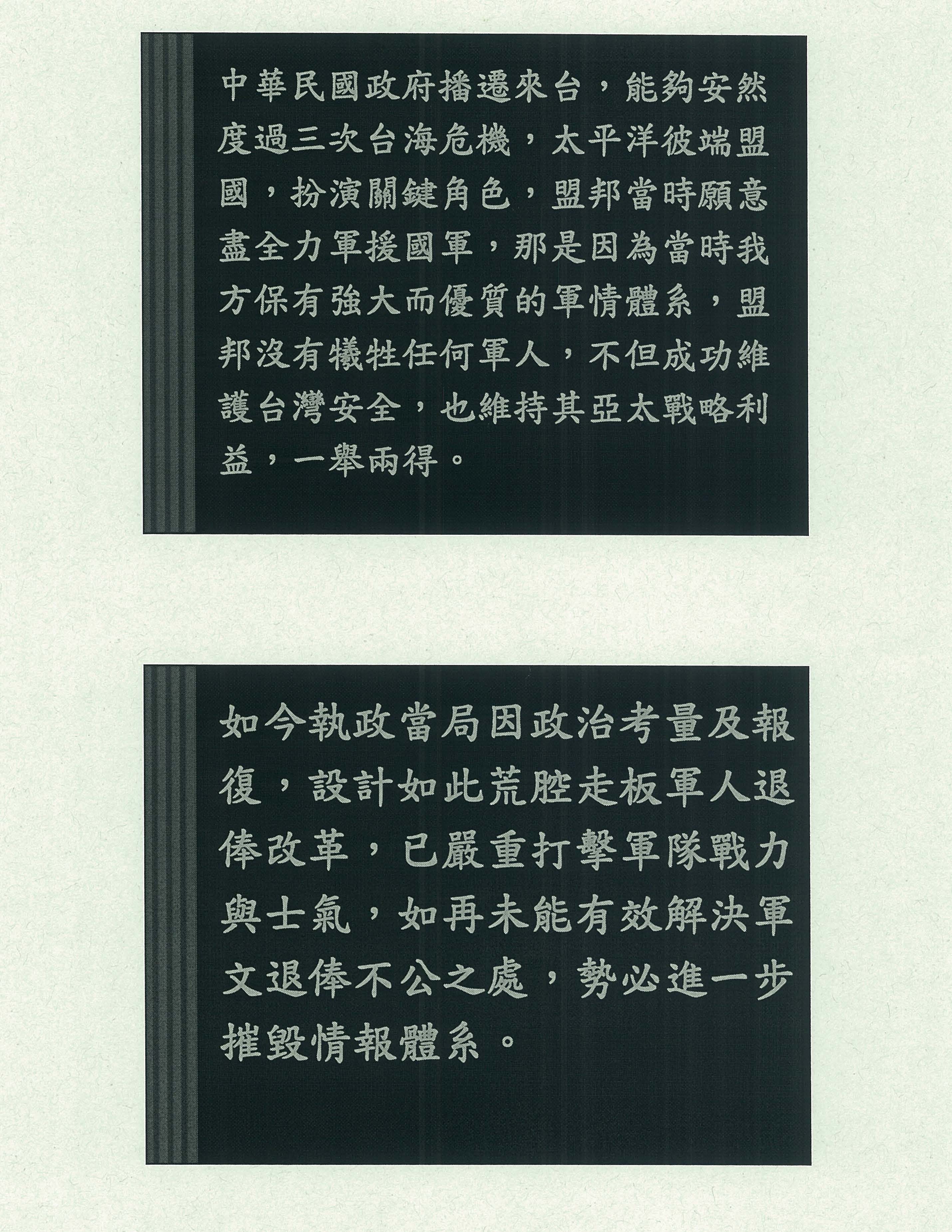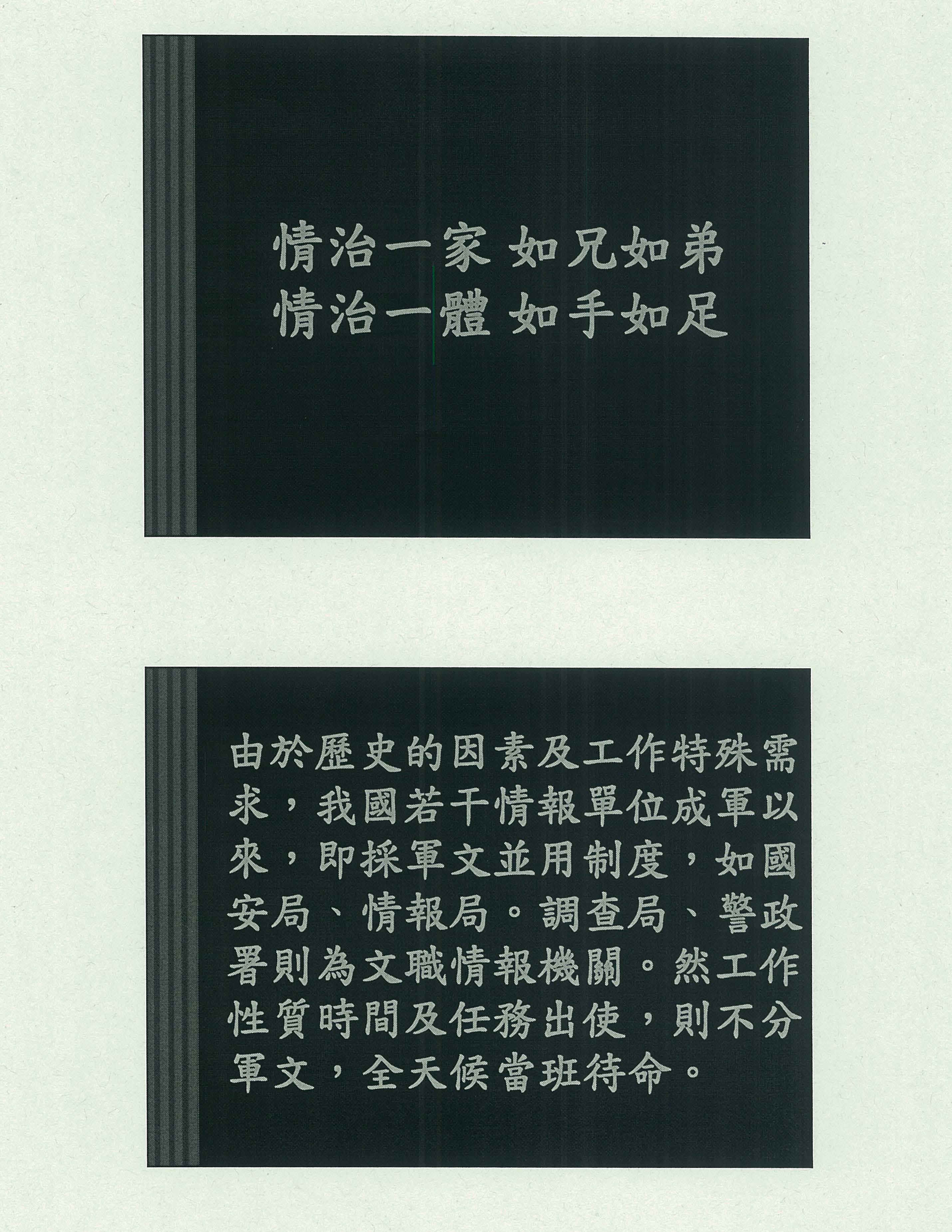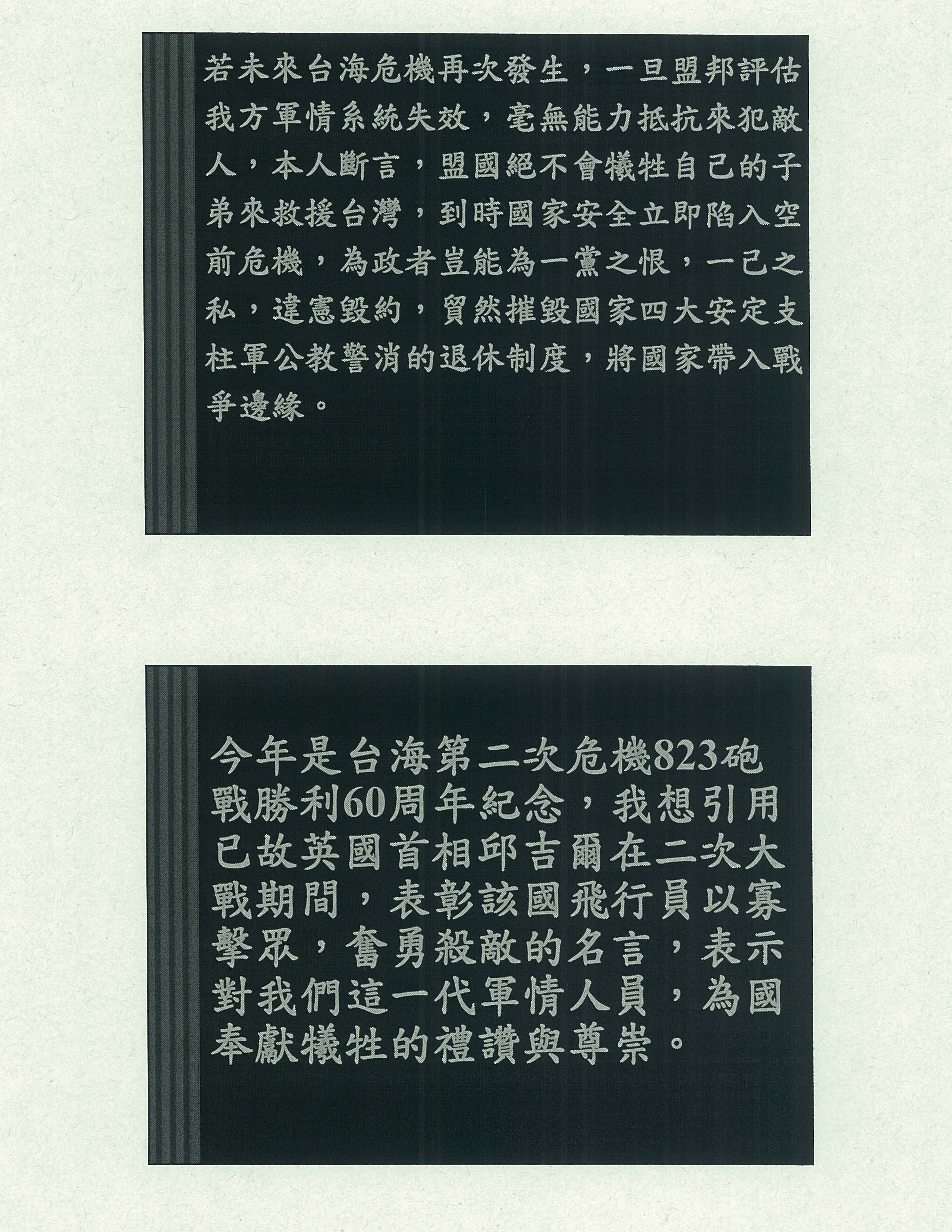 維護憲法是情報機關最高,也是根本職責,這是我今天第一個要提出來的部分。第二部分是,一個強大而穩定的軍隊與靈活而優勢的情報工作是國家安全生存兩大支柱,缺一不可。在我還沒有講到主題之前,也許在我發言的此刻,在海外的任何一個國家、在太平洋彼岸內陸的任何一個地方有我們的情報人員現在可能正在工作,也有我們被俘的人員正在受監受刑,如果一生為國效忠的情報人員知道也許他們明年就要退伍了。他們不知道現在政府這種砍軍人及情報人員退伍薪俸如此狠毒,我不知道他們有何感想,我也不知道他們以後會不會繼續在不是我們國家司法權管轄內執行對國家最有貢獻的情報工作。