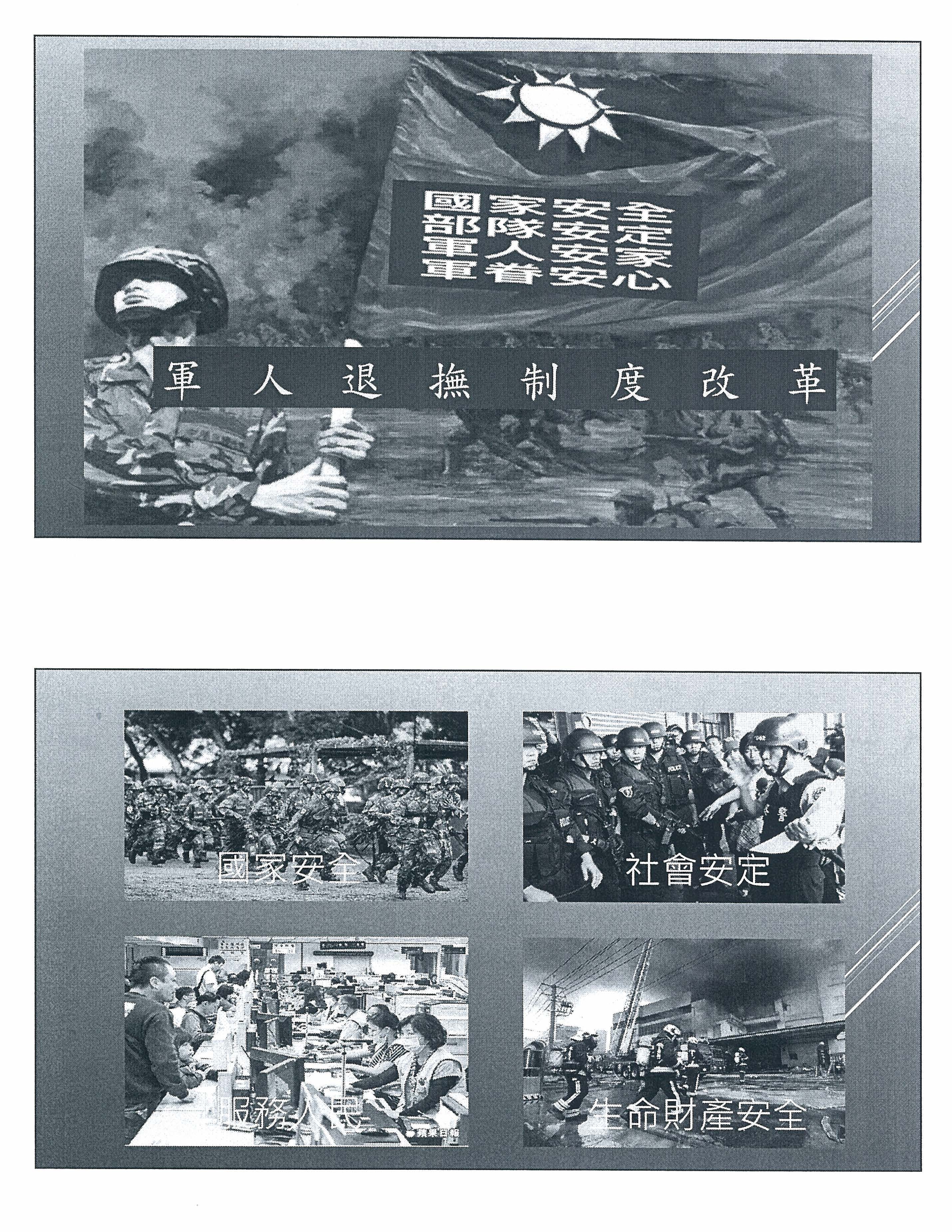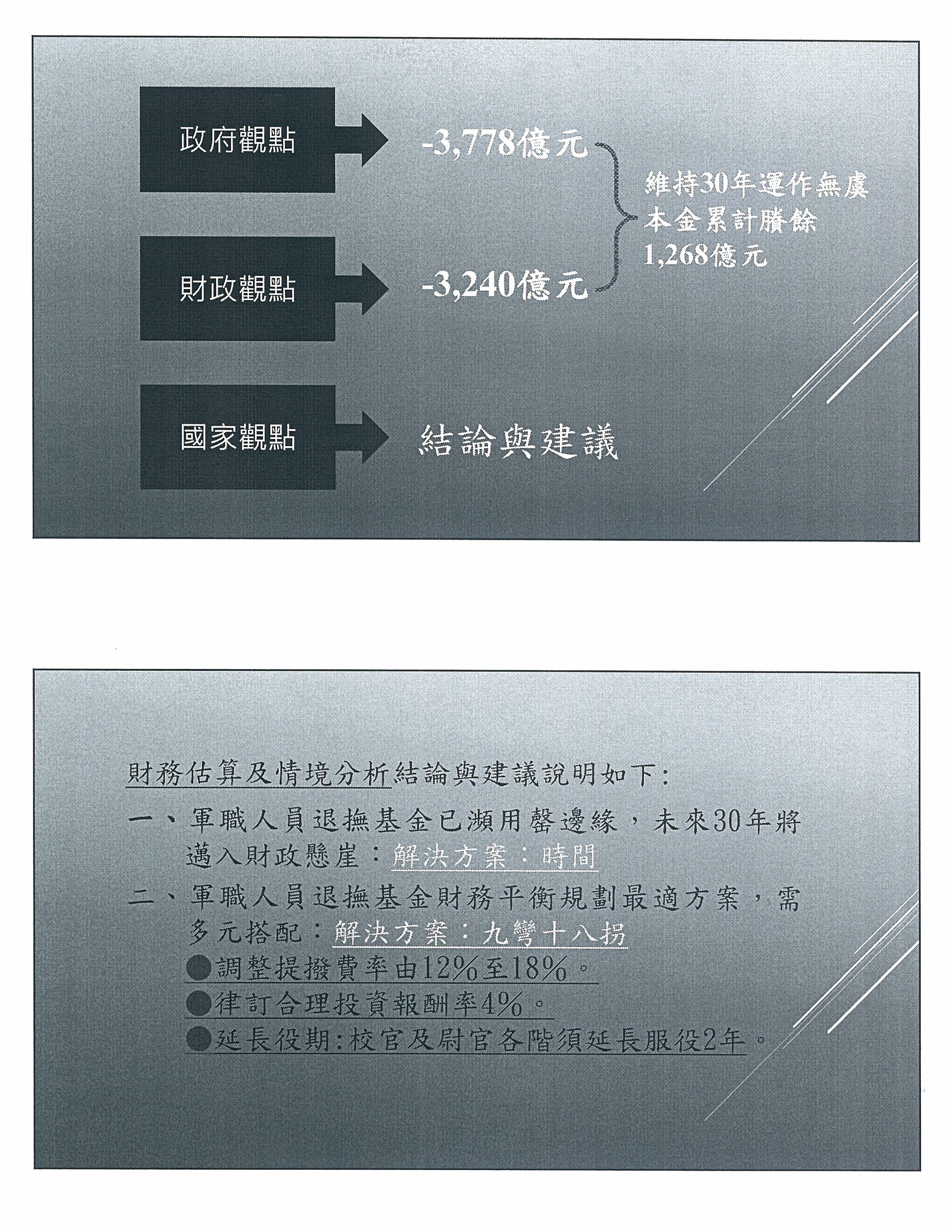 第二從年金退伍基金的資料來看,30年可以節省3240億元,等於一年才節省100億元,我們再回頭想一想,剛剛有幾位委員也提到現今的農保、勞保入不敷出的數據已經相當大,每年都由農委會跟勞動部編列公務預算來挹注差額,這筆差額的數據非常大,各位委員可以向上述這兩個部會調閱相關資料,加上最後有一句話:「不夠的錢政府要負最後的支付責任」,那我們退撫基金的法條也有這句話,為什麼同樣3個基金,只有農保、勞保可以用國家政府預算來挹注?為什麼退撫基金不夠的錢,國防部就不能編列預算來挹注?這讓我就感到非常痛心,我質疑為什麼不加以改革,因為每年只能減少支出100億元,在內容裡面你們也提到我的建議不必去調整,第一、可以把提撥率往上提升,第二、每年由國防部或退輔會編列100億元來挹注,這樣就不用耗費這麼大的工程,浪費社會這麼大的成本來修改陸海空軍軍官士官服役條例,既然已經退休了,就不溯及既往,但為了讓募兵制能招募到好的人員進來,所以要改也可以,只是要從優待現役改起,提高其待遇,以吸收精兵進來。至於86年以前的退役者,就統統不要動,這樣才符合大家的期望。謝謝。
