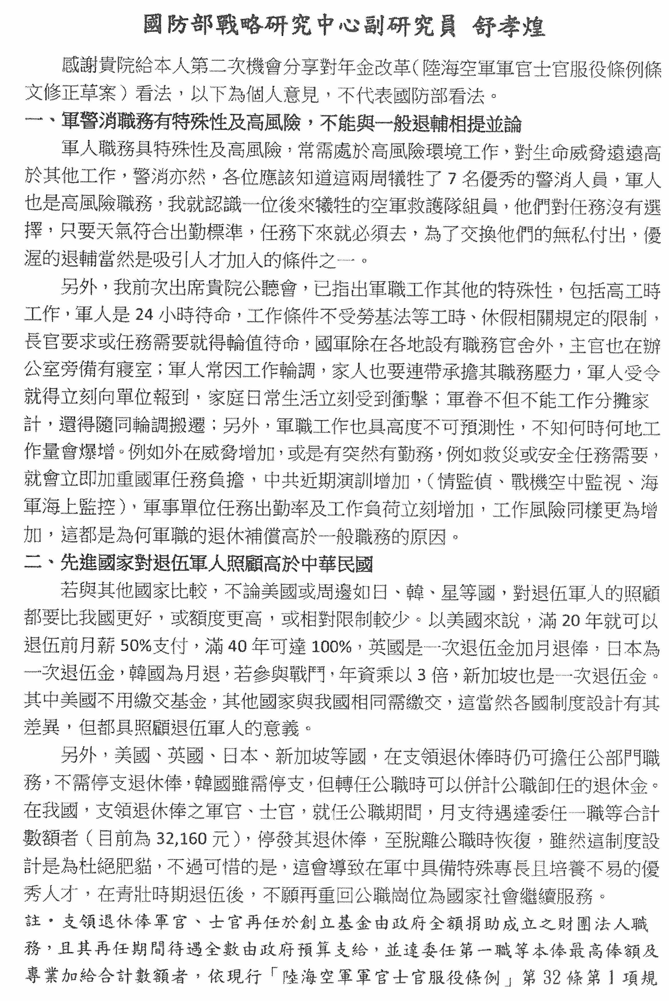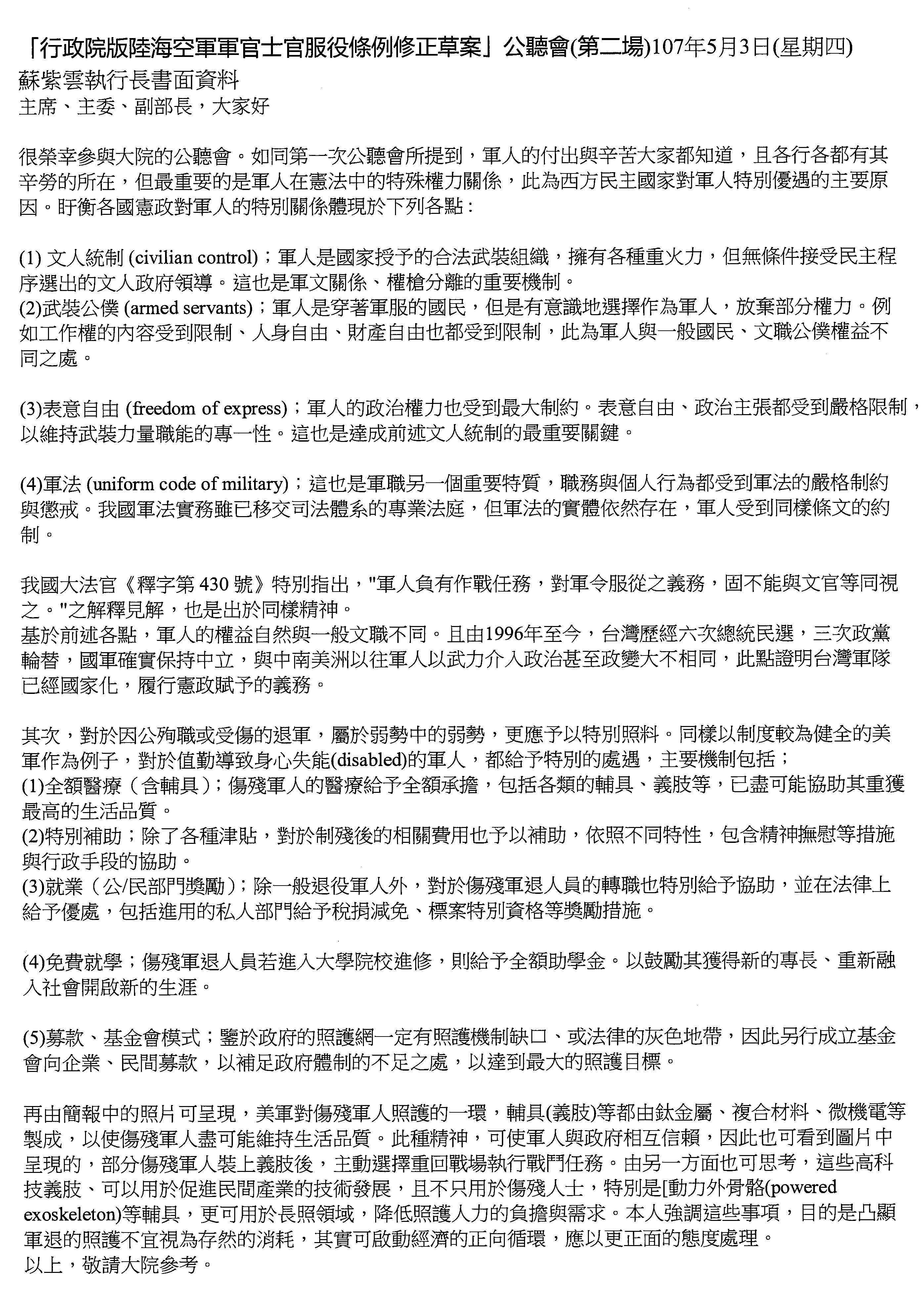 立法院第9屆第5會期外交及國防委員會「行政院版陸海空軍軍官士官服役條例修正草案」公聽會(第二場)學者專家發言書面資料