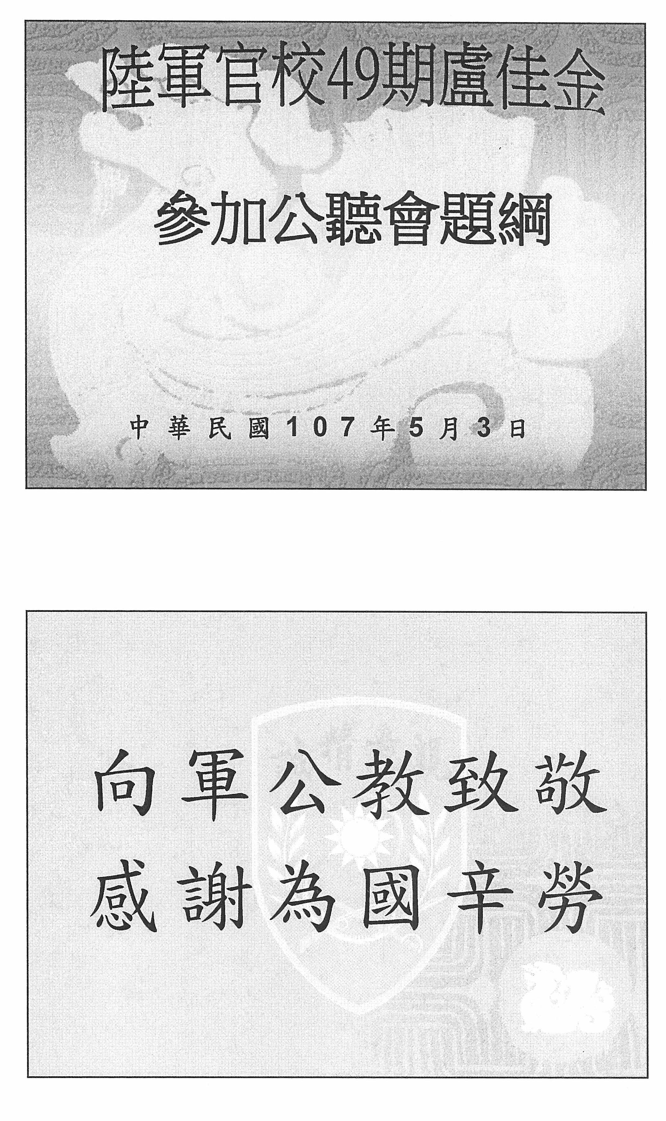 主席:請陸軍軍官學校第49期代表盧佳金先生發言。