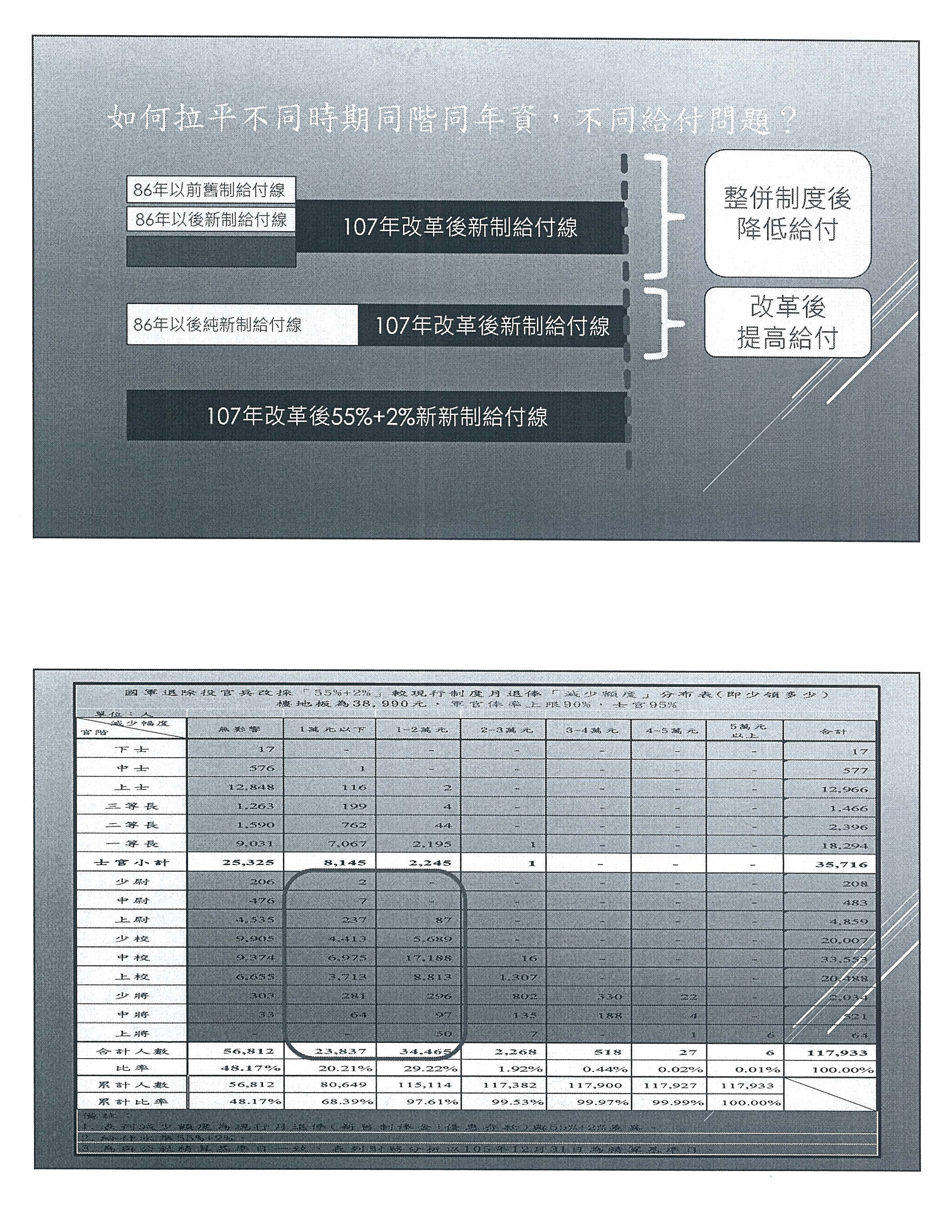 除此之外,以軍俸來看,改革版通過時,已退役和現役已滿20年者從舊,很多人不知道這點,其實那個影響又降低更多了,只有純新制、未滿20年者有被改變,而純新制、滿20年者也是按照舊制,也就是退休那天而已,採用最高的五分之一,所以其實多數也沒有影響到。由此可見,生活困苦者根本不在改變的對象,多數的軍人並沒有被改變。真正受到衝擊的是適用86年以前舊制的中、上將,而86年以後的則是變得更好,當然,我們希望能夠把中、上將所受到的衝擊降到最低。