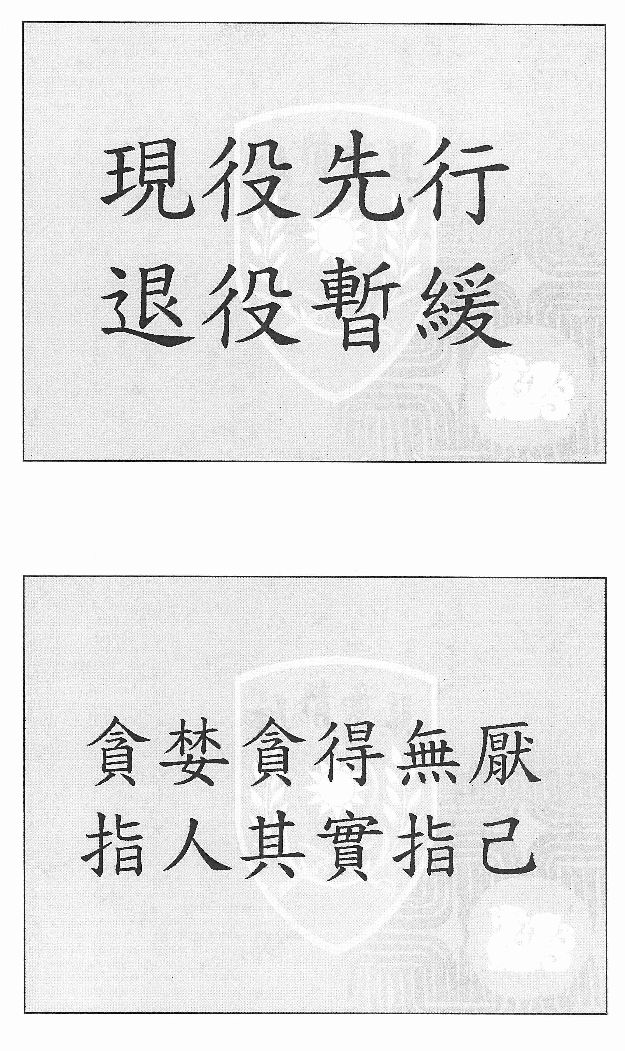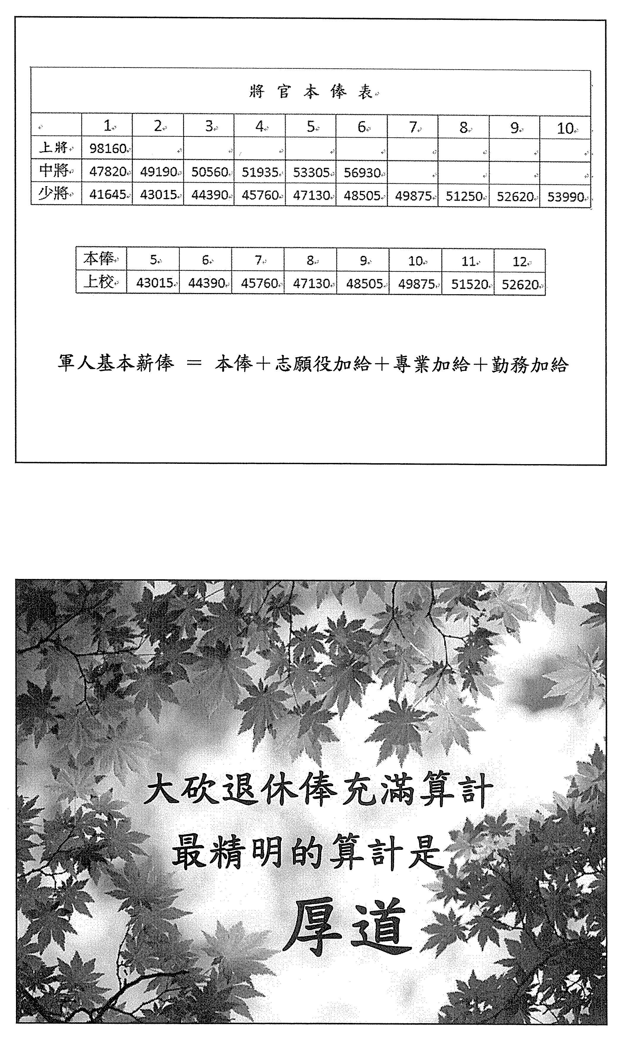 接著我要提到第二點,我覺得那真的是不合理到了極點,我不曉得你們有多少人曾經仔細看過,未來所有人的終身俸是用本俸計算,上將是9萬8,000元,中將就只到6級,少將從4萬1,000元一直到5萬9,000元,所有在座的將軍都是按照這個算。接著看到上校12級是5萬2,620元,比中將4級還要多,和少將9級是一樣的,這是公平的嗎?你們認為公平嗎?如果軍人薪資按照這樣的標準發的話,這是一個什麼樣的世界?我當初看到我根本不信,怎麼會按照這麼不公平的數字,所以我打電話問了很多人,以為有什麼很好的道理能夠讓我說不出話,問的結果是統統不知道為什麼,當初就是這樣。當然你說這樣退伍,那誰要當中將?原來所有軍人的基本薪資是「本俸」加「志願役加給」加「專業加給」加「勤務加給」,所有軍人將這四項相加後,薪資就變成非常地合理,就會愈高。因此我第二個建議是,能否藉這次機會將不合理的現象刪除,就是所有的收入計算能夠按照本俸、志願役加給、專業加給及勤務加給作為基礎,不要用本俸,這沒有道理。而且很多人可能不知道,現在很多加給都加在志願役加給、專業加給及勤務加給,根本不照顧退伍軍人,很少調整本俸,這是他們取巧的地方。