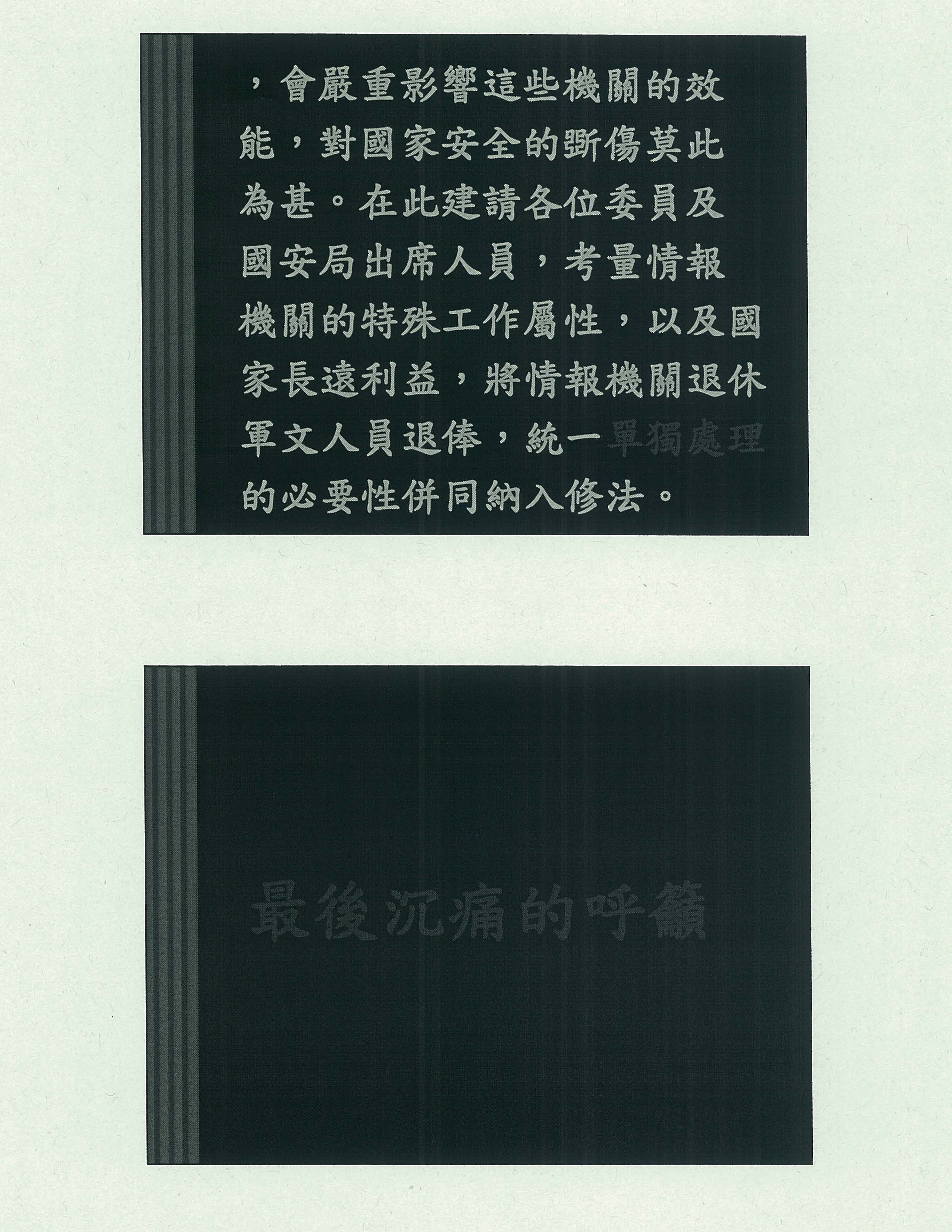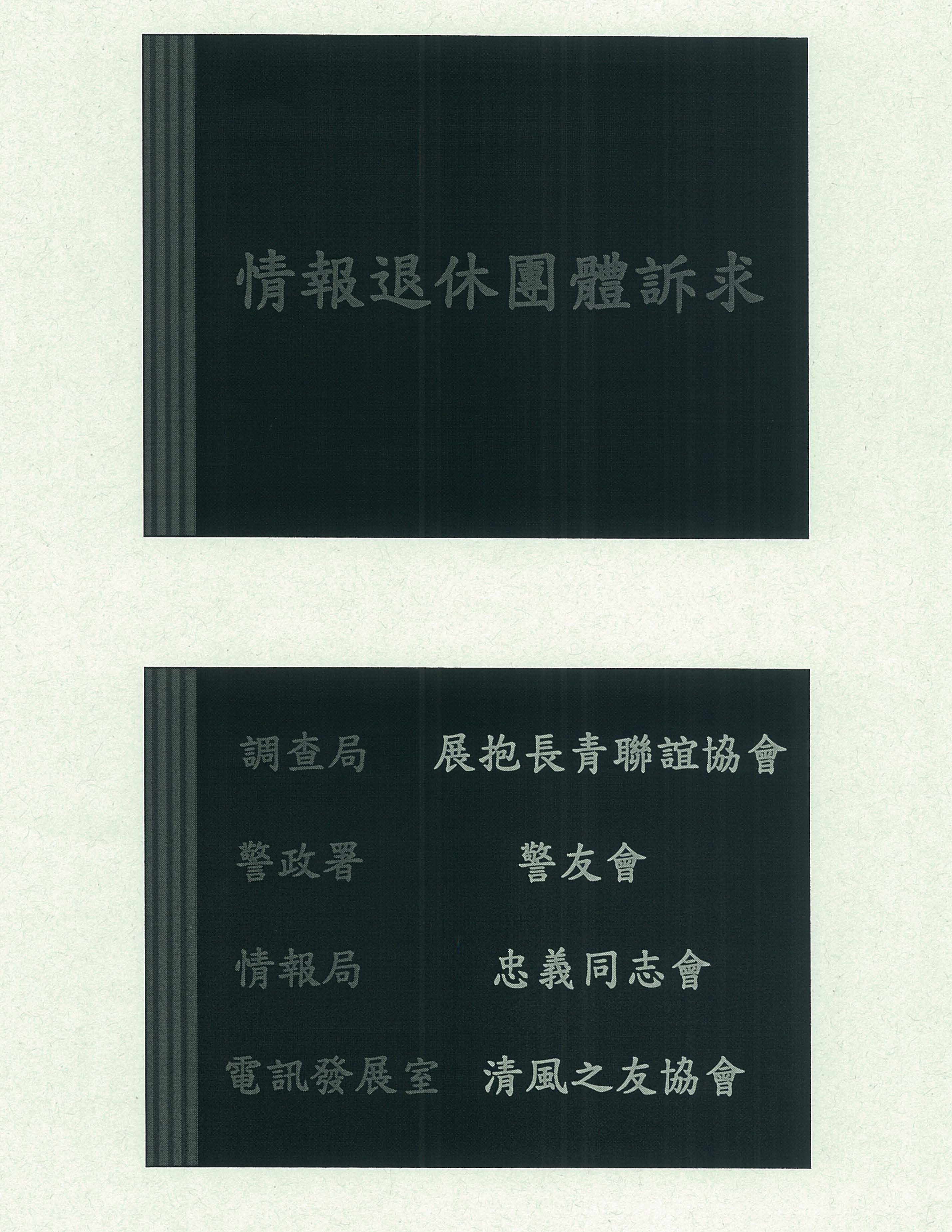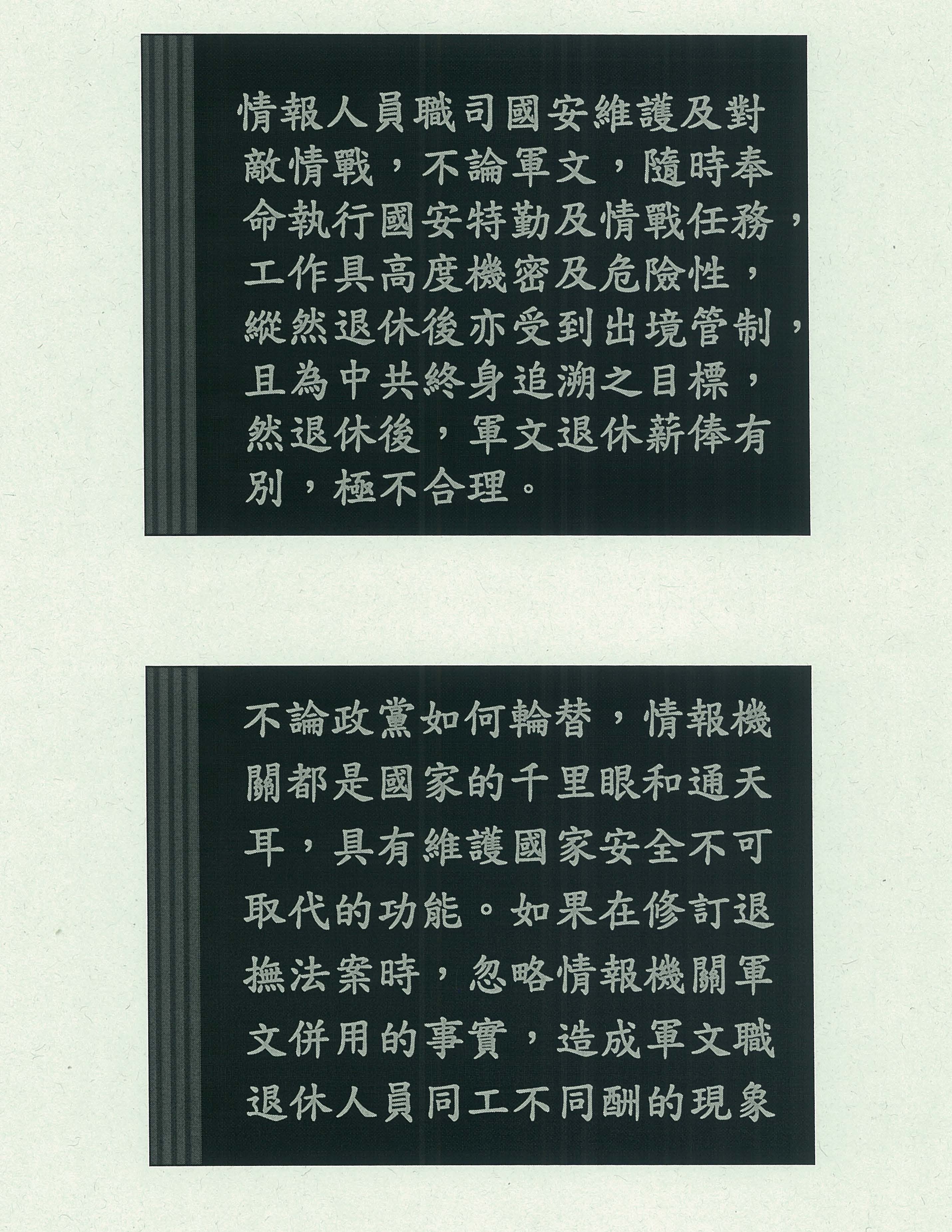 今天情報退休團體的訴求,我今天代表調查局、警政署、情報局及電訊發展室等四個退休協會到此發聲。我們的宗旨是「情治一家、如兄如弟;情治一體、如手如足」,我們絕對不會背棄同一個戰場上的弟兄。由於歷史的因素及工作特殊需求,我國若干情報單位成軍以來,就採用軍文並用制度,如國安局、情報局、調查局、警政署為文職機關,但工作性質與任務完全都是一樣。情報人員職司國安維護及對敵情戰,不論軍文,隨時奉命執行國安特勤及情戰任務,工作具有高度的機密及危險性,縱然退休後亦受到出境管制、終身追溯,軍文退休後薪俸有別,非常地不合理。