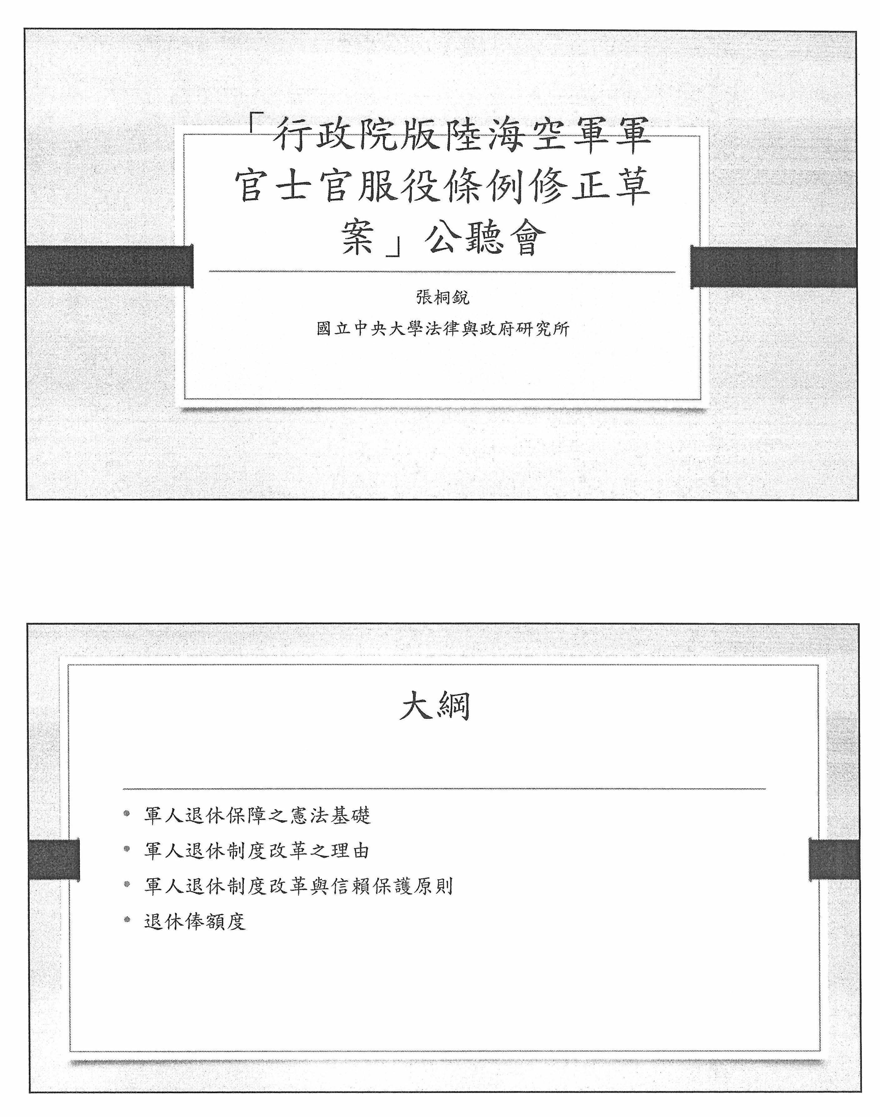 張桐銳副教授:主席、各位委員。很高興有機會來此針對年改有關軍人退撫制度這部分表示意見。因為時間有限,而且主辦單位給的三個題目都是很大的題目,無法在此一一說明,我只挑了幾個重點做簡單的報告。