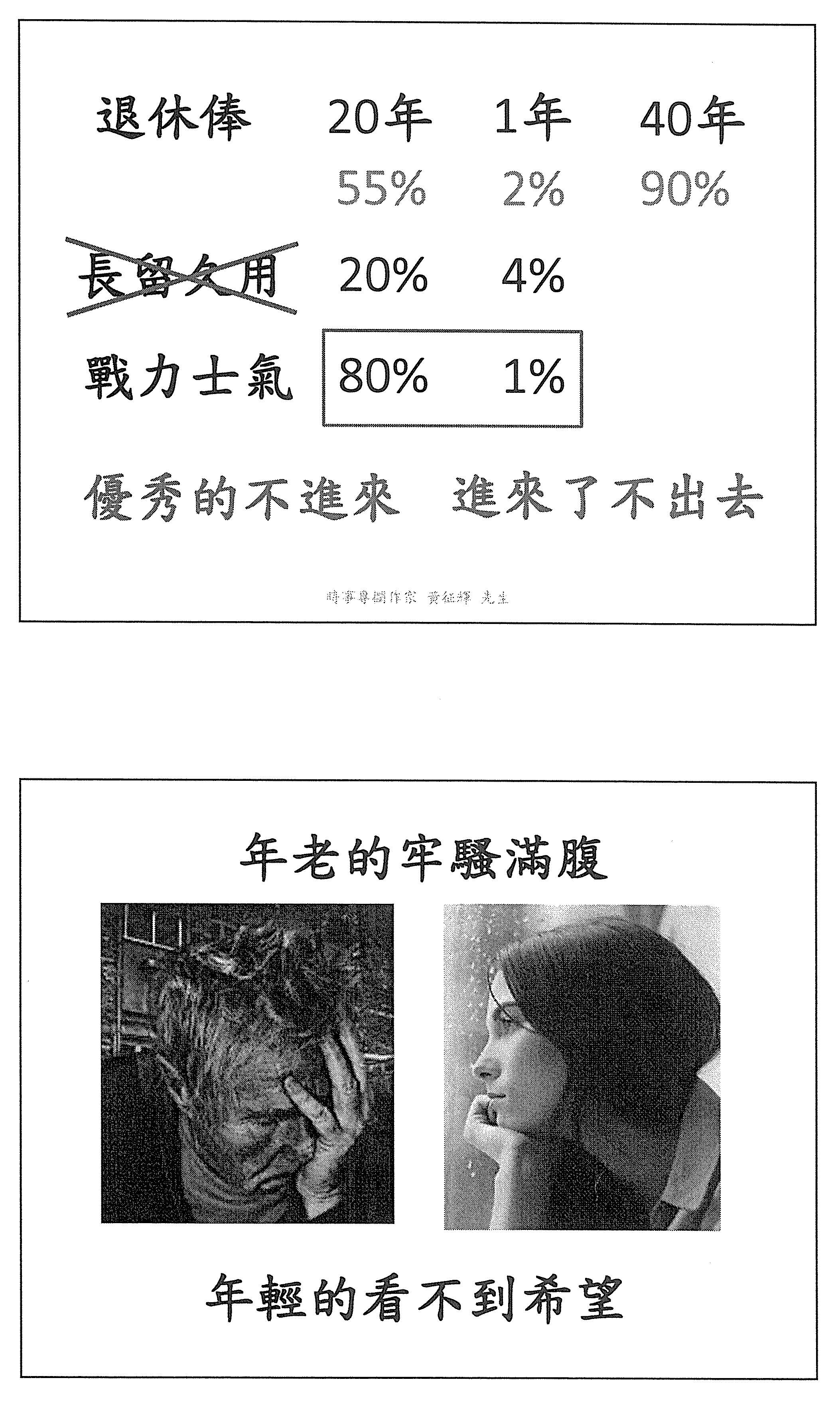 可是目前我們取的是中間值,我現在就可以預料,取這個值的結果,大家走著瞧,以我對軍中的了解,第一個現象就是優秀的不進來,目前軍改版本是所有軍官的終身俸從1萬5,000元砍到4、5萬元,原來的待遇已經沒有很多人要進來了,再砍下去,優秀的人怎麼會進來?或者是進來了不出去,為什麼要退?要知道,只要多留1年大概可以增加終身俸3,000元,這樣怎麼會走呢?以前去勸退的時候,因為錢沒有差很多,現在留1年增加3,000元,就有充分理由不走了。這個所得到的結果就是5年之後,軍中年老的牢騷滿腹,你們以為他留在那裡會很高興嗎?他會說是這個制度要我留下來的,我根本不想留,可是沒辦法,我必須為了錢留下來,所以牢騷滿腹,然後年輕的也看不到未來。在我那個年代,我們同學大概在37、8歲升到上校,但是5年以後、10年以後,你們走著瞧,37、8歲大概到少校就統統動不了,將軍更是,誰會早走?這是第一個。所以我給大家的建議是仔細考慮一下這個政策的結果會得到什麼,如果財政沒有困難,我還真的建議80%加1%,可能是對國軍戰力最有幫助的一個方案。
