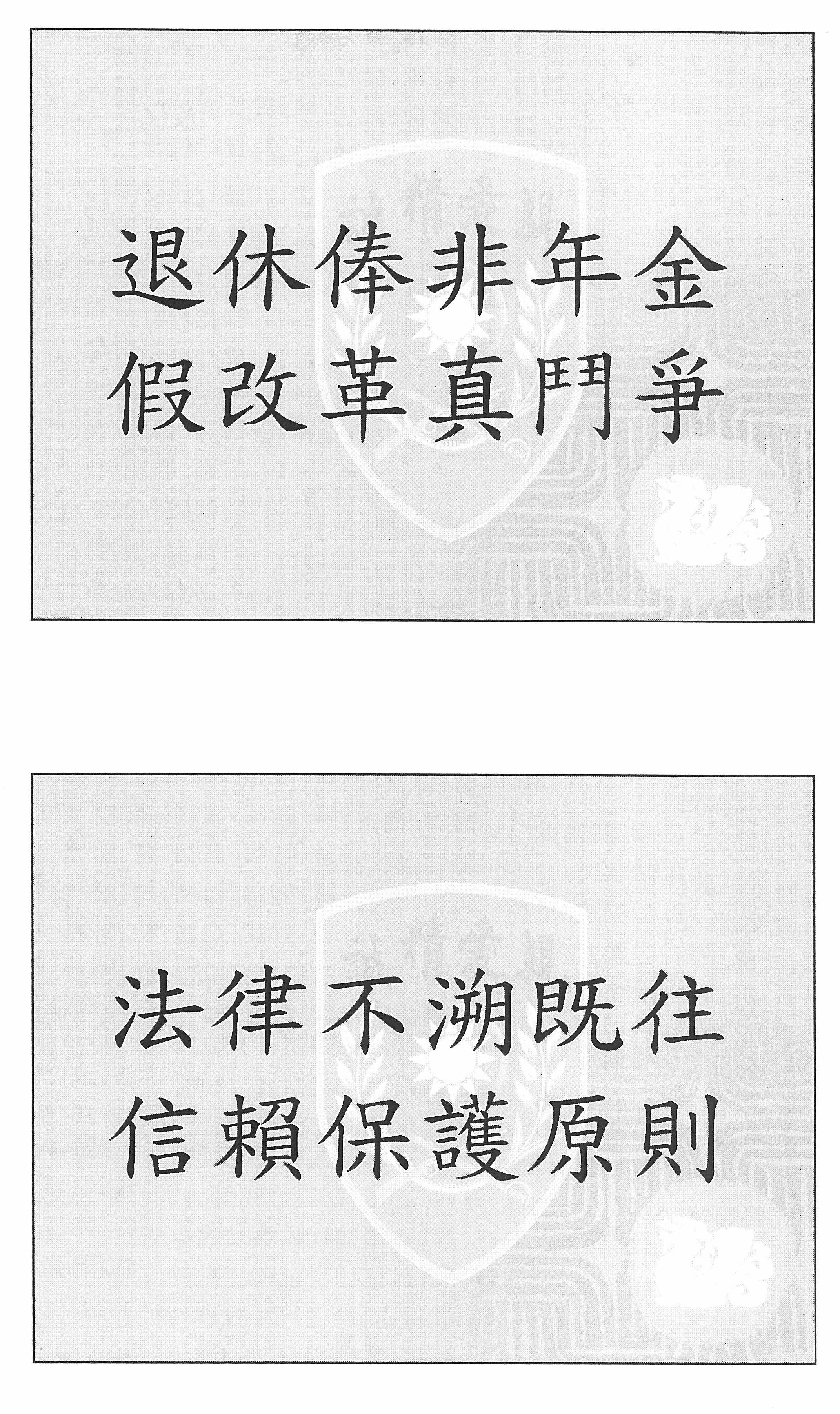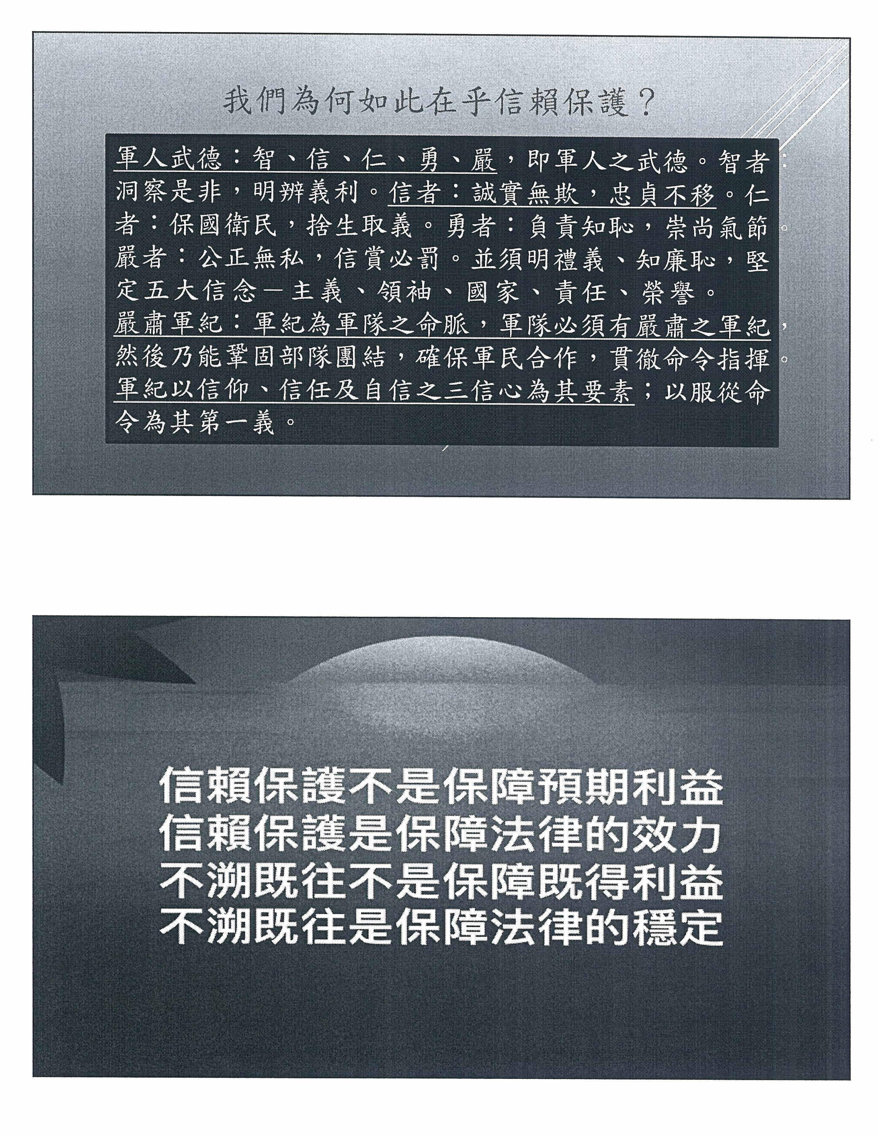 大法官釋字第555號解釋文述及,武職人員乃因其從事戰鬥行為或其他與國防相關之任務,攸關國家安全及軍事需要,且該等人員之養成過程、官階任用資格之年齡限制、陞遷條件及服從之義務等均與文職人員有別。軍人在服役期間根據國家政策與部隊任務從事各項工作,包括:操作危險價昂的武器裝備,各項裝備的維護、部隊戰力的訓練、戰術的精進、戰略的規劃、軍事科技的研發、軍事外交的推展、國家建設的參與,還有重大災害的防治與救援。軍人甘冒失去生命或成為殘廢的巨大風險,絕對的服從、絕對的貫徹命令,政府當然要忠實的履行對軍人照顧的承諾。我們為什麼如此的在乎信賴保護原則?因為教戰總則、軍人武德告訴我們:智、信、仁、勇、嚴,信者誠實無欺、忠貞不移,嚴肅軍紀也告訴我們,軍紀是軍隊的命脈,軍隊必須有嚴肅的軍紀,軍紀以信仰、信任及自信三信心為其要素,何謂信仰?信仰領袖。何謂信任?信任部屬。何謂自信?自信我們是一個負責任、守紀律的軍人。信賴保護非保障預期利益,而係保障法律效力!至於不溯既往也非保障既得利益,而是保護法律的穩定!為何我們如此在乎不溯既往?這到底是既得利益,抑或既得權益?我們是預期不利益,還是預期有利益?其實我們所要求保護的是:我已經依據國軍定頒的法律規定完成了學力、經歷,並按國家規定調外島、調本島、輪調,也服完法定役期,非個人從軍會有預期利益!因為我們從軍所預期的是:為國犧牲的不利!美國退撫軍人改革方案中提到,無法保證每一個軍人能夠服滿20年役期,但凡跨過門檻支領退休俸者,就一定給予保證!商業保險有保險安定基金,金融存款有中央存款保險,以保障私人保單與存款權益,但政府負最後支付保證責任的退撫基金又給了我們什麼?各國政府在推動退休金時都會提出三層次保障,我國也有三個層次,這點我就不再贅述。