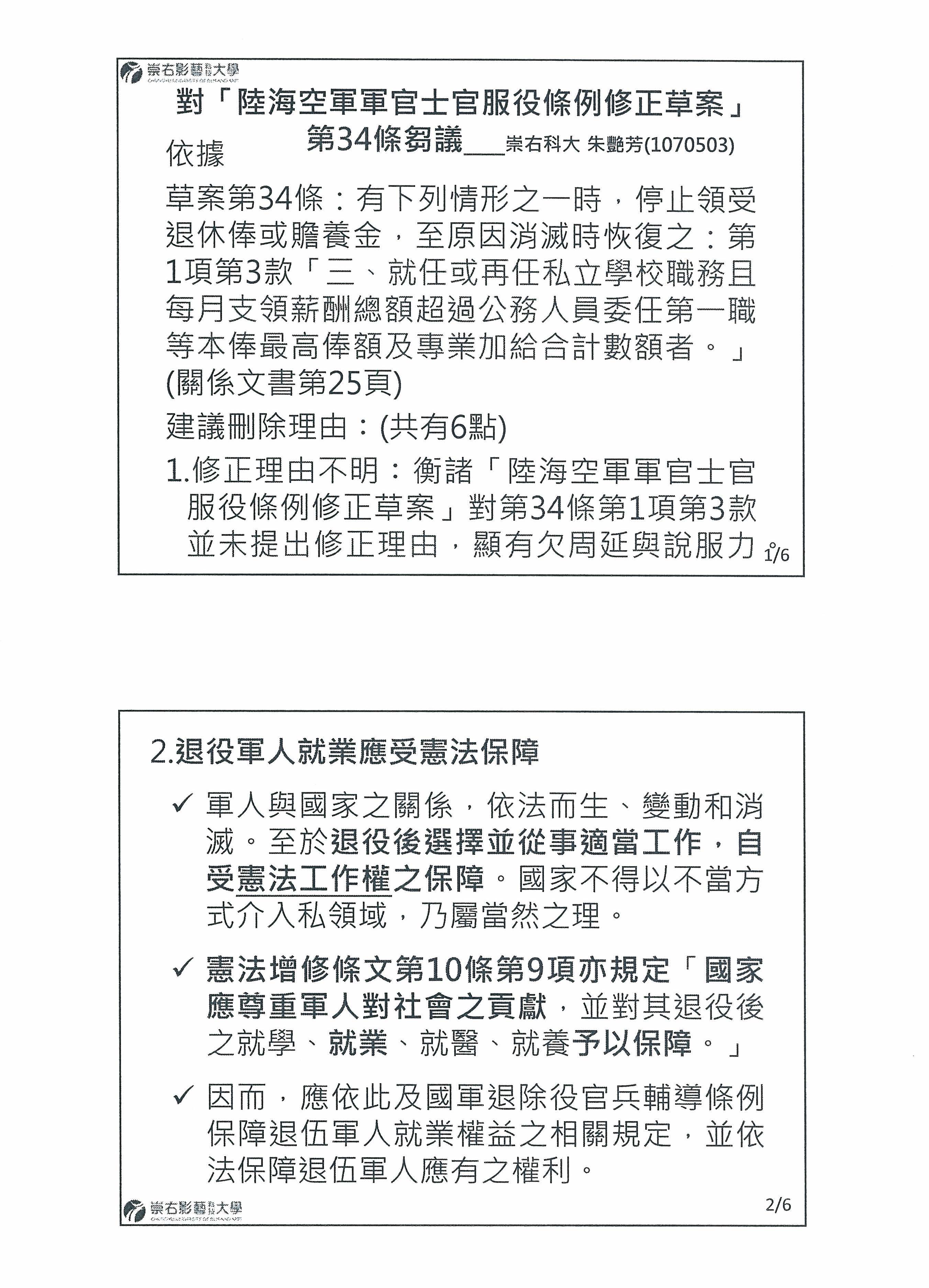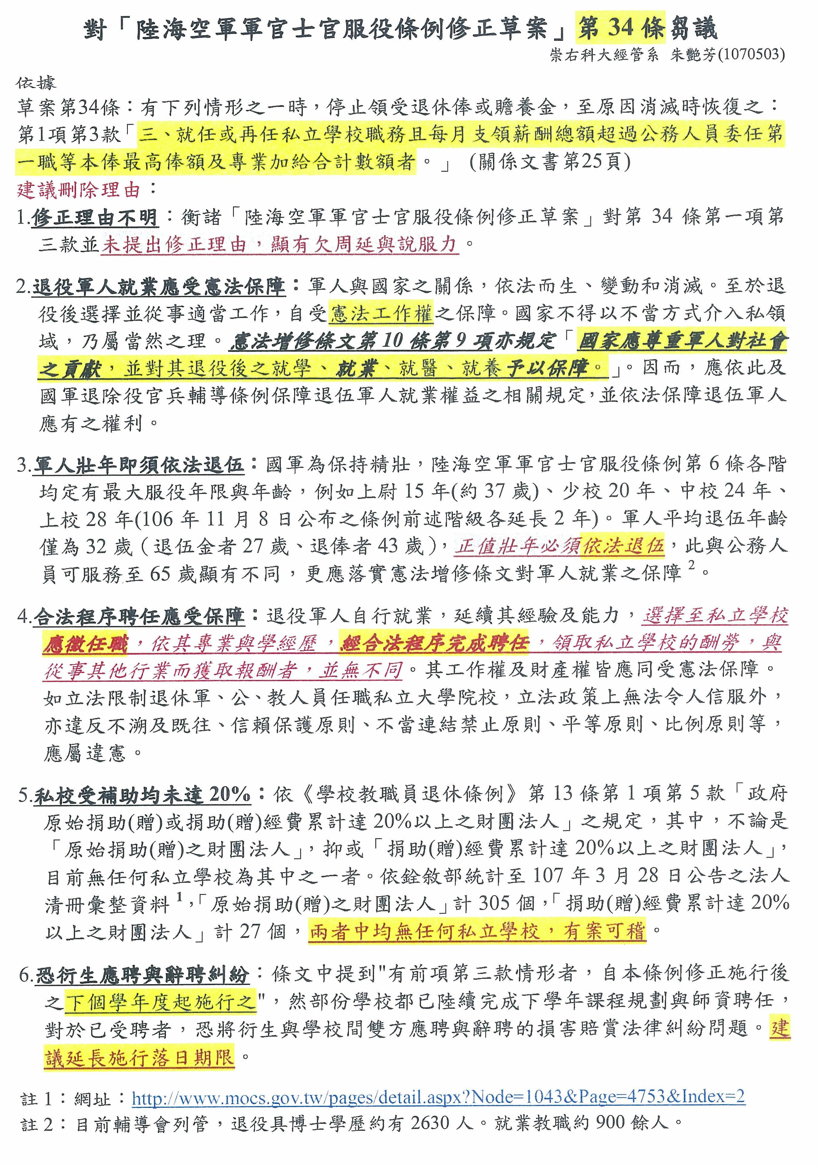 在依據草案第三十四條規定,有下列情形之一時,停止領受退休俸或贍養金。我要強調這是退休俸或贍養金,是我之前盡義務應該得的結果,但就任或再任私立學校職務且每月支領薪酬總額超過一定極限,即停止領受退休俸或贍養金。我建議必須刪除這個規定,刪除理由有六點,第一點,修正理由不明,本條款並未提出明確的修正理由,顯有欠周延與說服力,在第25頁至第27頁有針對這一條說明,但未針對這一款項做說明,我希望有個答案;第二點,退役軍人就業應受憲法保障,軍人與國家有一定關係,至於退役後從事適當工作,自應受到憲法工作權之保障,不應介入私領域剝奪。憲法增修條文提到國家應尊重軍人對社會之貢獻,我沒有貢獻但至少有苦勞。另,憲法亦規定國家對軍人退役後之就業予以保障,因此應保障退伍軍人應有的權利,不能剝奪我的工作權利;第三點,軍人壯年即須依法退伍,剛剛前面很多學長也提到,軍人和一般民眾是不一樣的,國軍為保持精壯,所以在服役條例中各階均訂有最大服役年限與年齡,最近雖有延長2年,但現在軍人平均退伍年齡僅32歲,有些短役期領退伍金者平均27歲,目前討論的對象─領退休俸或贍養金者平均43歲必須依法退伍,不能繼續工作,我現在找到其他工作,你說不可以,顯然我軍人的就業保障受到剝奪,這一點我覺得可能要審慎、明確地告訴我們,為什麼你要立這一條條文?