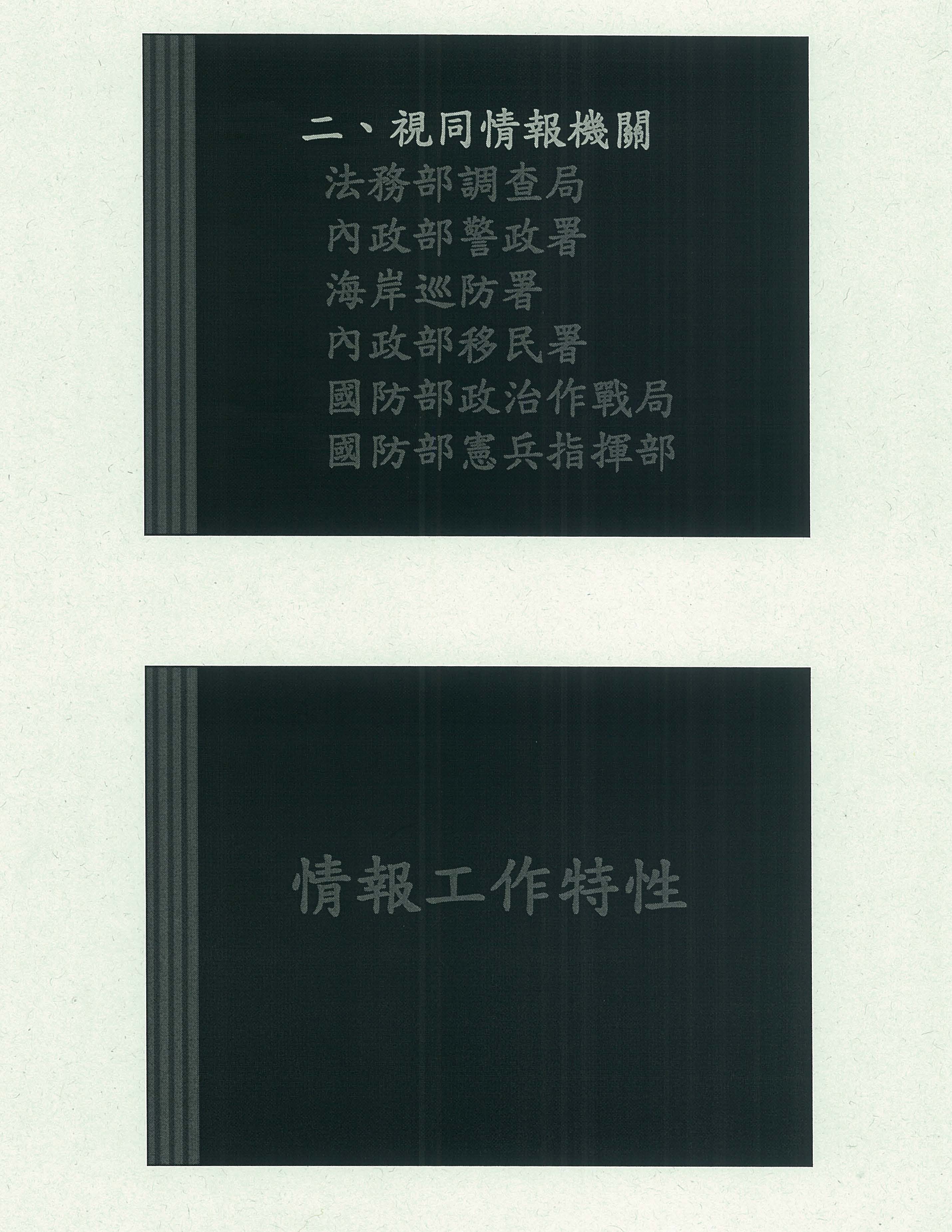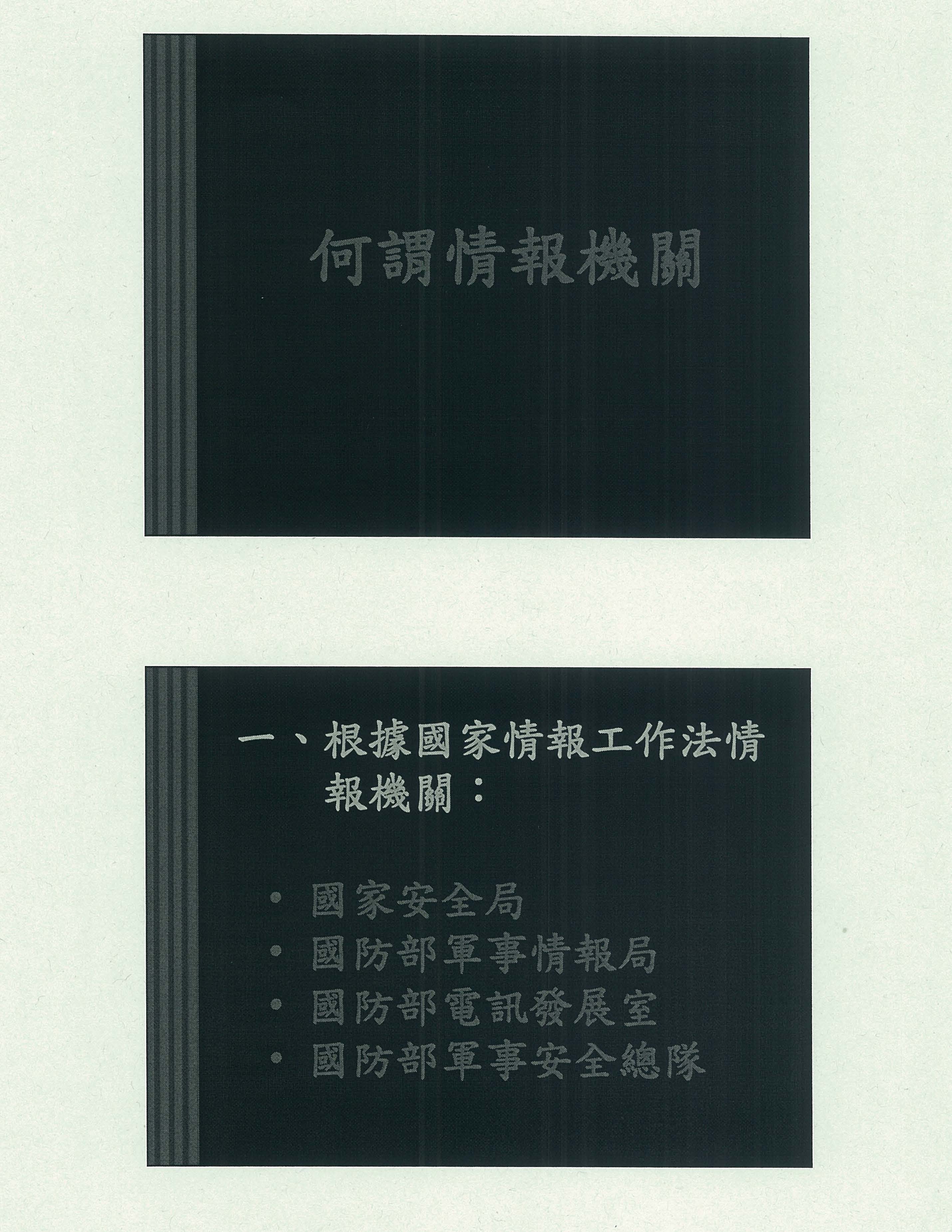 我進入我的本題,我先定義什麼是情報機關?根據國家情報工作法,情報機關有四個指定機關及法定機構,即國家安全局、國防部軍事情報局、國防部電訊發展室及國防部軍事安全總隊;視同情報機關的有調查局、警政署、海岸巡防署、移民署、國防部政治作戰局與憲兵指揮部。