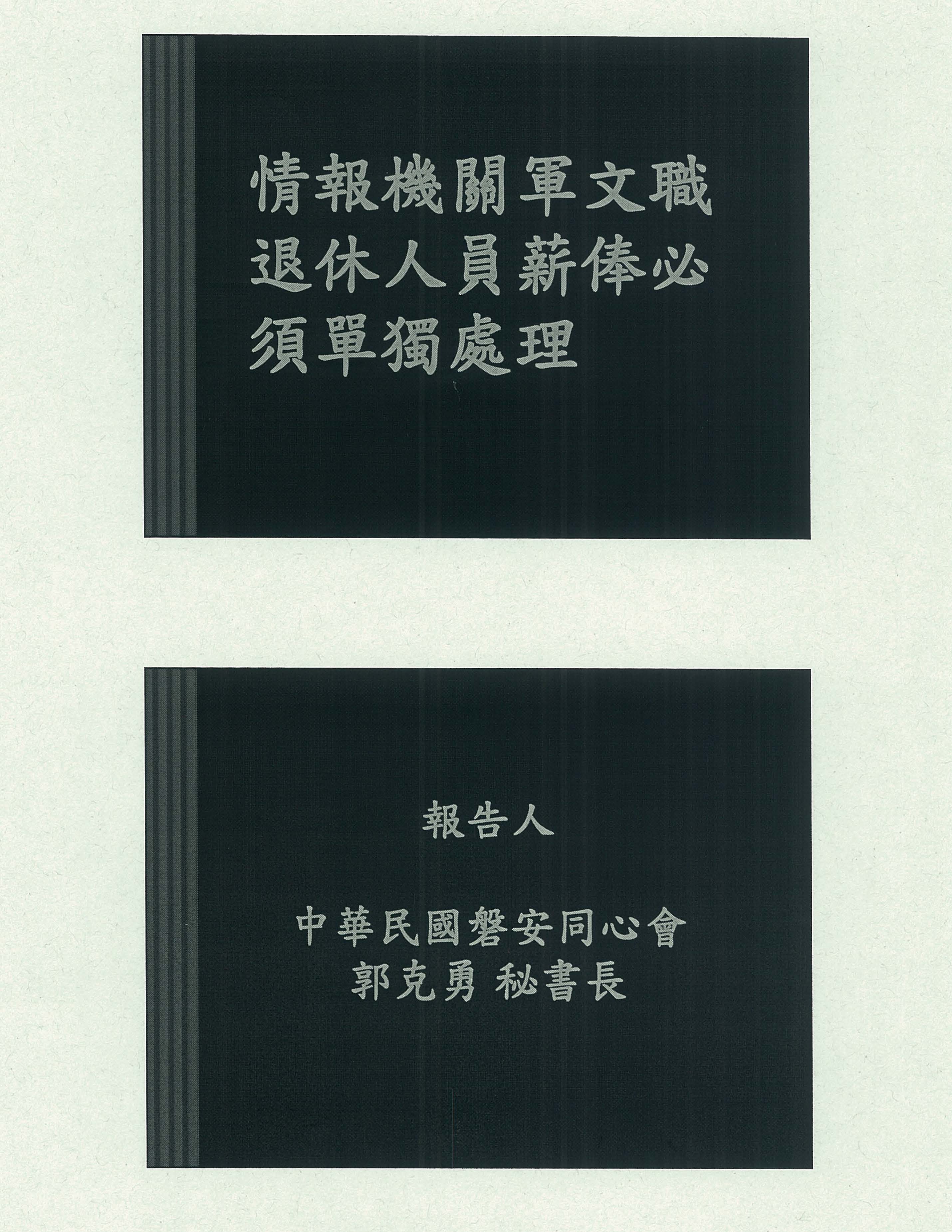 郭克勇秘書長:主席、各位委員。我是中華民國磐安同心會秘書長郭克勇,最後一個軍職的職務是國安局派駐新加坡的組長,今天想利用這個機會為沈默的大眾,即情報人員講幾句話,我今天報告的題目是「情報機關軍文職退休人員薪俸必須單獨處理。」