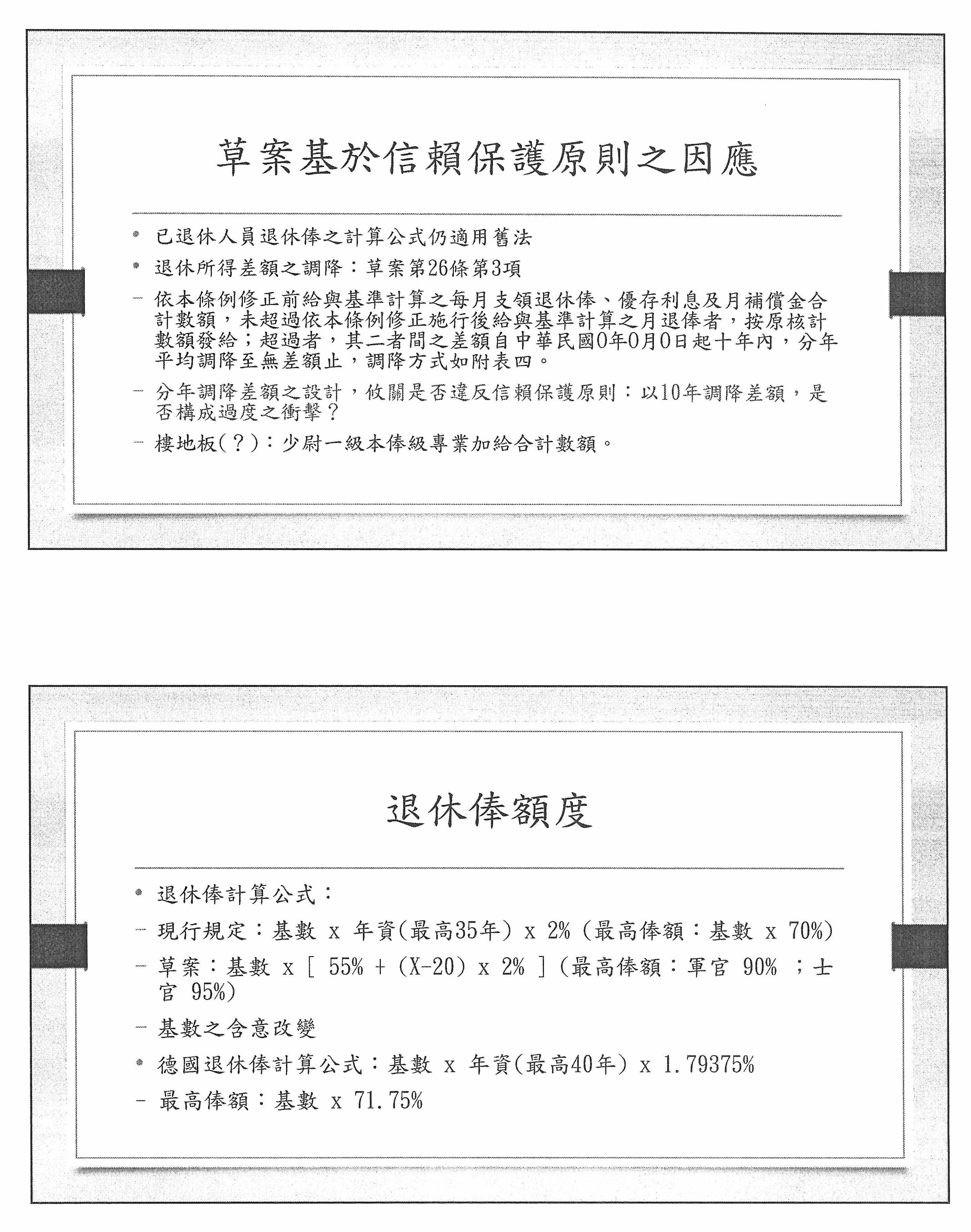 最後我針對退休俸做一個比較。現在的舊制是70%,新制最高可以到90%,甚至到95%。我們對比德國,德國一年的基數是1.79375,40年年資最高是71.75%,相較之下,我國軍人在國際上做比較其實並不差,以這次年改而言,對於公務員的部分已做大幅度調降,軍人部分其實改變不是太大。