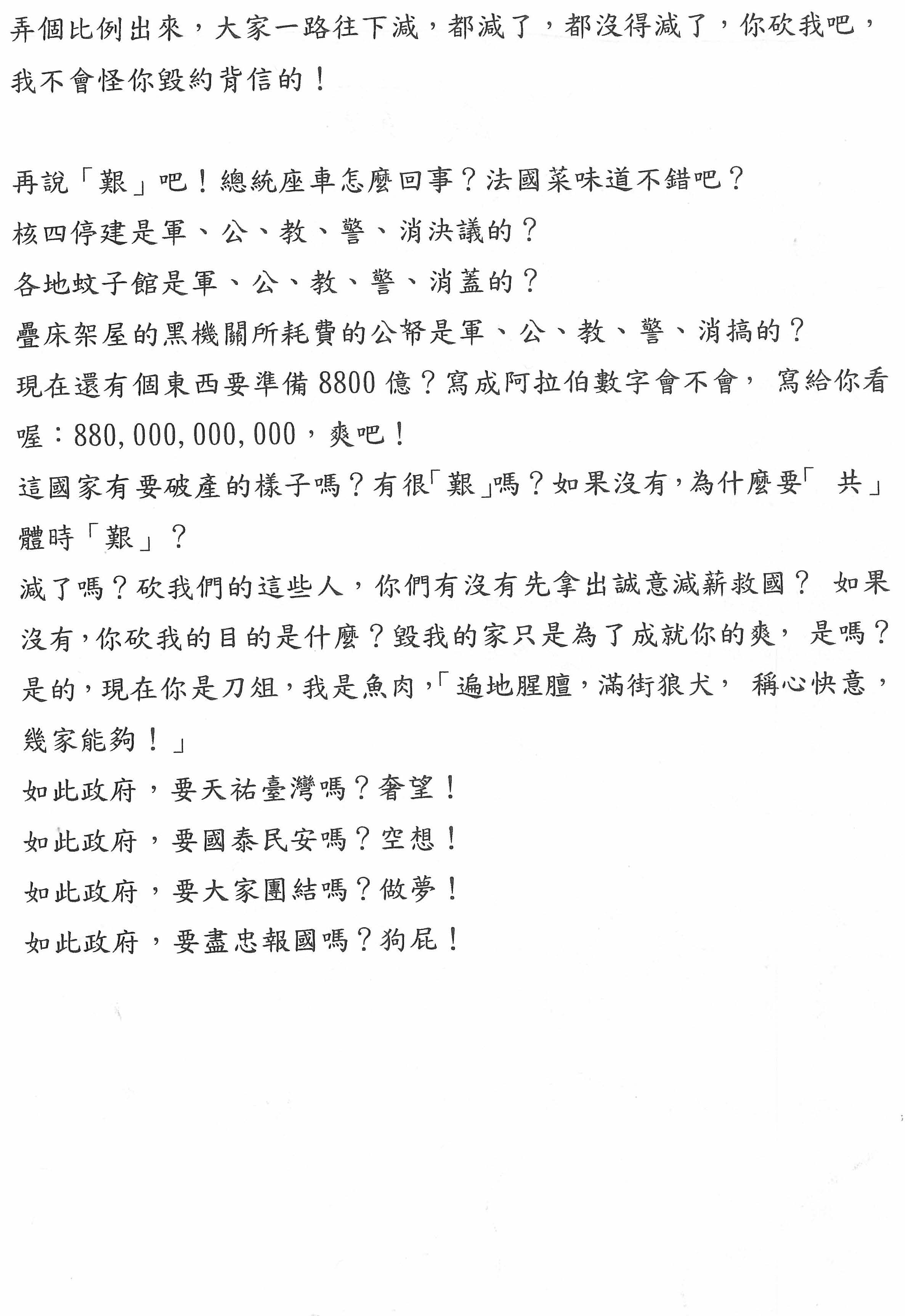 減了嗎?砍我們的這些人,你們有沒有先拿出誠意減薪救國?如果沒有,你砍我的目的是什麼?毀我的家只是為了成就你的爽,是嗎?是的,現在你是刀俎,我是魚肉,「遍地腥膻,滿街狼犬,稱心快意,幾家能夠!」如此政府,要天祐臺灣嗎?奢望!如此政府,要國泰民安嗎?空想!如此政府,要大家團結嗎?做夢!如此政府,要盡忠報國嗎?狗屁!