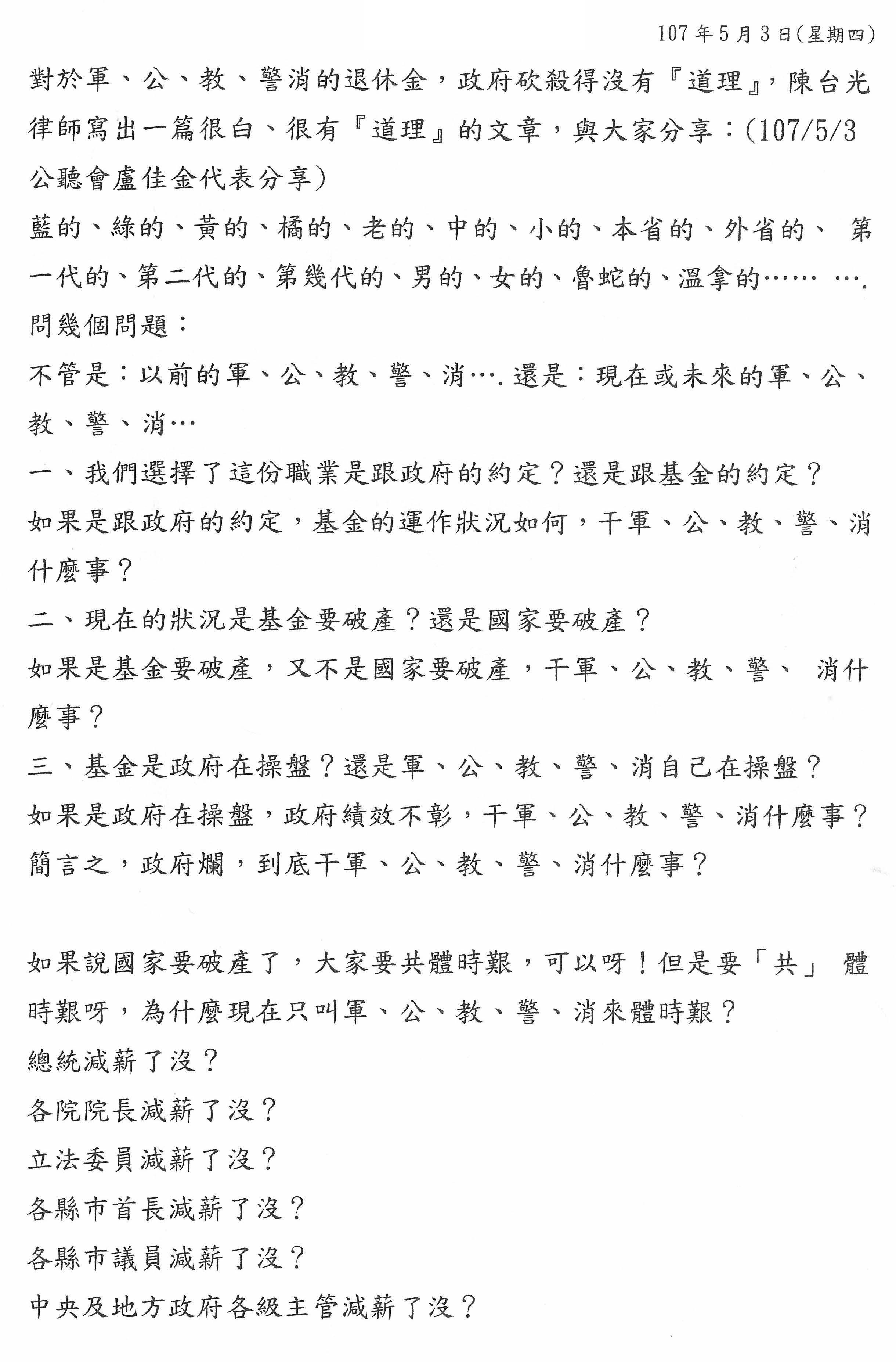 對於軍、公、教、警、消的退休金,政府砍殺得沒有『道理』,陳台光律師寫出一篇很白、很有『道理』的文章,與大家分享: