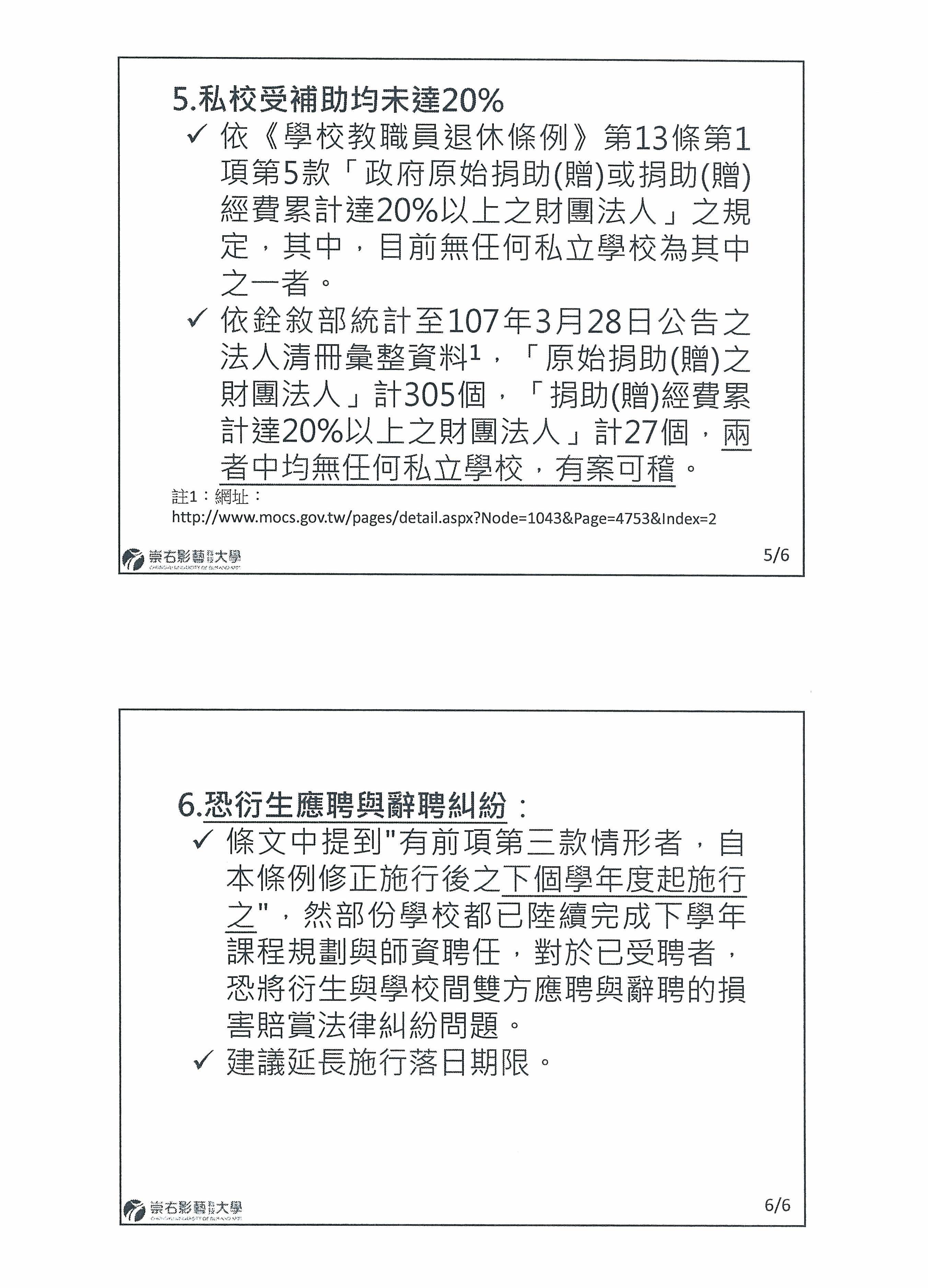 假設最後不幸法案通過了,有一點大家要想想看,會衍生應聘與辭聘的糾紛,前面剛剛談到了,條文中「前項第三款的情形」者,自本條例修正施行後之下個學年度就開始施行,什麼時候?如果法案7月通過,8月1日就生效,但是很多學校目前已經完成下個學年度的課程規畫與師資聘任,我知道先期很多學長到學校擔任校長等重要的職務,一聘可能兩到三年,你現在叫他8月1日不能工作,因為工作就是違法,可能會衍生個人與學校之間雙方應聘與辭聘的損害賠償糾紛問題。所以我說,萬一不幸真的這一條文通過了,我建議延長施行落日期限,公教年金改革去年通過了,8月1日生效也許還說得過去,現在是這個月通過,下個月生效,這不是強人所難嗎?符合法理的規定嗎?今天在座不管是教育部的官員或是關鍵的立法委員,好好想想看,這個法案通過會影響後面的人,對後面的人影響深遠,好好省思一下。謝謝!