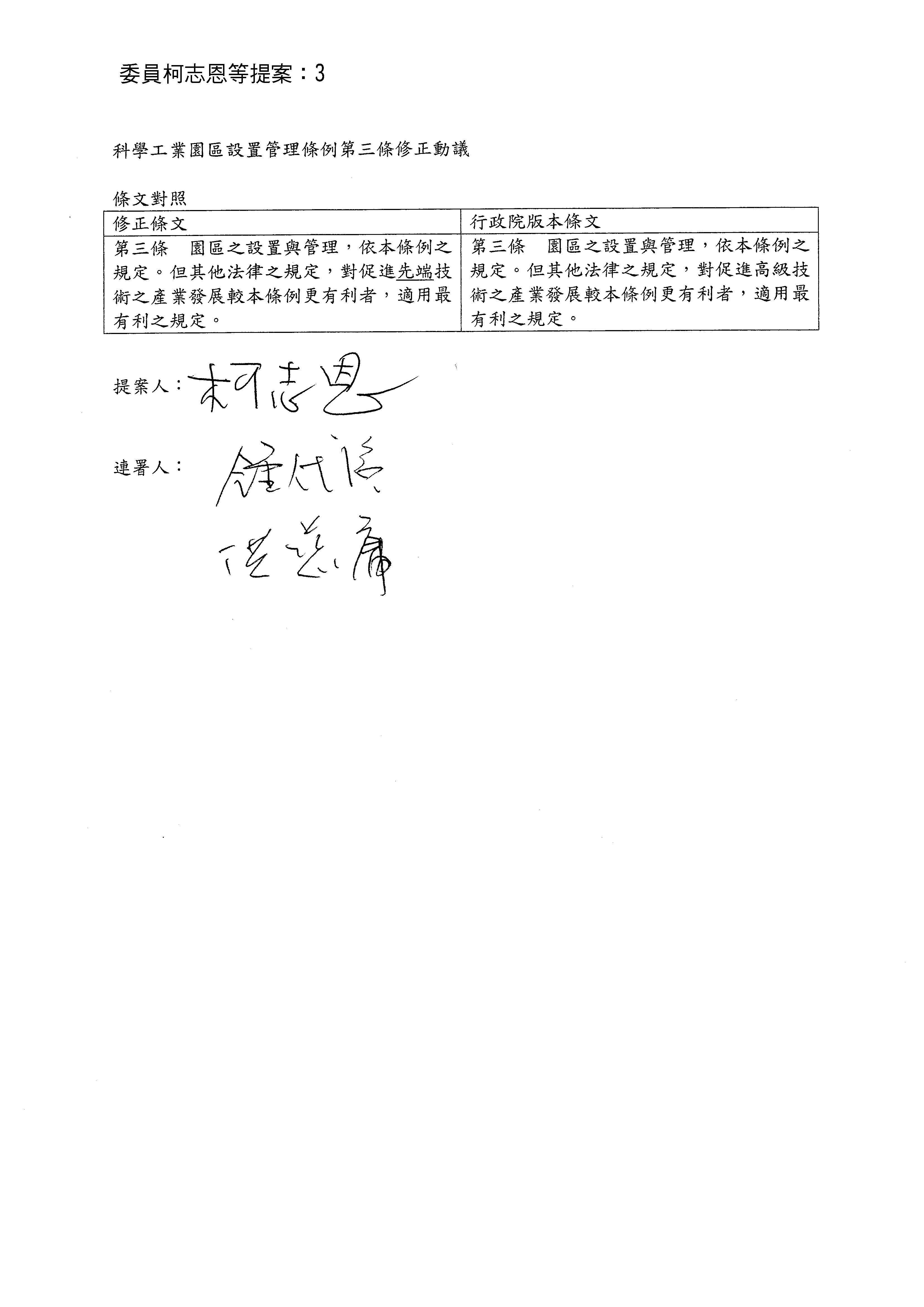 處理第三條。我們看一下行政院的提案條文,柯志恩委員有提出修正動議,修正內容為:「園區之設置與管理,依本條例之規定。但其他法律之規定,對促進先端技術之產業發展較本條例更有利者,適用最有利之規定。」,原條文是用「高級技術」,委員是建議修正為「先端技術」。