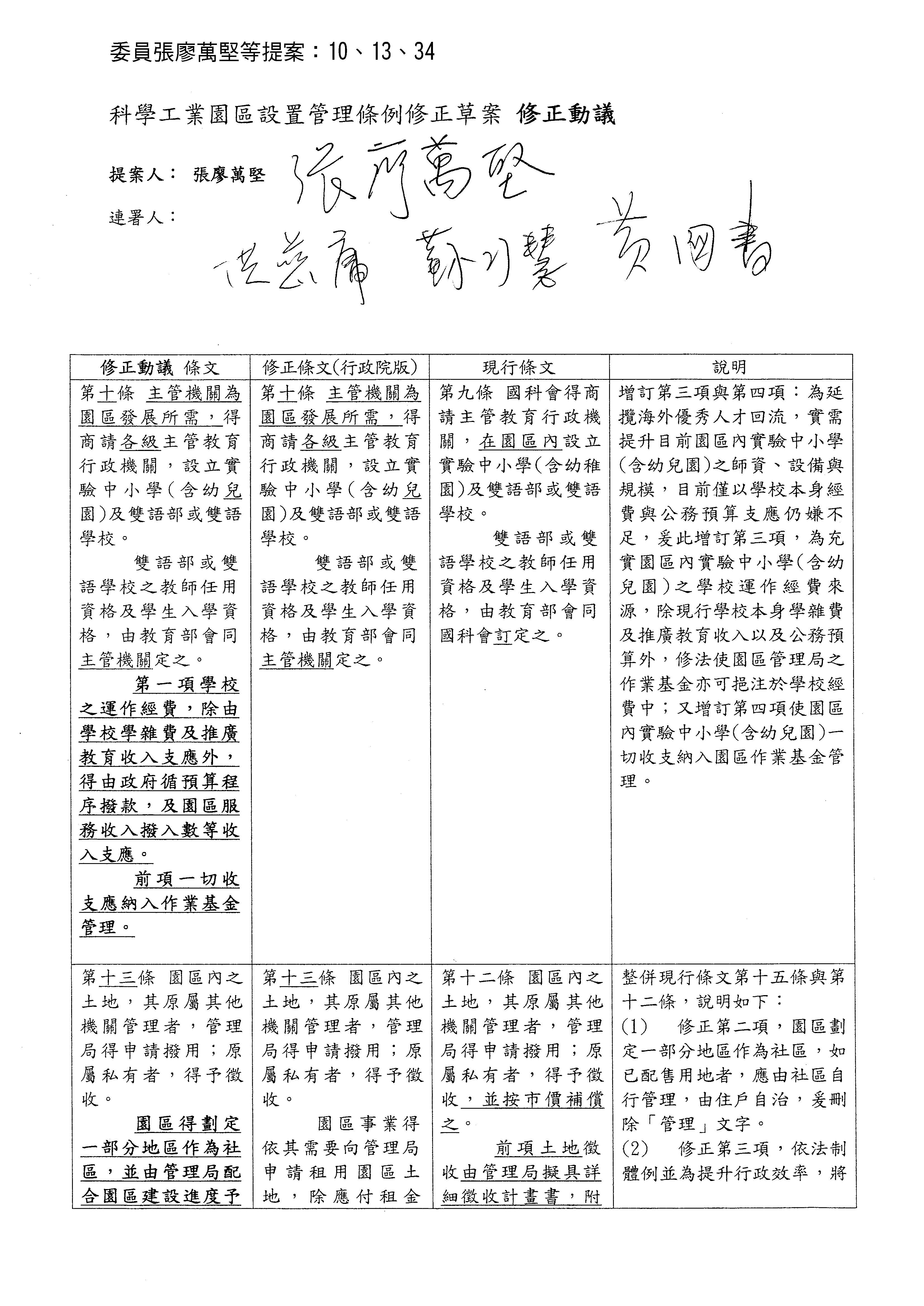 張廖委員萬堅:早上我已經講過了,我增加了第三款和第四款──「第一項學校之運作經費,除由學校學雜費及推廣教育收入支應外,得由政府循預算程序撥款及園區服務收入撥入數等收入支應。」、「前項一切收支應納入作業基金管理。」,除了公務預算跟學雜費之外,園區的服務收入能夠一併撥入。就裡面設立的實驗中小學及雙語部或雙語學校等等這些,我都同意,但是它的運作經費可以更有彈性,一併納入基金循環使用會比較好。因為現在要招攬外籍專業人才進來,就他的孩子在教育問題跟預算方面,政府的公務預算有時候有限制,沒有辦法因應廠區實驗中小學的需求,萬一有些狀況的話基金是可以支應的,所以我才會提這一個修正動議。
