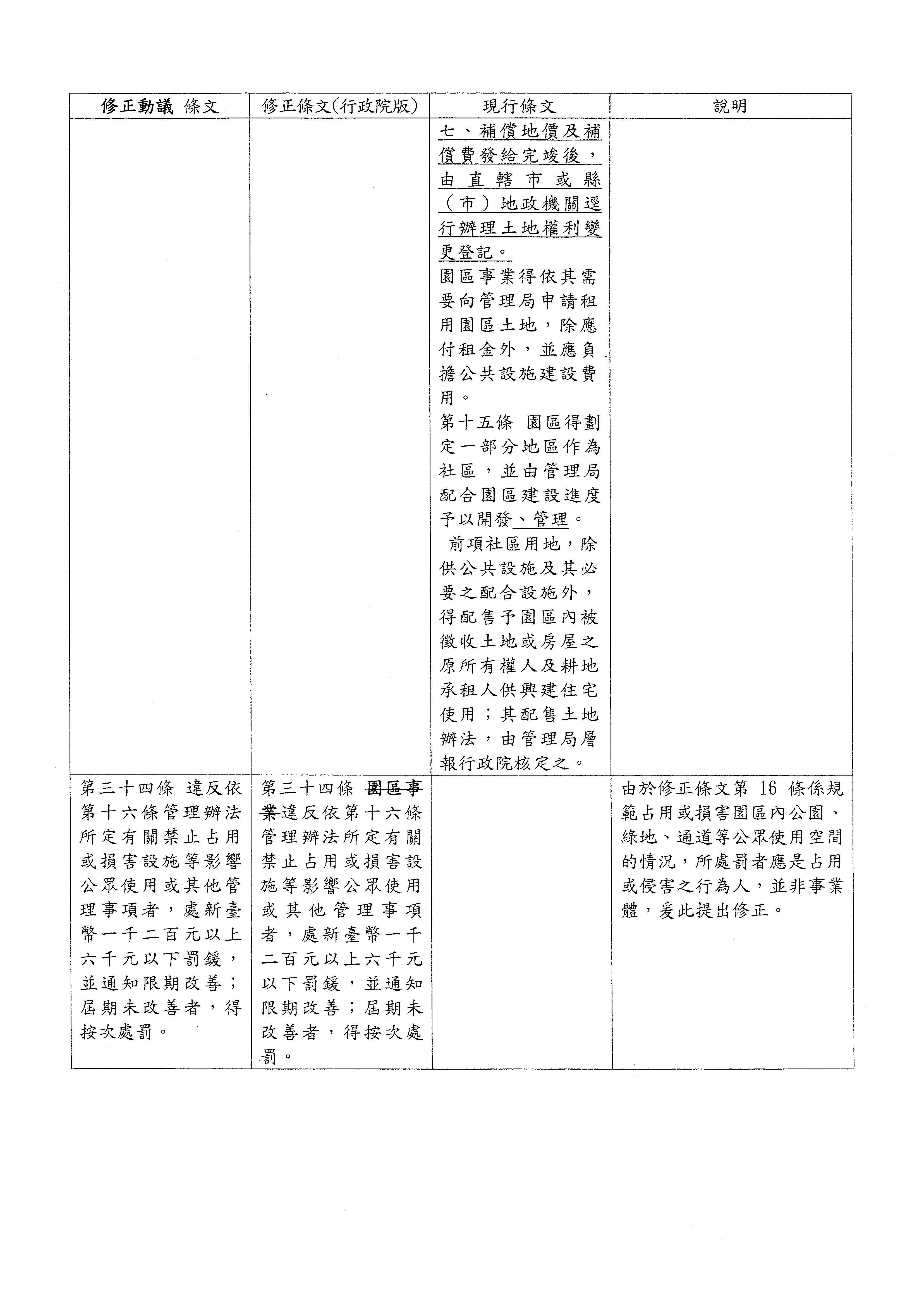 主席:所以我們就按照張廖萬堅委員的修正動議,把行政院版的「園區事業」4個字刪除,所以依行政院版修正後應該是「違反依第十六條管理辦法所定有關禁止占用或損害設施等影響公眾使用或其他管理事項者,處新臺幣一千二百元以上六千元以下罰鍰,並通知限期改善;屆期未改善者,得按次處罰。」,第三十四條照張廖萬堅委員的修正動議修正通過。