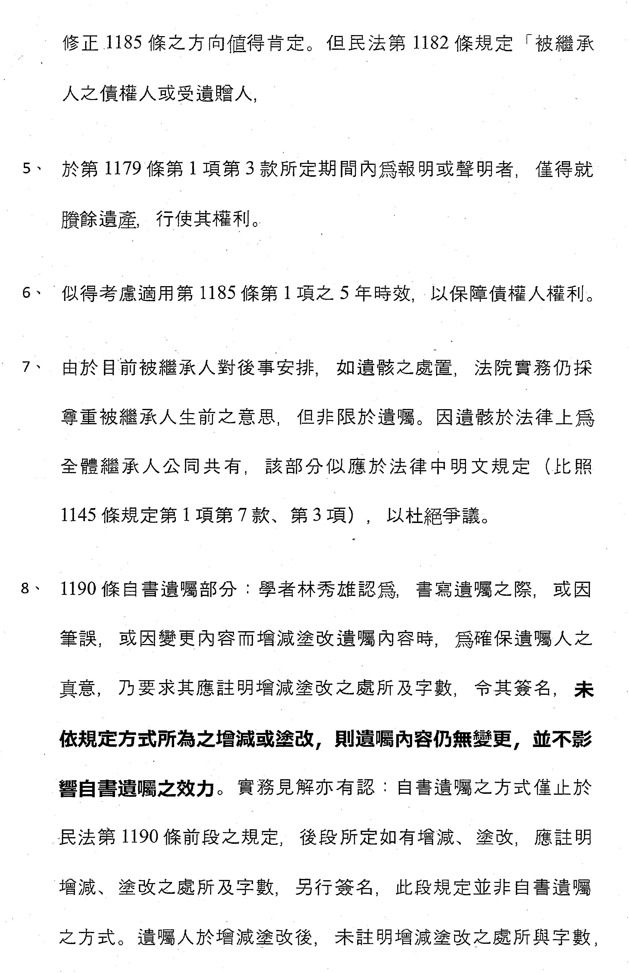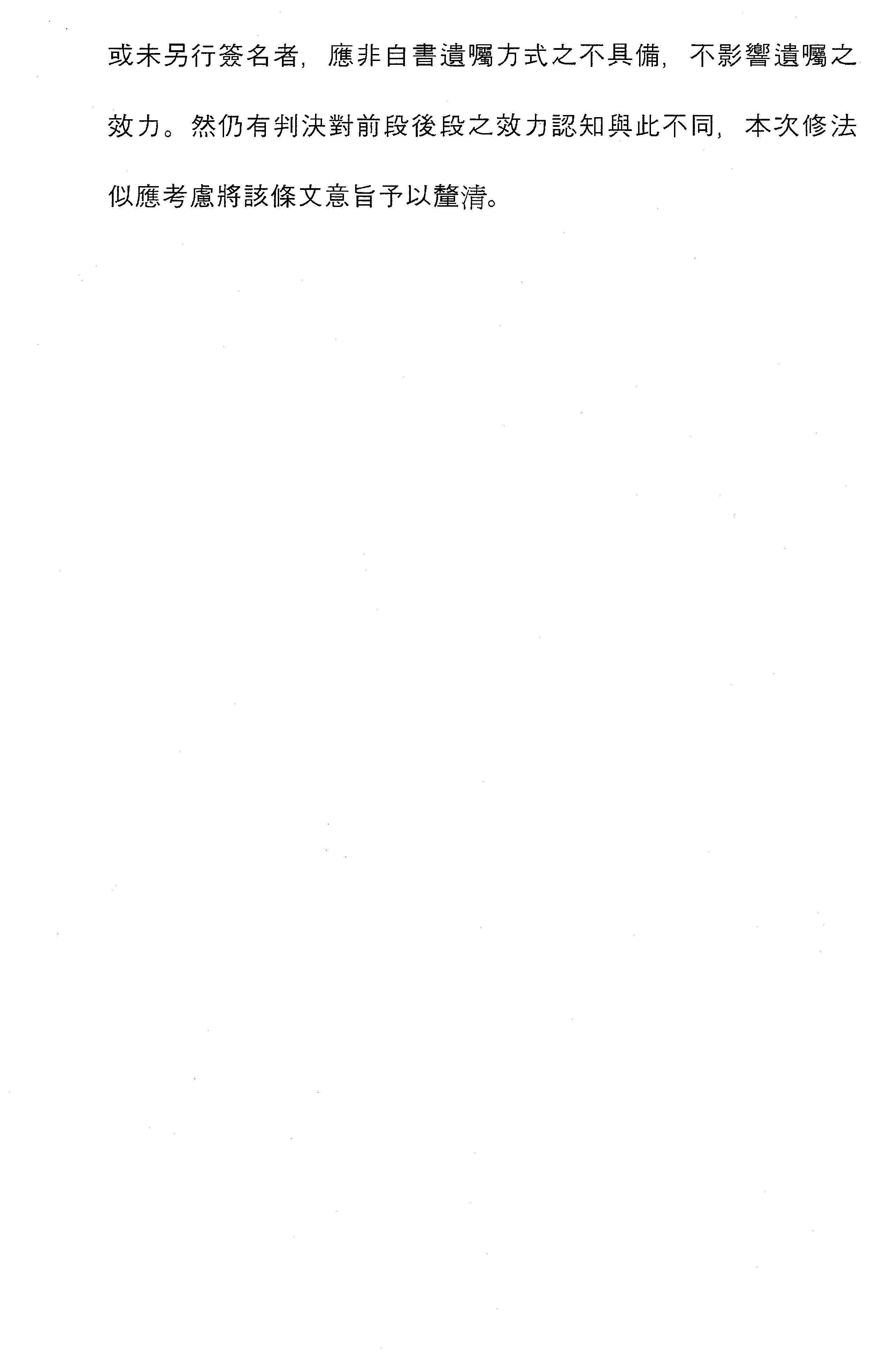 另外,我個人辦案也碰到一個經驗,就是子女對於父母親應該要土葬或火葬有爭執,在沒有遺囑的情況下,其實法院會尊重被繼承人生前的意思,但事實上這並沒有任何民法上的依據,因為遺骸其實是遺產,屬於繼承人公同共有,我覺得這部分似乎應該要在這個地方予以補充一下,免得將來引起無謂的爭議。第一千一百九十條自書遺囑的部分,因為前段和後段中間有個「;」,其實有些法院在適用時,認為後段的部分也是導致遺囑有沒有效力的一個要件,既然最高法院有過一些判決,也有一些實務見解剛好有相反的見解,有關遺囑修正的時候,增添字數如果字數不符,但沒有影響意思時,會不會影響遺囑的效力?這是一個非常瑣碎的問題,但是既然學者或最高法院見解認為前段才是遺囑有沒有效的構成要件的話,後面那個段落是不是應該在立法技術上稍微做一個區分,免得萬一有時候只是算錯字數,但是意思沒有變,就讓一個遺囑無效的話,這樣似乎有點可惜。