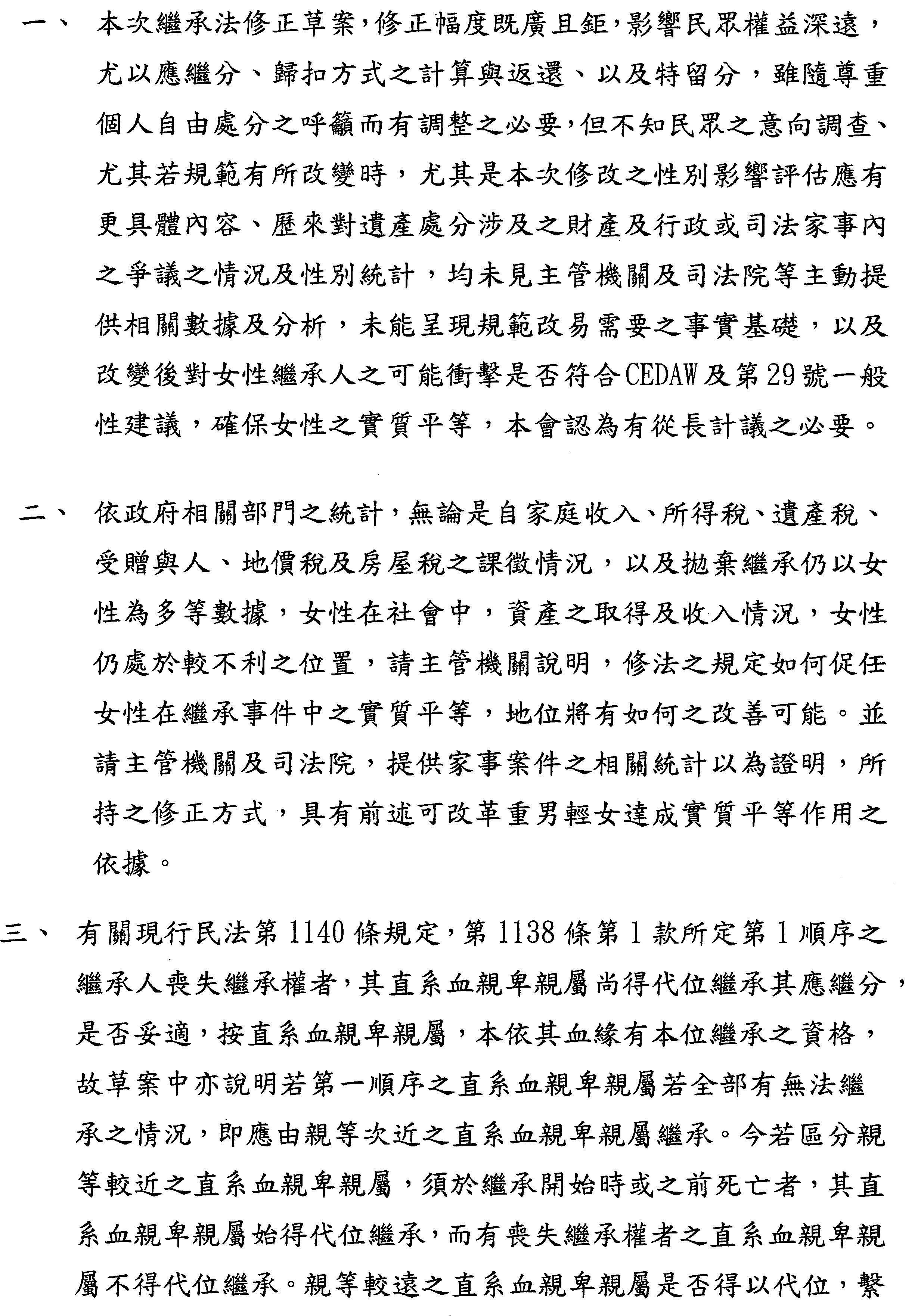另外剛剛有提到一些通案性的意見,我也做一些簡單的說明和報告,像剛剛主席提到為什麼現在還是很多女性拋棄繼承,而且認為這是應該的,我們在觀察上面也看了一些學者或做實證研究的學者專家,可以看出來我們法律上面看起來應該是性別平等的,但是因為在實務操作上可能因為觀念的關係,社會學上面的觀察可能是觀念的關係,或者我們宣導也有關係,可能還有一些跟宗祧祭祀也有關係,會覺得男性都在處理祭祀的部分,所以跟繼承也有一些關係,但是我覺得這樣的觀念其實在相關的數據上,像我們有報到委員會這邊來,我們也看到財政部的一些統計數字,像歷年拋棄繼承的人數其實有逐年降低,女性和男性的比例的差距有逐年降低的現象,所以我們也期待未來這些觀念的改變,慢慢地男女的繼承在社會的實踐上也可以達到性別平等的狀況,這是主席剛剛的提問。另外,在通案意見部分,秦秘書長有提到性別影響評估,因為我們在很久以前曾經將這個草案陳報行政院,但中間因為有一些徵詢意見的過程,我們陳報行政院時是有作性別影響評估,但是可能不像秦秘書長提到的那麼細膩,秦秘書長希望更為完整,而我們只是依照當時的規定,所以我們與秦秘書長的要求不同,我們是依照當時的規定所做的性別影響評估。